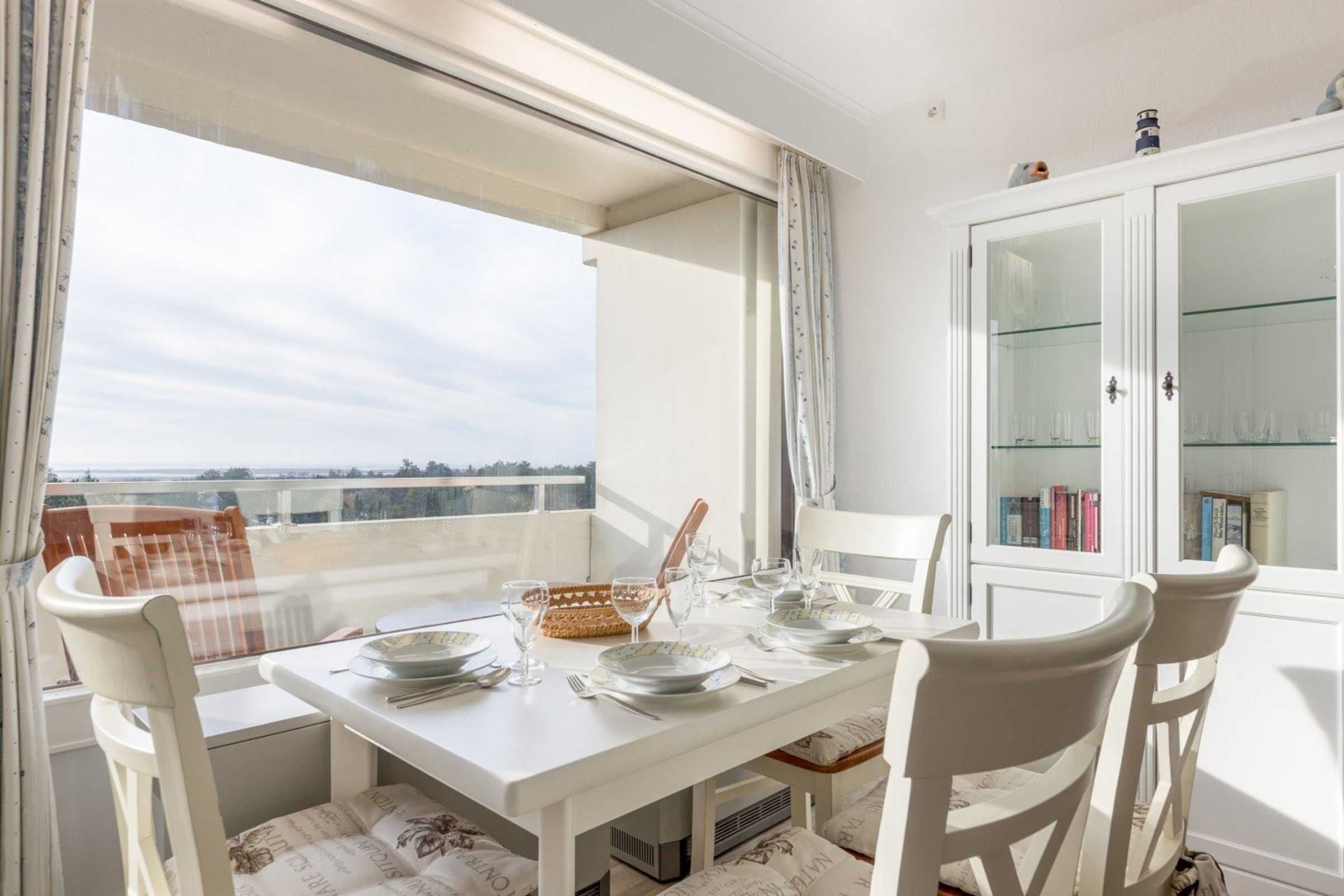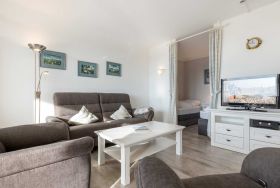 Schöne 2 1/2-Zimmer-Ferienwohnung im Haus Atlantic mit ca. 47 qm auf einer Ebene (6. OG, mit Fahrstuhl) für bis zu 4 Personen. In ruhiger Lage im Ortsteil Bad in St. Peter-Ording. Genießen Sie den herrlichen Ausblick auf's Meer.