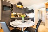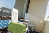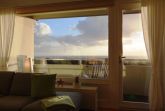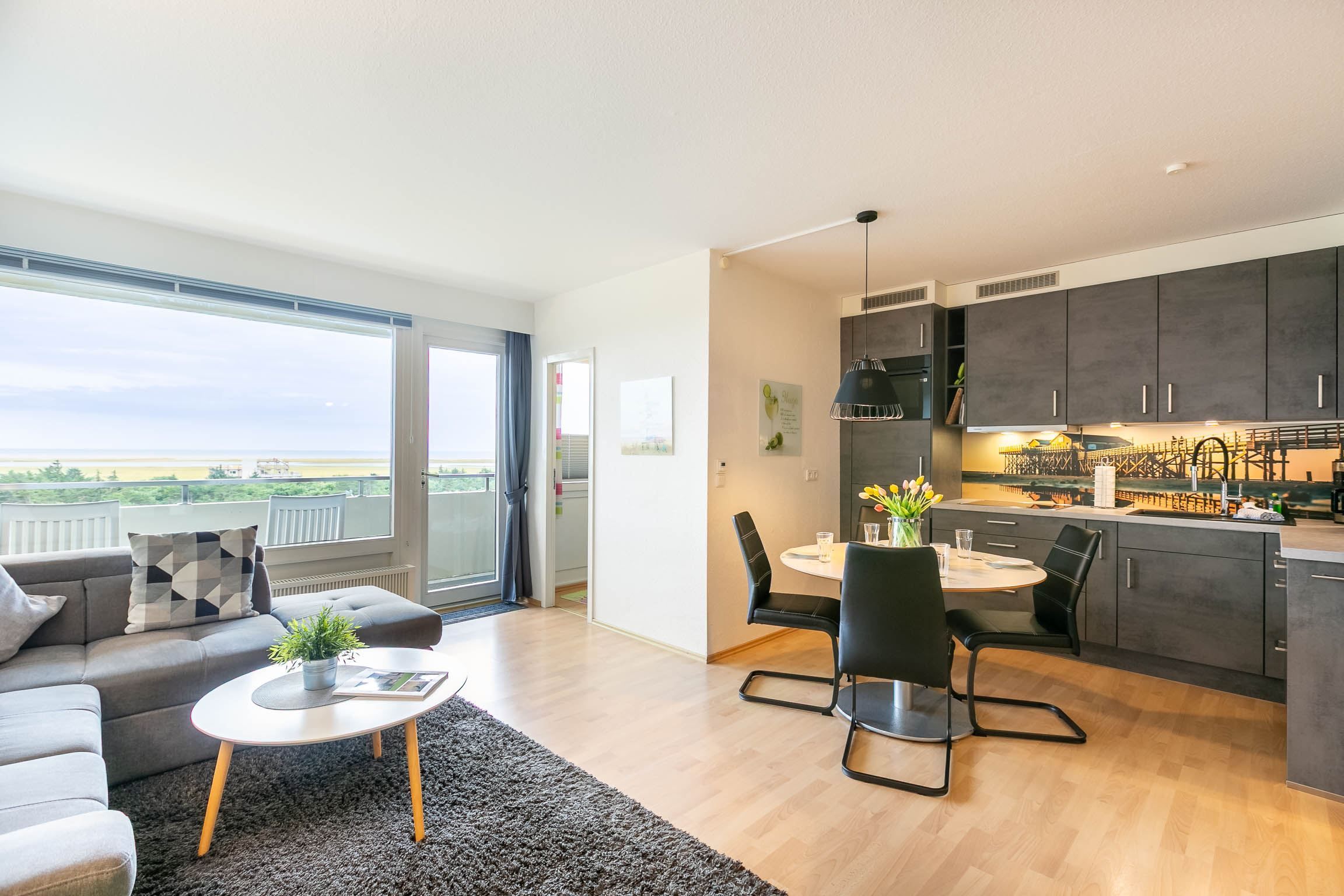 Wohnzimmer mit Ecksofa, sehr bequemem Ruhesessel, SMART-TV (Sat), Stereo-Kompaktanlage mit CD-Spieler und Esstisch mit 4 Stühlen. Direkter Zugang zum breiten, möblierten Balkon nach Südwesten. Einen Ort mit besserem Ausblick auf Nordsee, Strand und Sonnenuntergang werden Sie in St. Peter-Ording wahrscheinlich nicht finden. Offene Küche mit Backofen, Mikrowelle, Geschirrspüler und Kühl-Gefrier-Kombination.