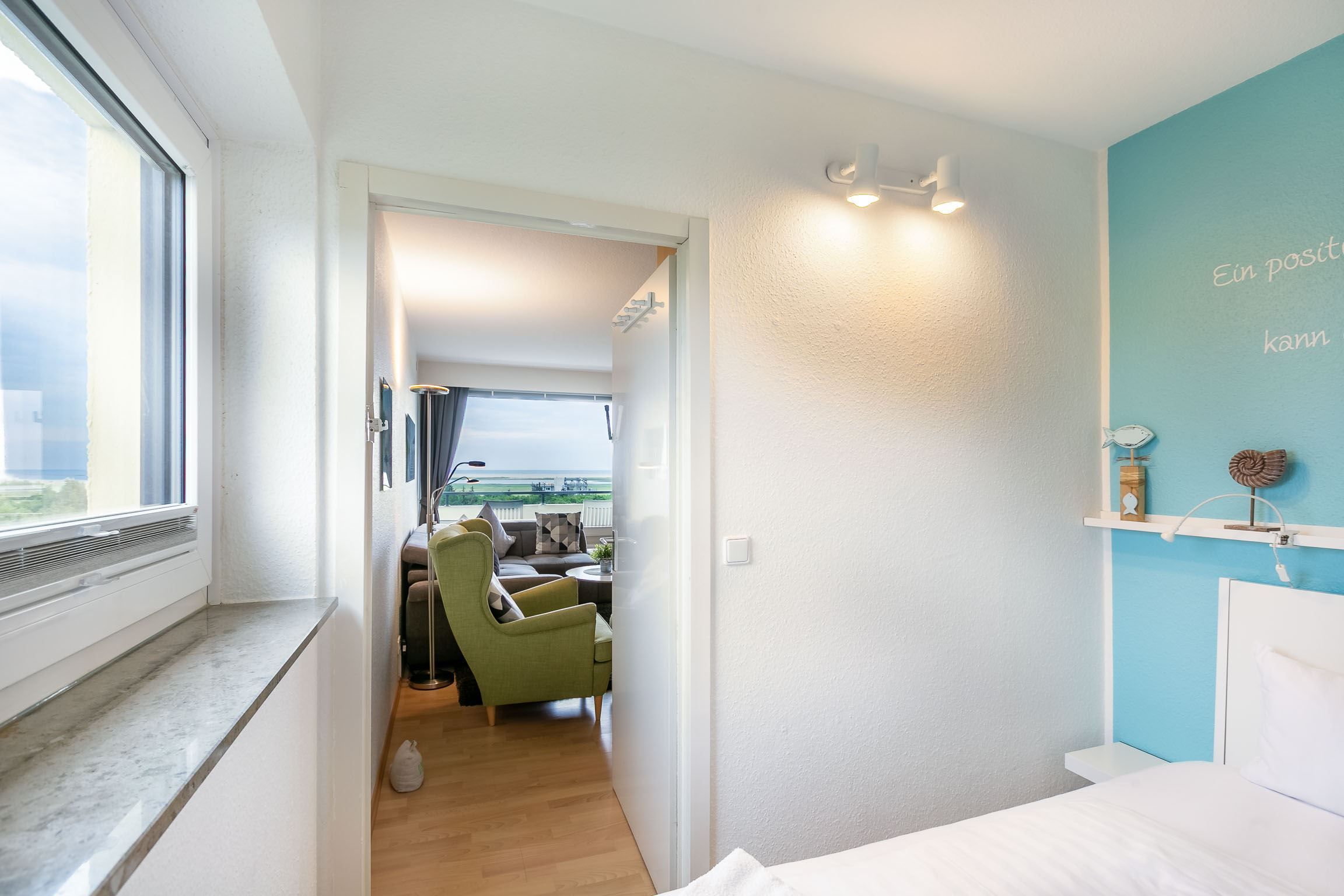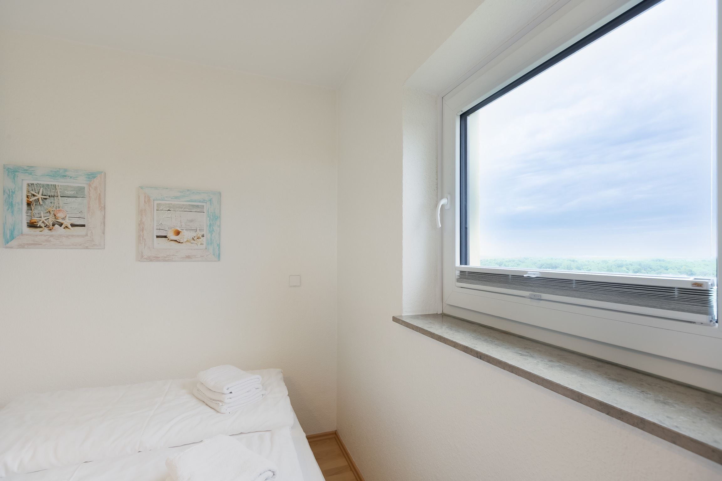 2. Schlafzimmer mit 2 Etagen-Einzelbetten (je 80x190cm), Kleiderschrank und phänomenalem Nordseeblick.