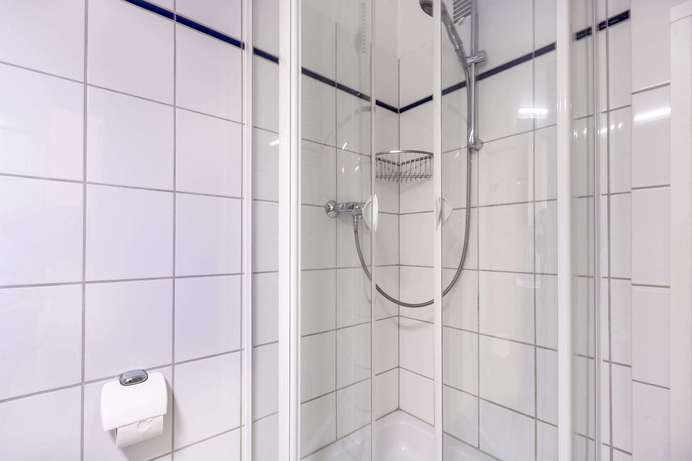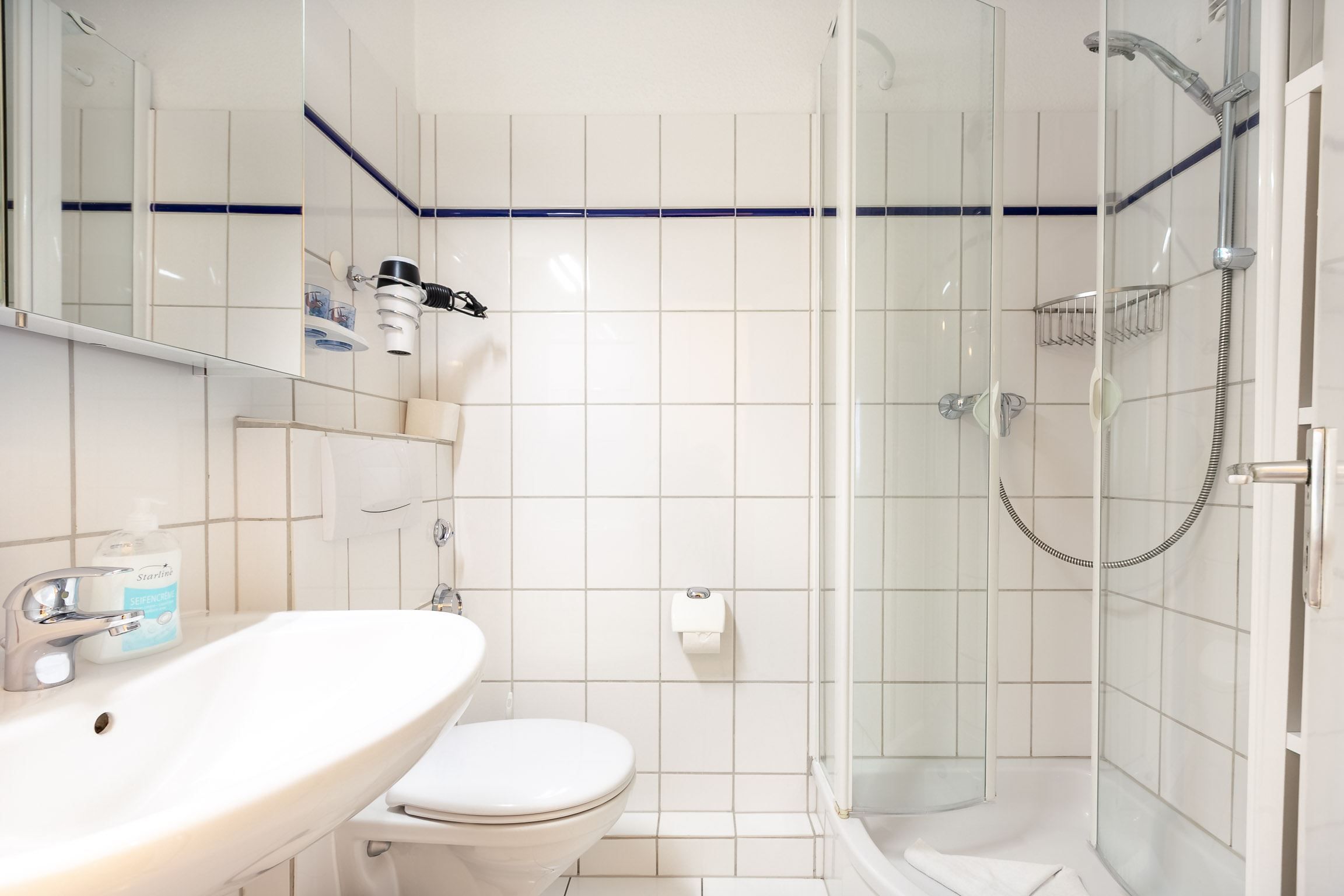 Badezimmer (Duschbad) mit Dusche, WC, Föhn und Handtuchwärmer.