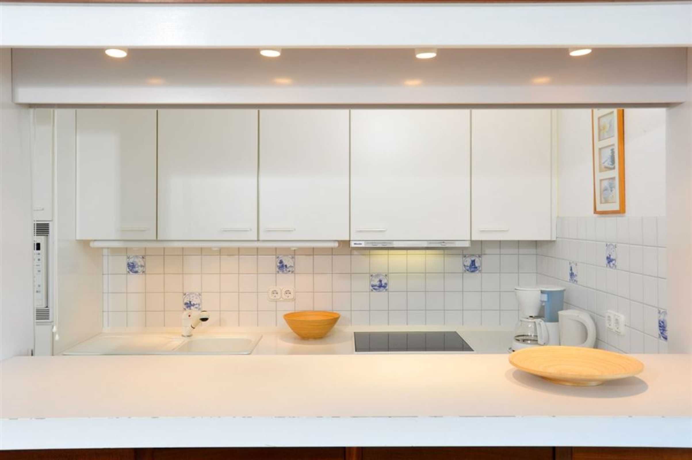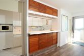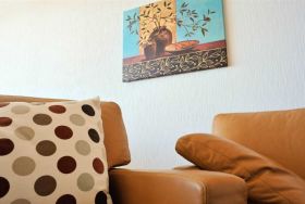 Wohnzimmer mit Sofa für 2 Personen, 2 Sesseln, TV (Sat), Stereo-Kompaktanlage, Sony PlayStation 2 und Esstisch mit 4 Stühlen. Direkter Zugang zum möblierten Balkon nach Südwesten mit wunderschönem Meerblick. Offene Küche mit Backofen, Mikrowelle, Kühlschrank mit Gefrierfach, Geschirrspüler und Tresen zum Wohnbereich.
