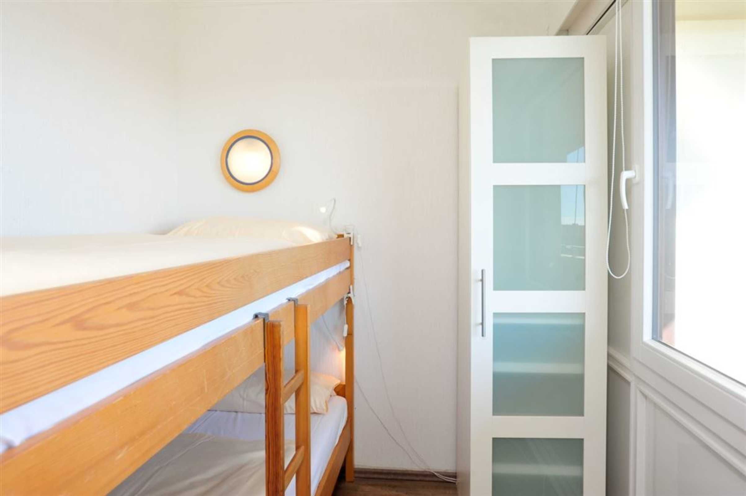 2. Schlafzimmer mit 2 Etagen-Einzelbetten (je 90x200cm), Kleiderschrank und Meerblick. Durch eine Schiebetür abgetrennt.