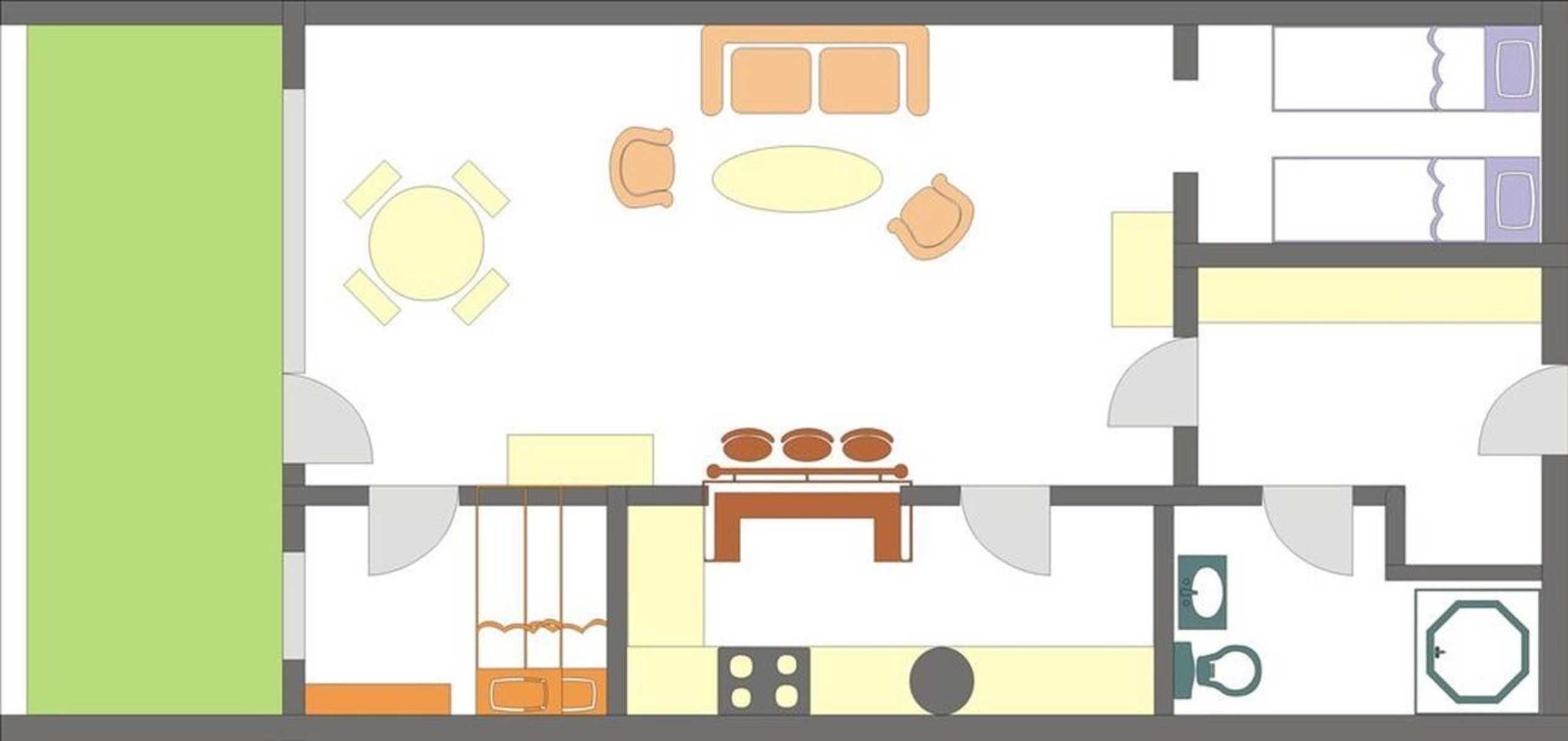 1. Schlafzimmer mit 2 Einzelbetten (je 90x200cm). Dieses Schlafzimmer ist durch einen Vorhang vom Wohnzimmer abgeteilt.