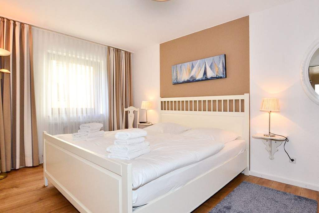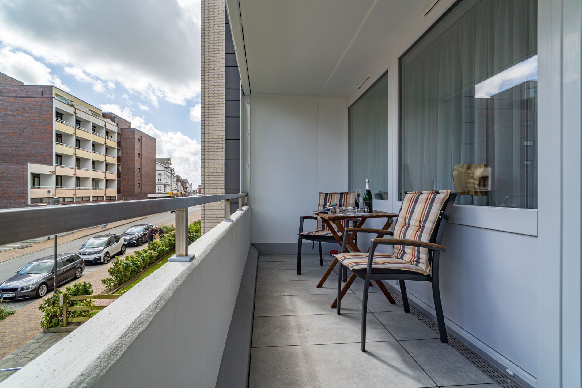 3-Zimmer-Nichtraucher-Ferienwohnung (ca. 63 qm) in der 1. Etage zur Landseite mit Ostloggia (Morgensonne, mit Balkonmöbeln und Auflagen) für max. 3 Personen.