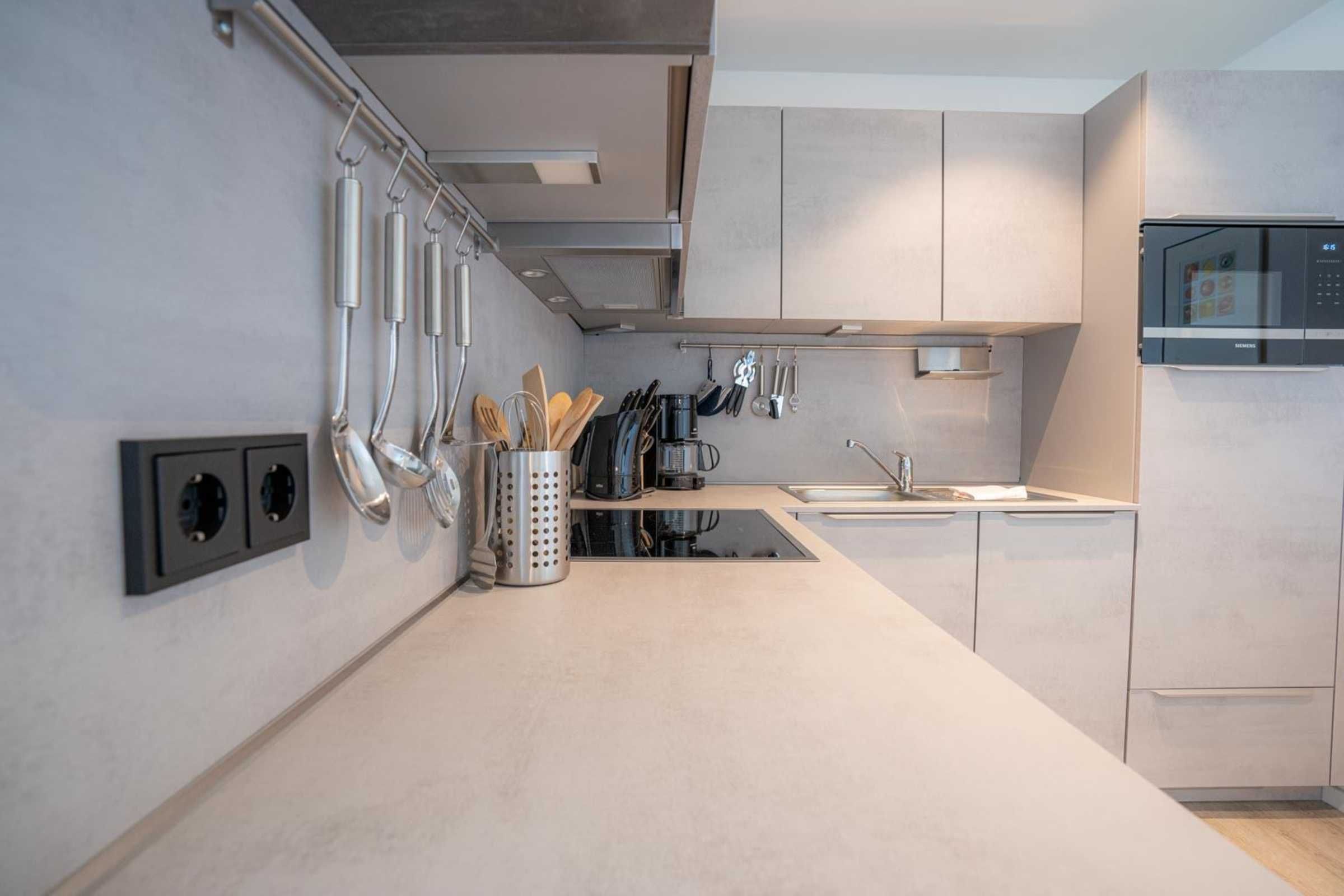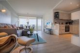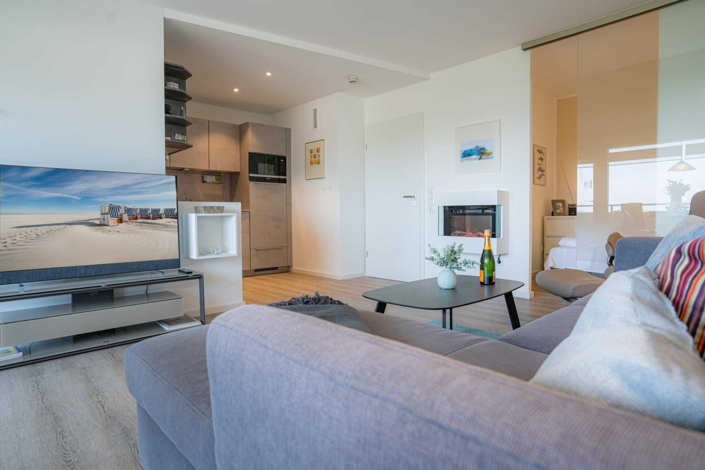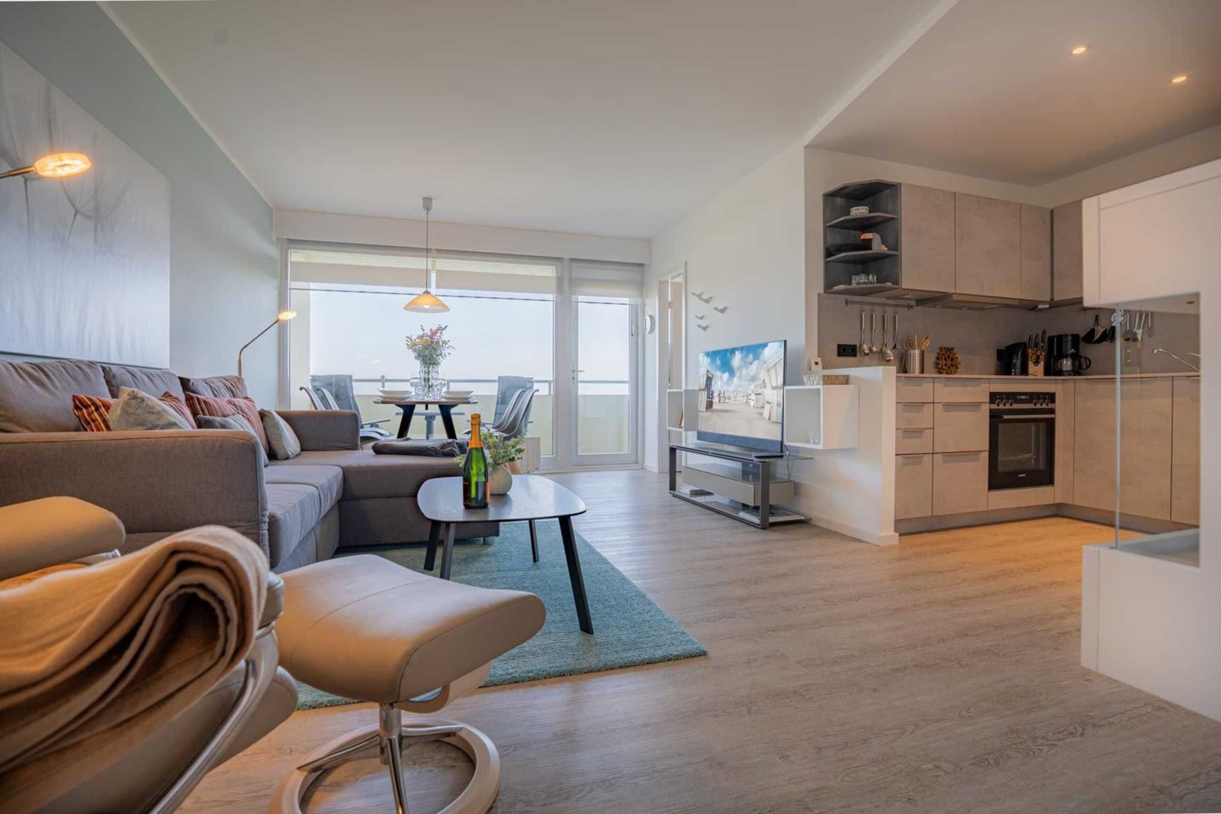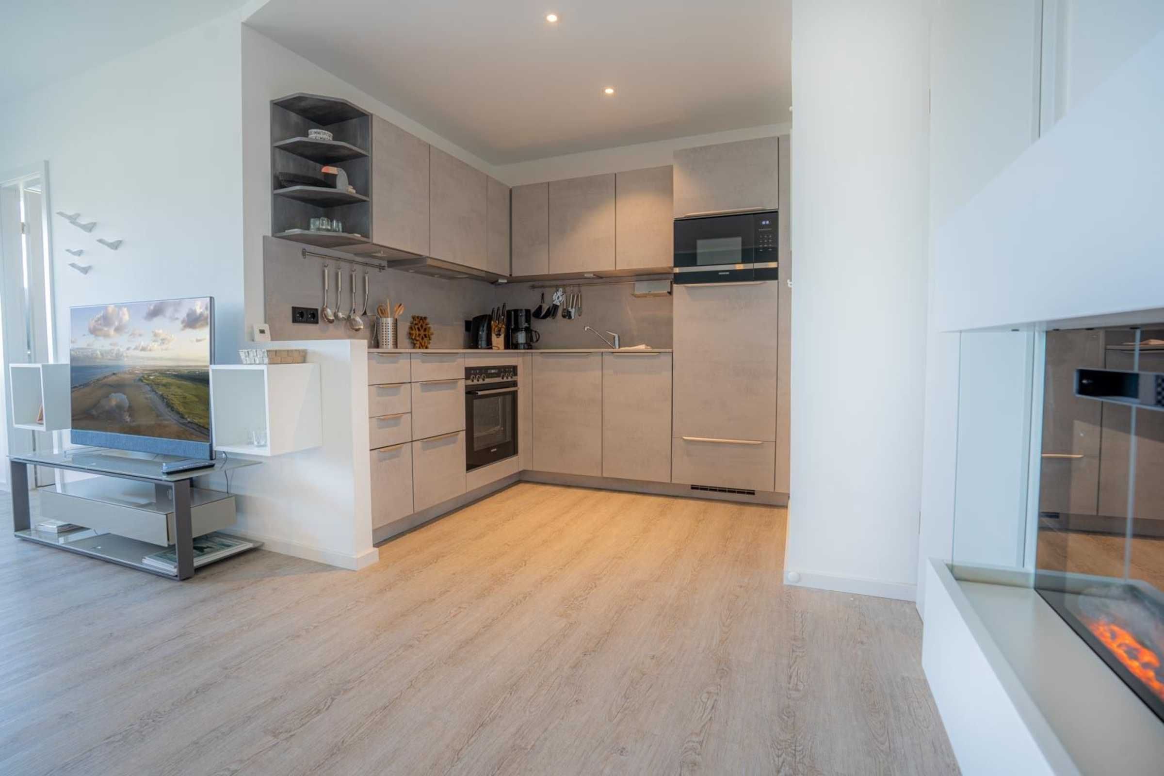 Wohnzimmer mit Ecksofa, Relax-Sessel, Elektro-Kamin mit Heizgebläse, Essplatz für 4 Personen, großes SMART-TV (Sat, SKY-Abo) und Radio. Direkter Zugang zum möblierten Balkon nach Südosten. Offene Küche mit Induktionsherd, Backofen, Mikrowelle, Geschirrspüler und Kühlschrank mit Gefrierfach.