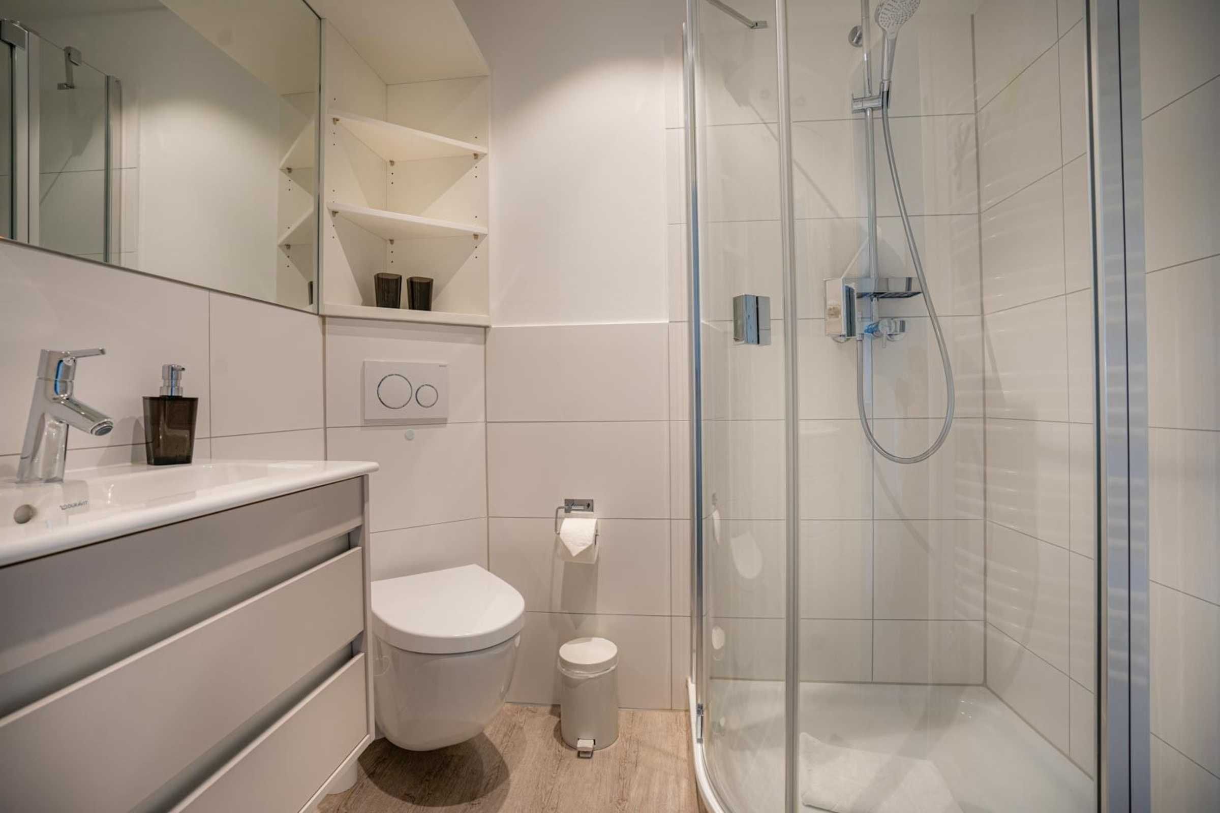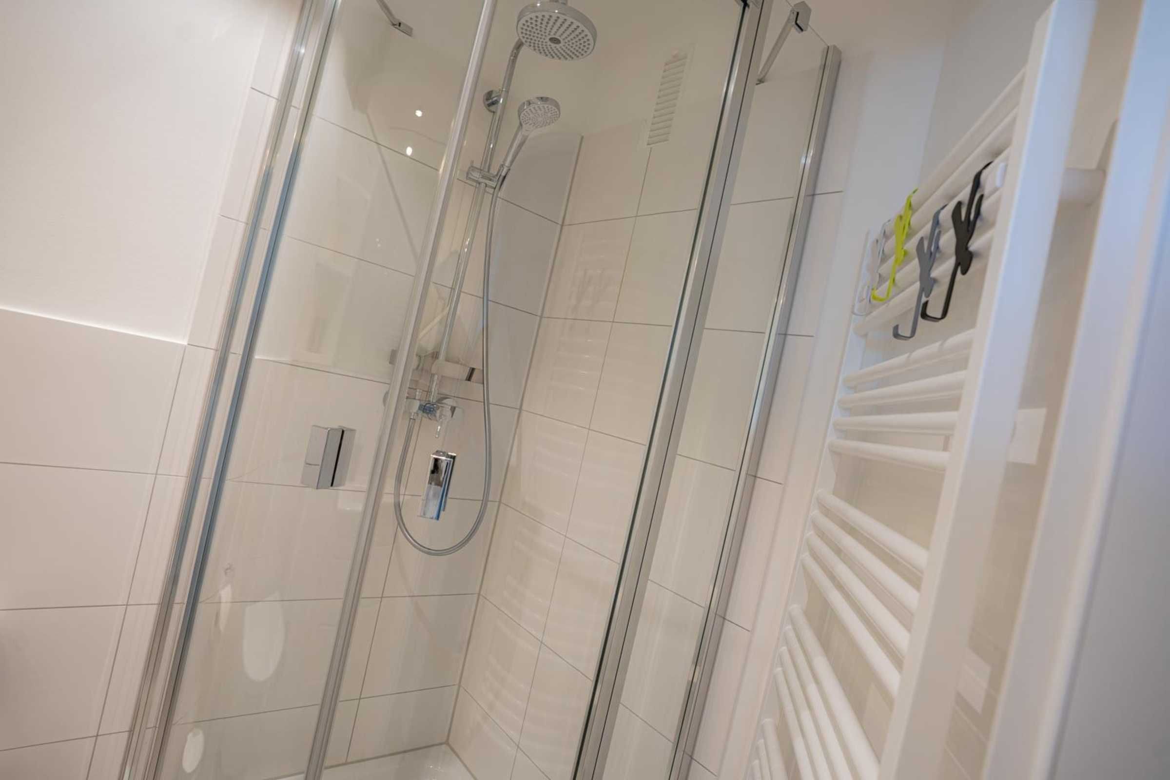 Badezimmer (Duschbad) mit Dusche, WC, Handtuchwärmer und Föhn.