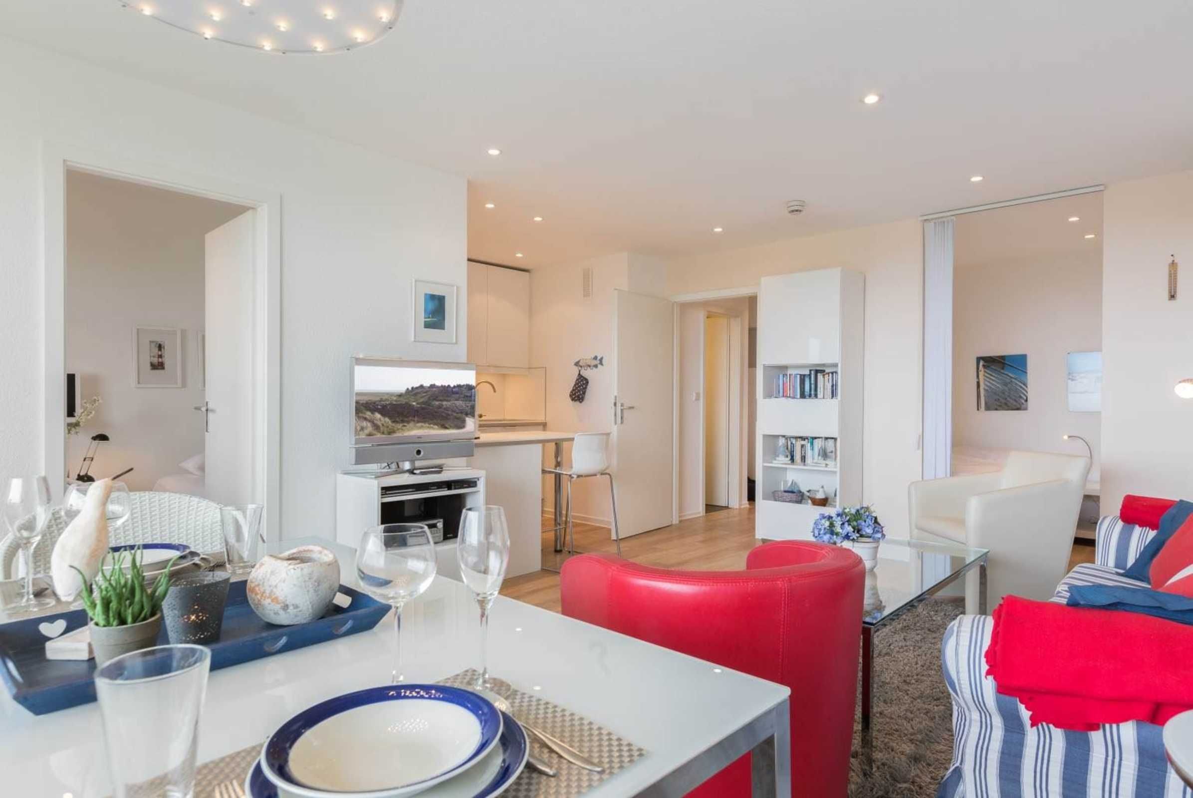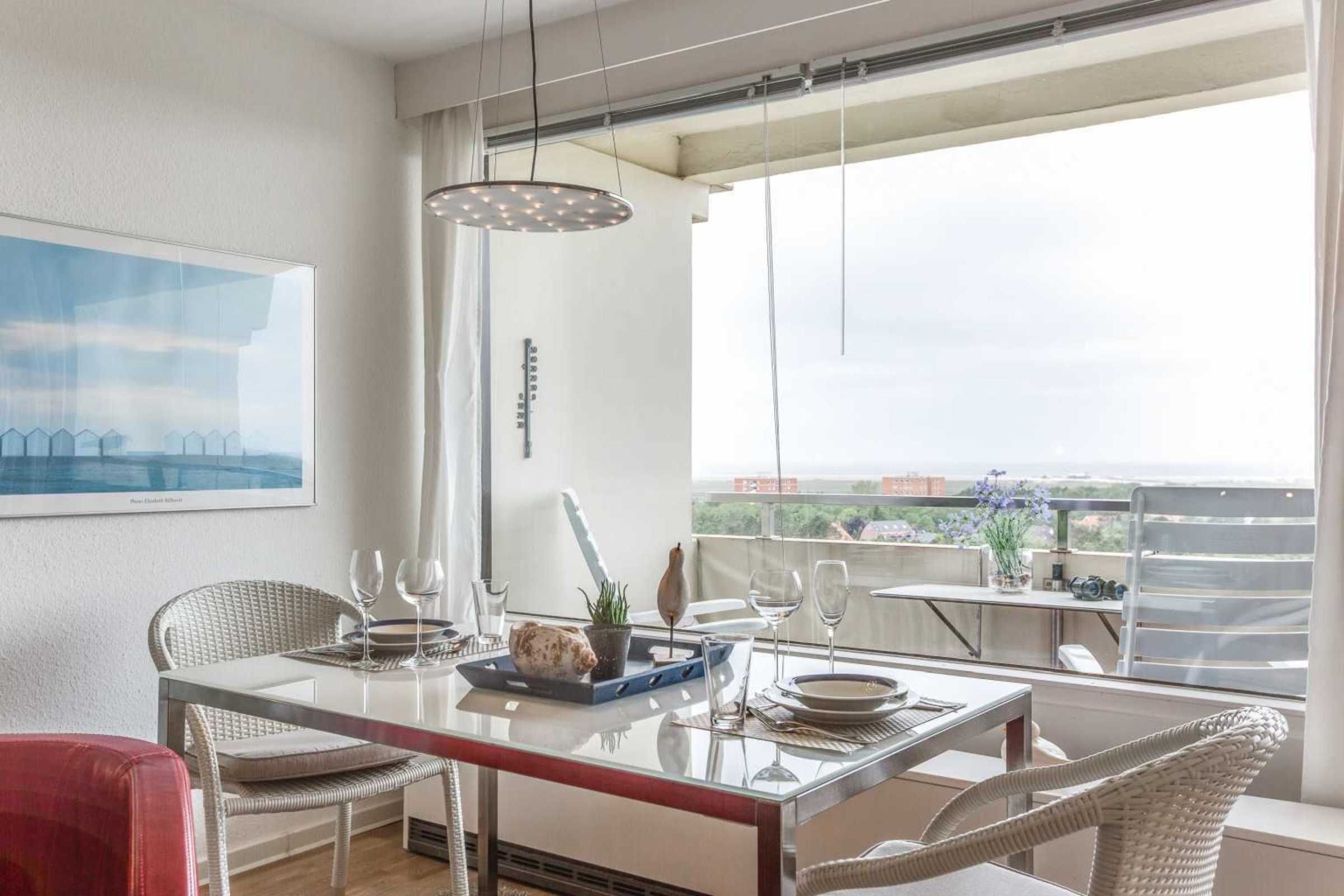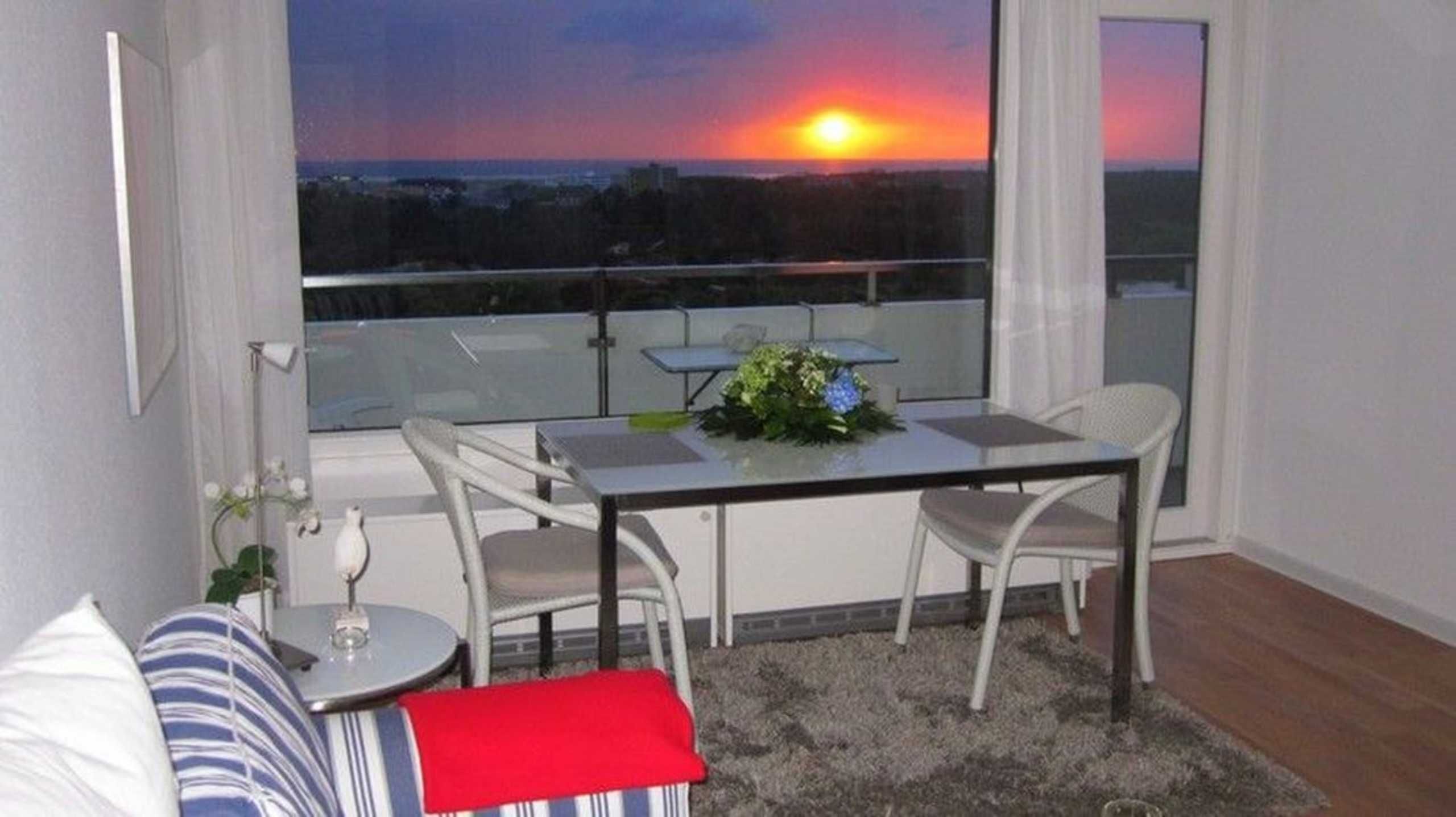 Elegant modernisierte 2 1/2-Zimmer-Ferienwohnung Sundowner im Haus Atlantic mit ca. 47 qm auf 1 Ebene (12. OG, mit Fahrstuhl) für bis zu 3 Personen. In strandnaher Lage im Ortsteil Bad in St. Peter-Ording. Genießen Sie den vielleicht schönsten Ausblick in ganz St. Peter-Ording - bis weit über die Nordsee.