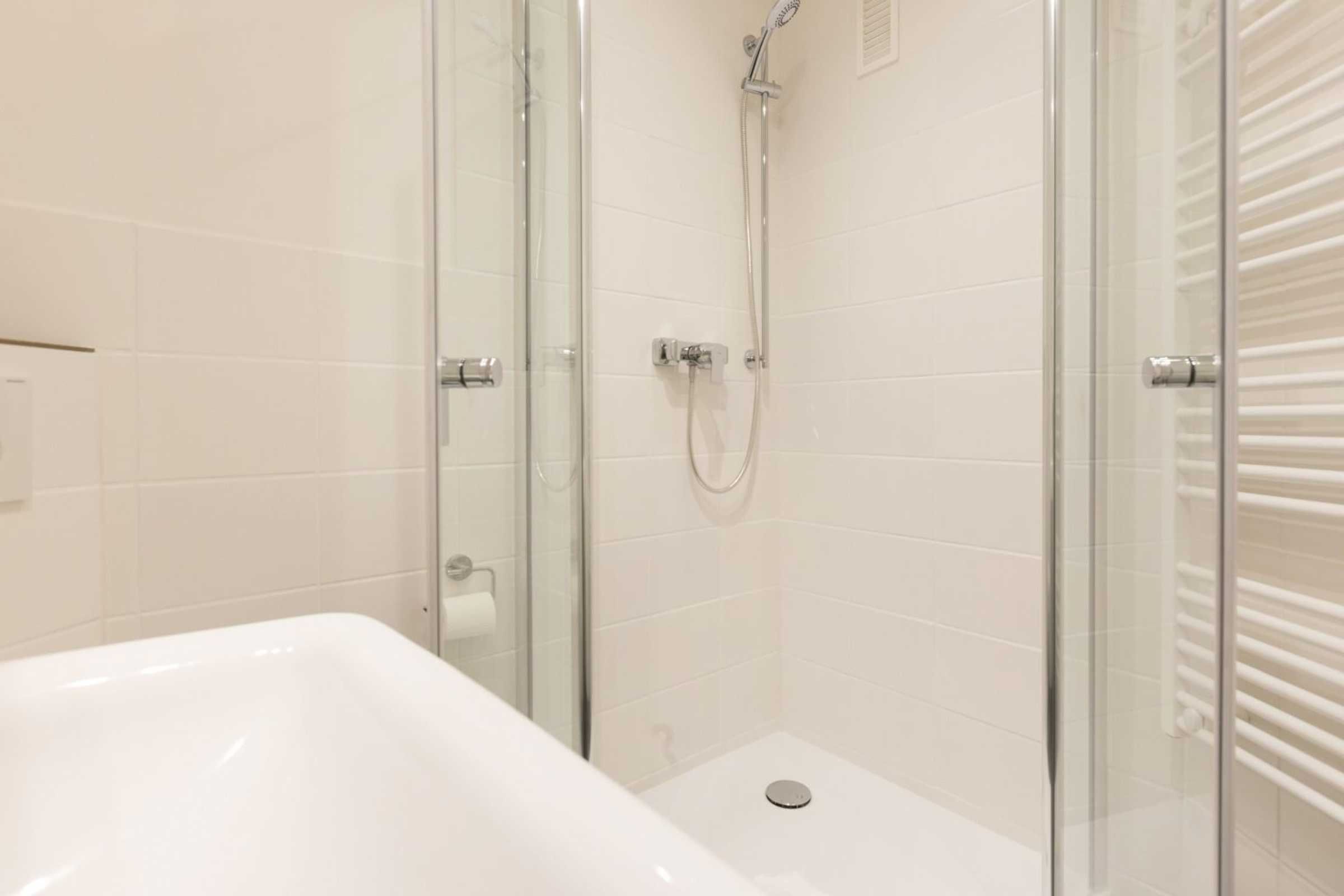Badezimmer (Duschbad) mit Dusche, WC, Handtuchwärmer und Föhn.