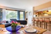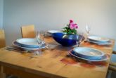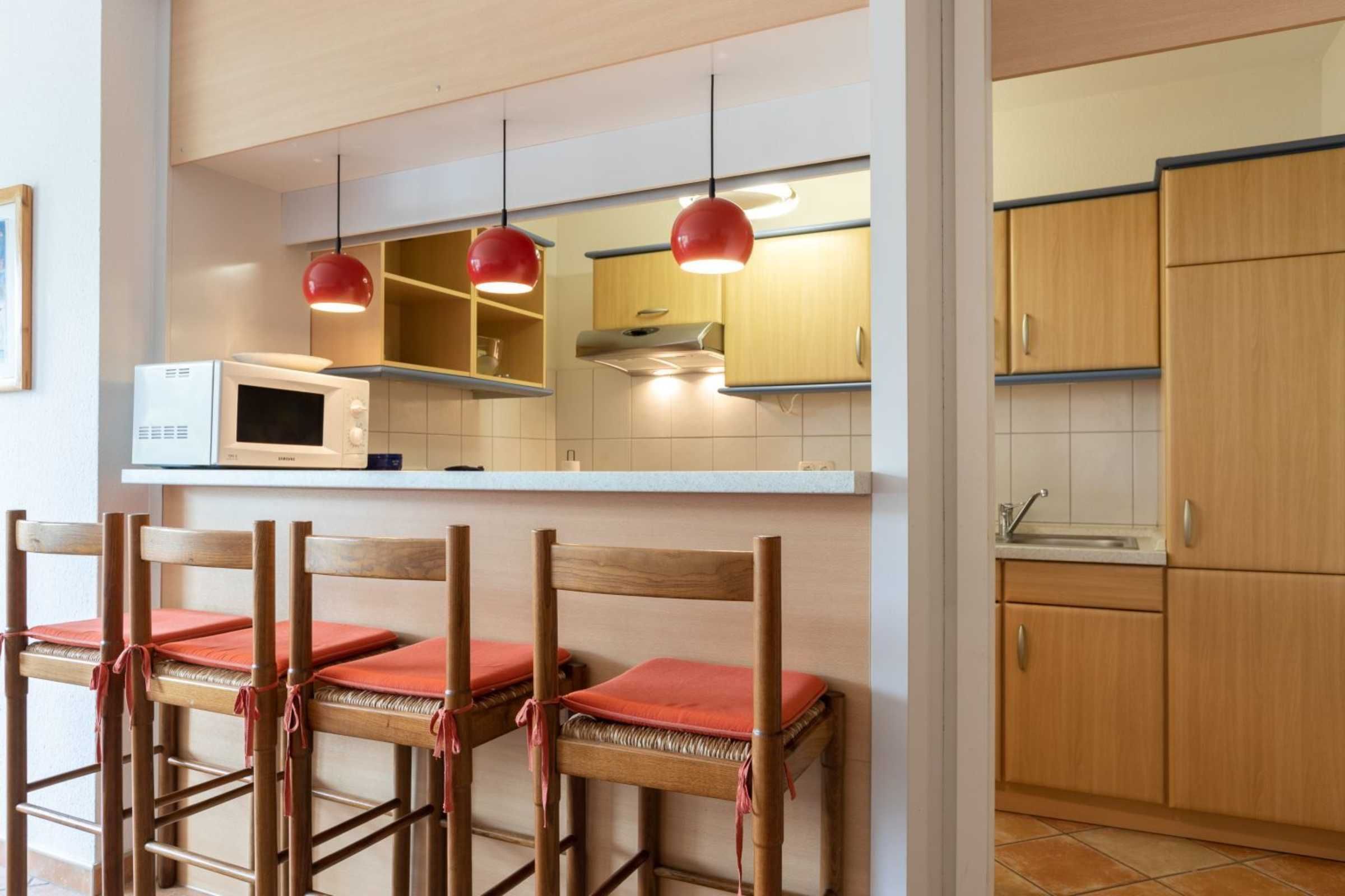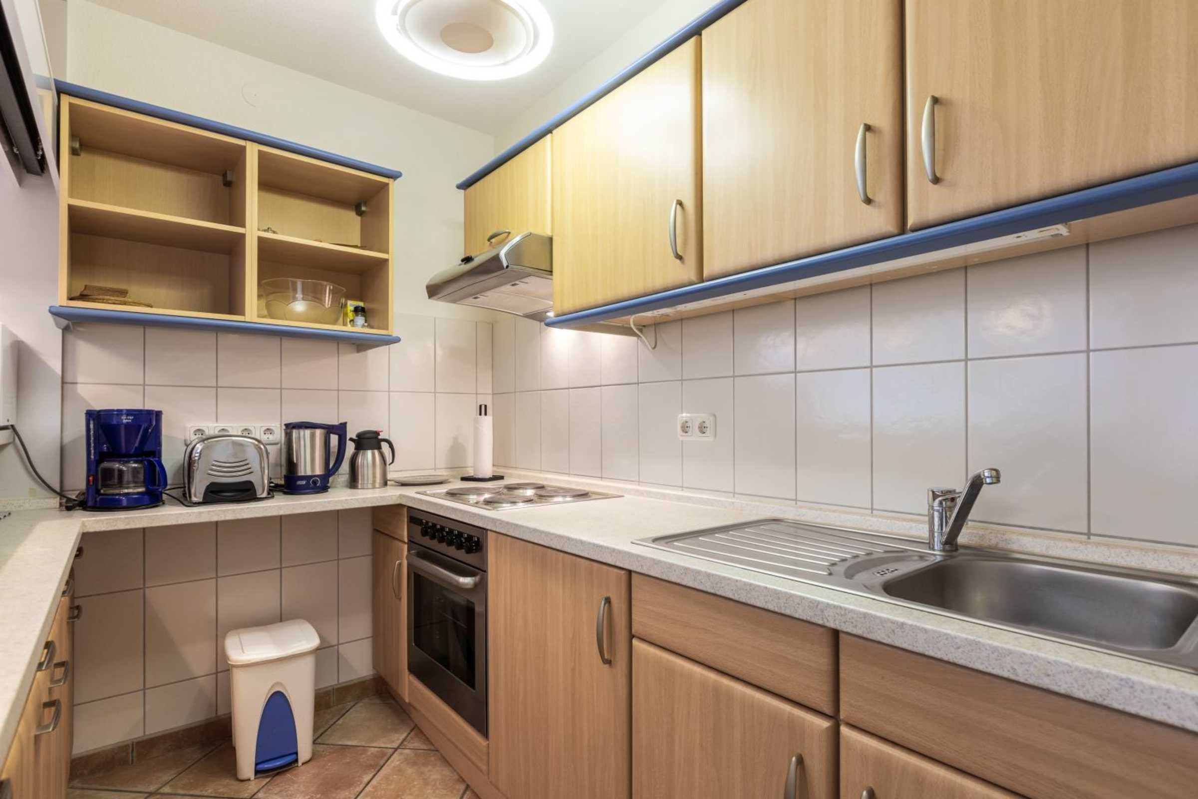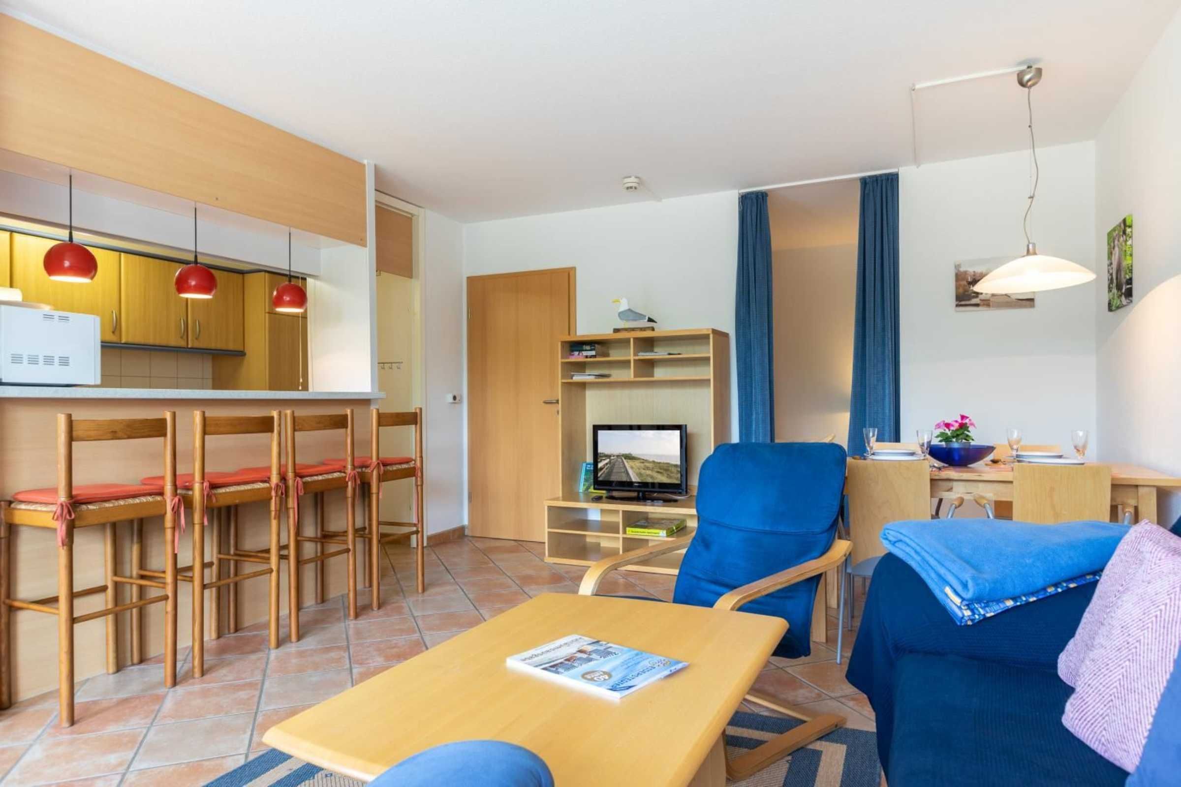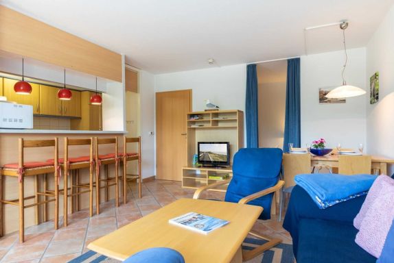 Wohnzimmer mit Sofa für 3 Personen, 2 Sesseln, TV (Sat) und Esstisch mit 4 Stühlen. Direkter Zugang zum möblierten Balkon nach Westen mit herrlichem Ausblick über den Wald. Halboffene Küche mit Backofen, Kühlschrank mit Gefrierfach, Mikrowelle, Haushaltsschrank mit Staubsauger und Tresen zum Wohnbereich mit 4 Barstühlen.