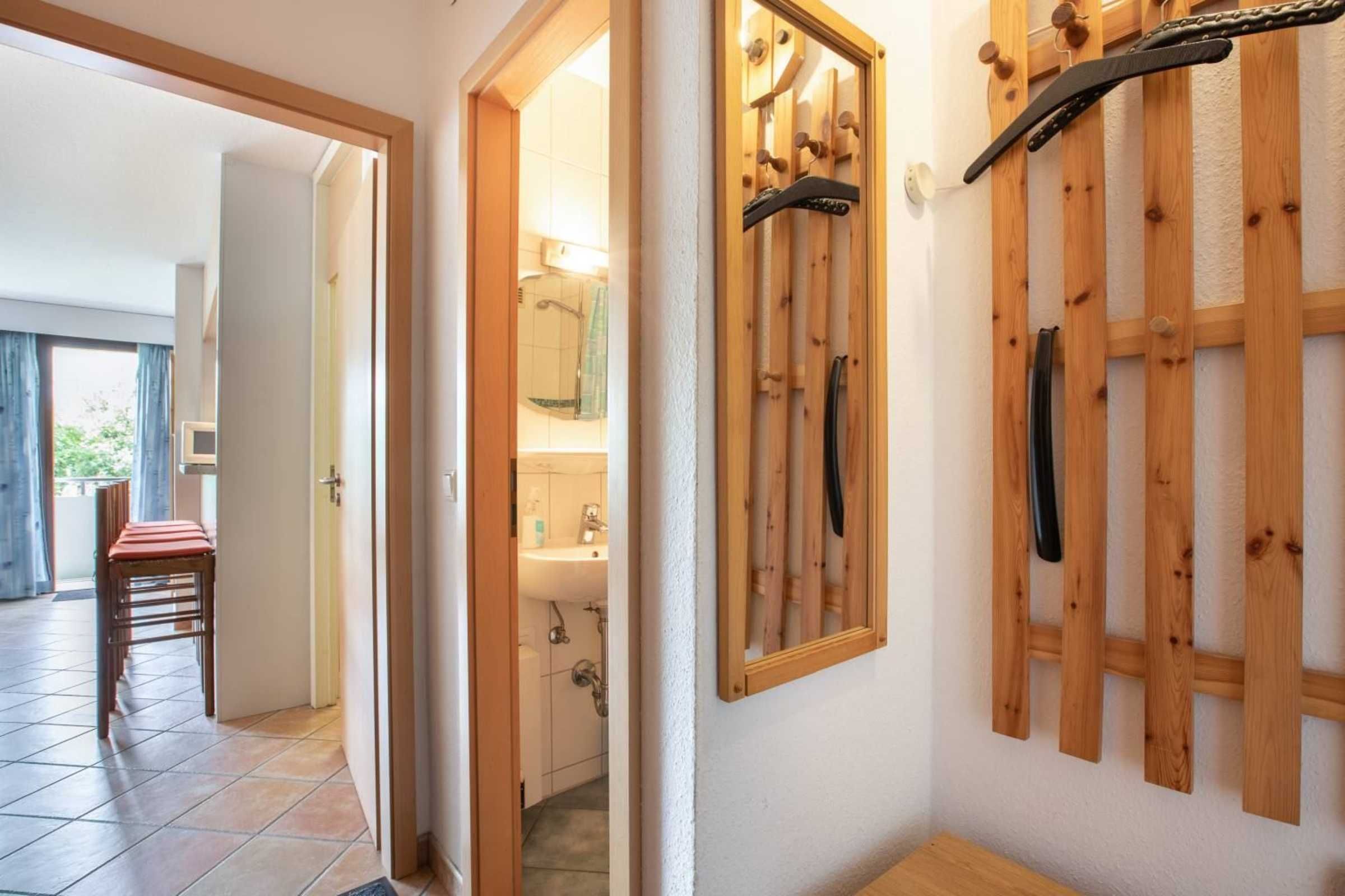Flur mit Garderobe, Spiegel, Sitzbank und großer Schrankwand.