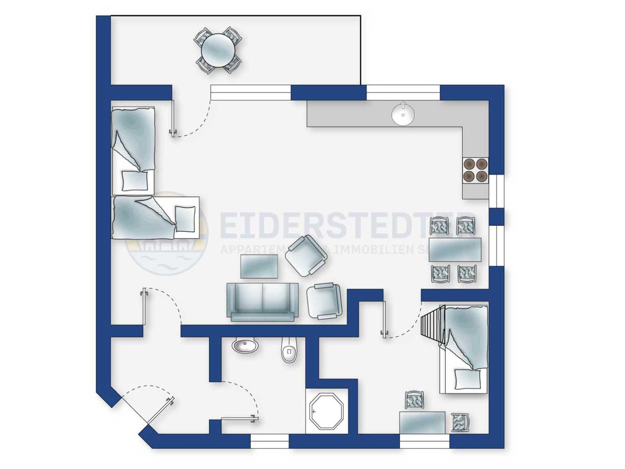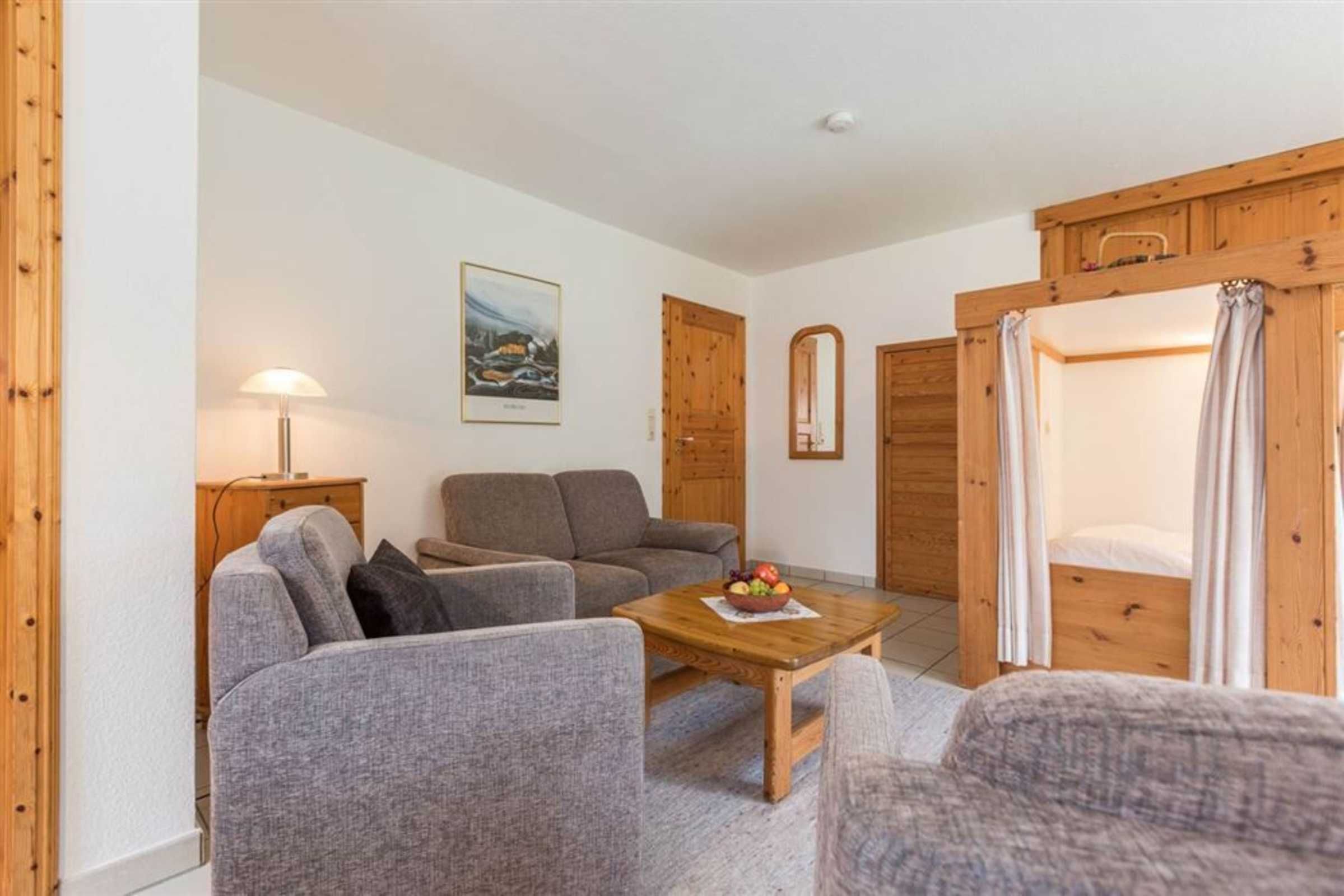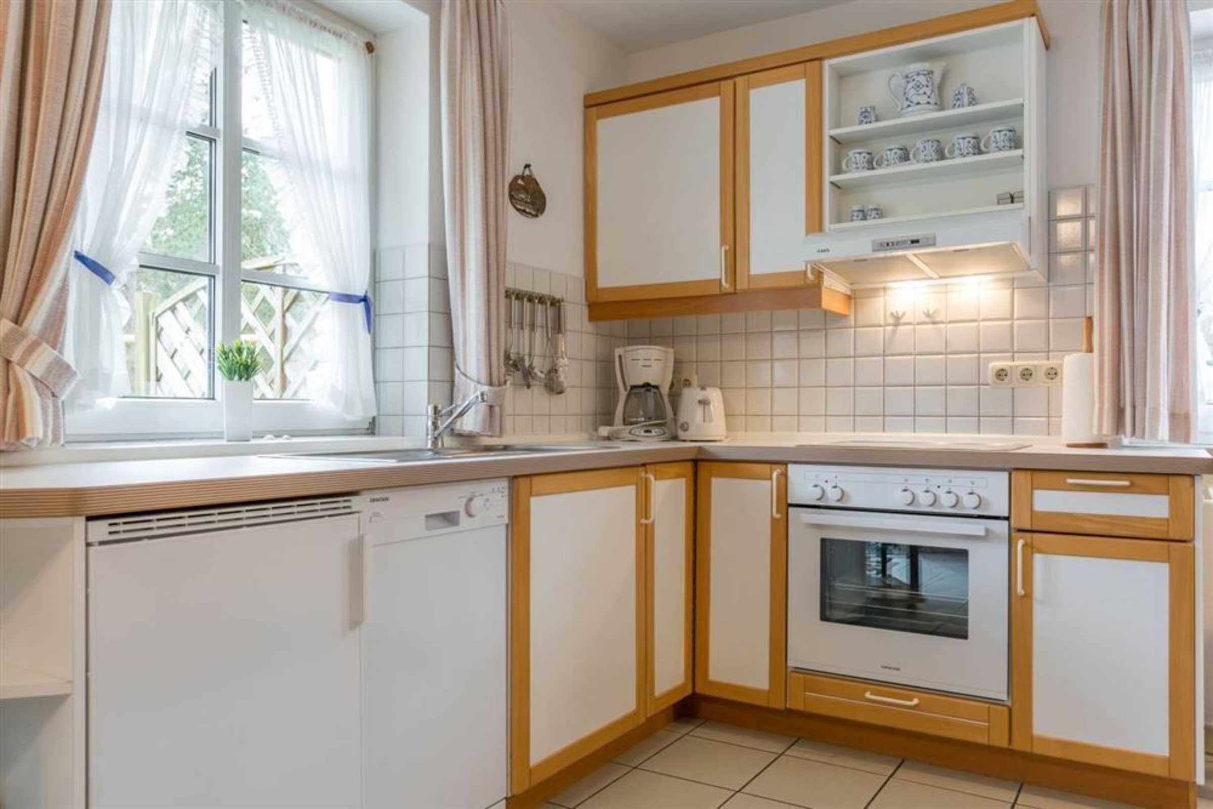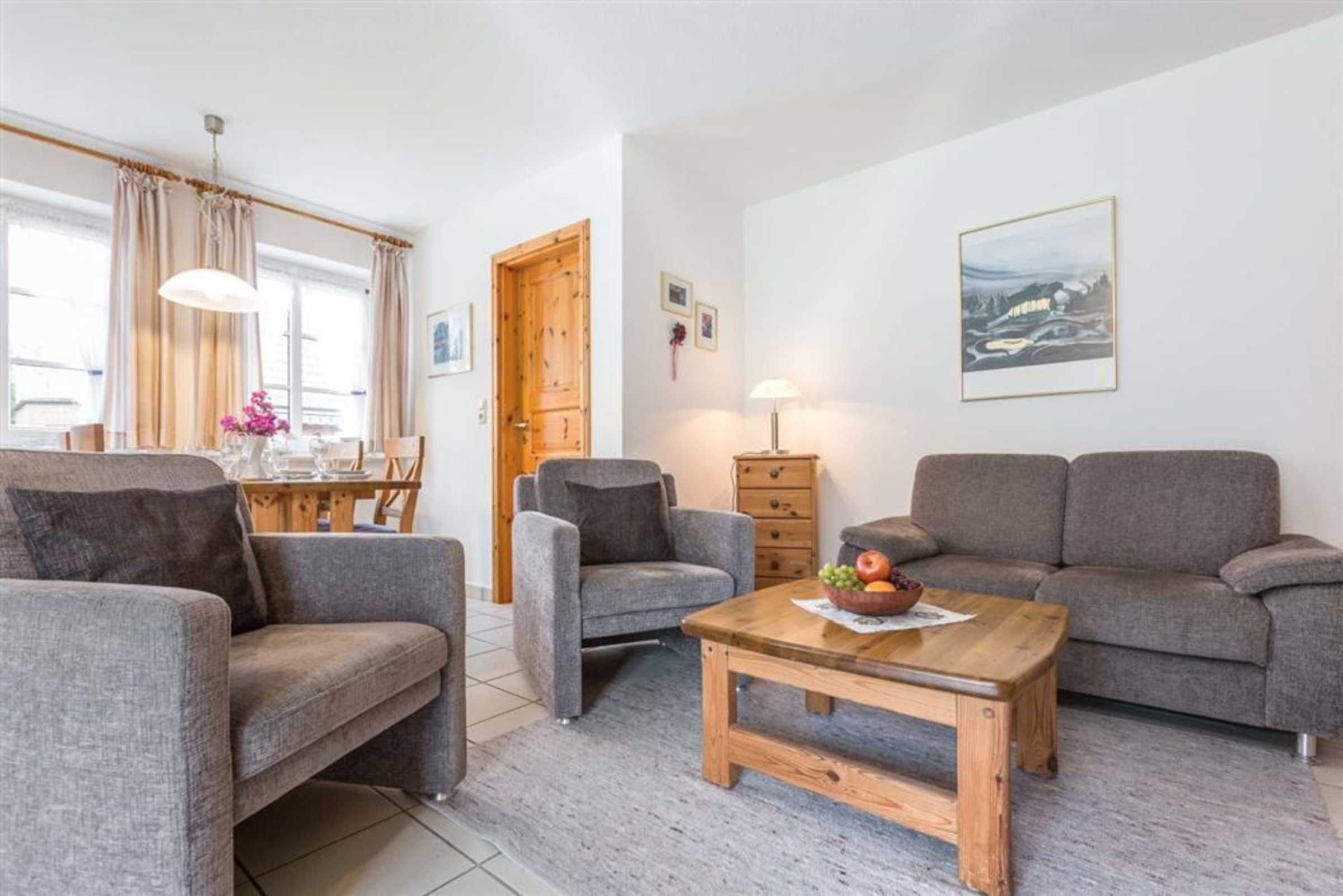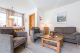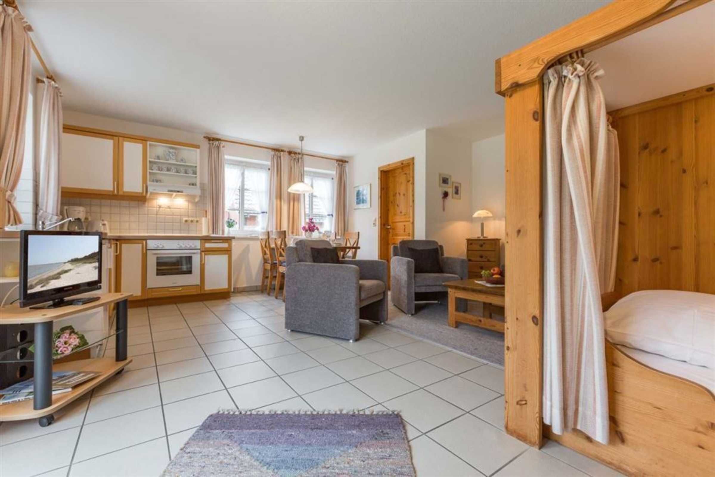 Wohnzimmer mit Sofa für 2 Personen, 2 Sesseln, TV (Kabel), Esstisch mit 4 Stühlen und 2 Einzelbetten (je 90x200cm) im nordirschen Alkovenstil. Abstellraum mit Haushaltsgeräten. Direkter Zugang zur möblierten Gartenterrasse nach Südwesten. Offene Küche mit Backofen, Mikrowelle, Geschirrspüler und Kühlschrank mit Gefrierfach.
