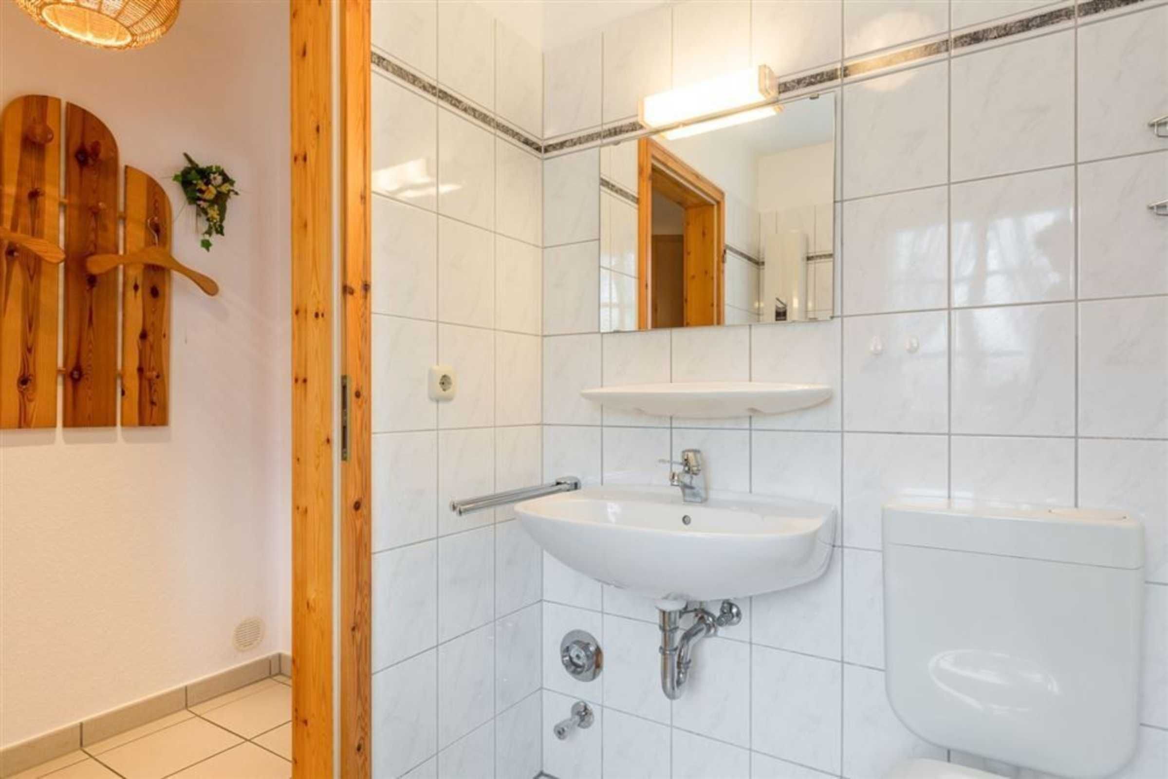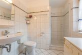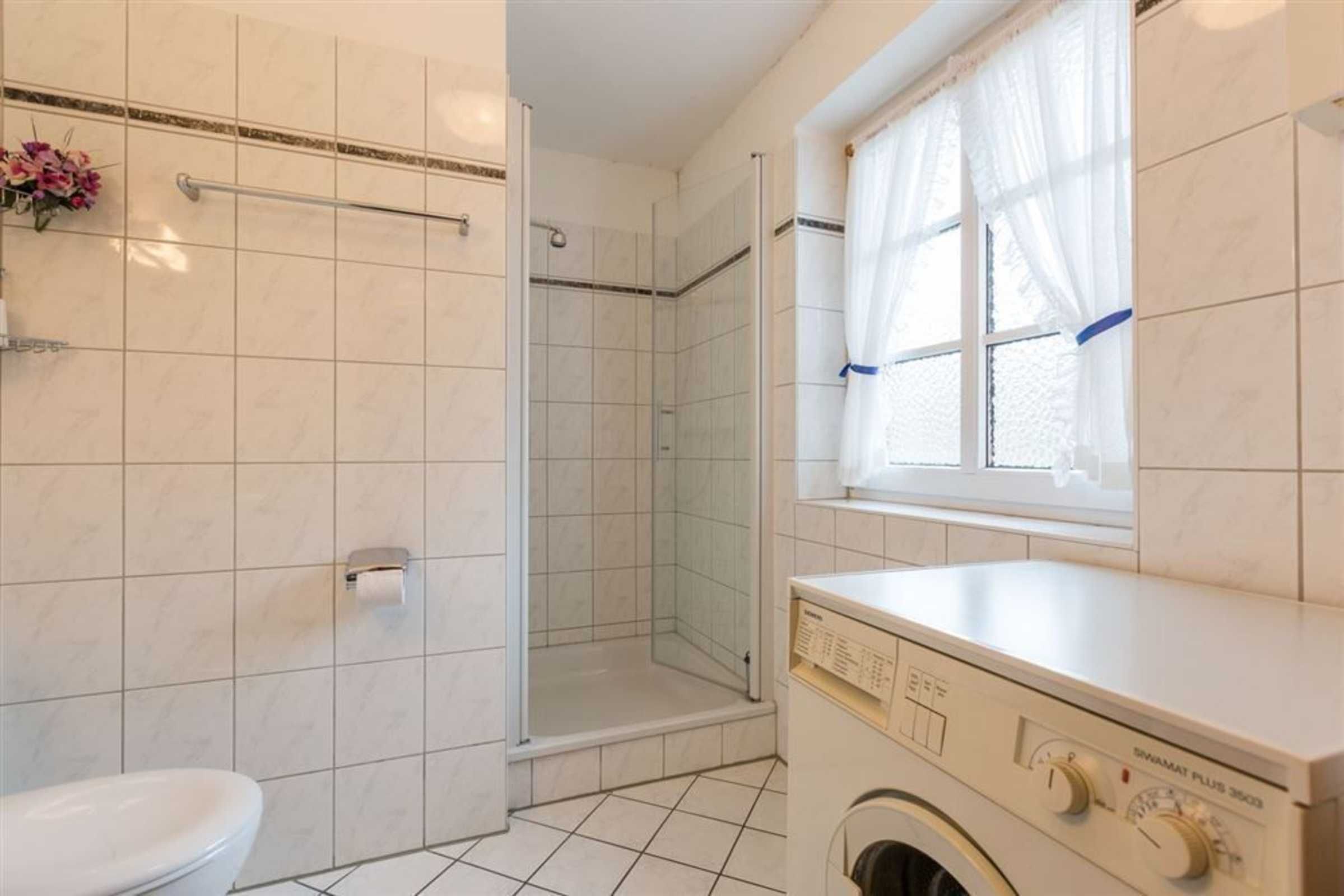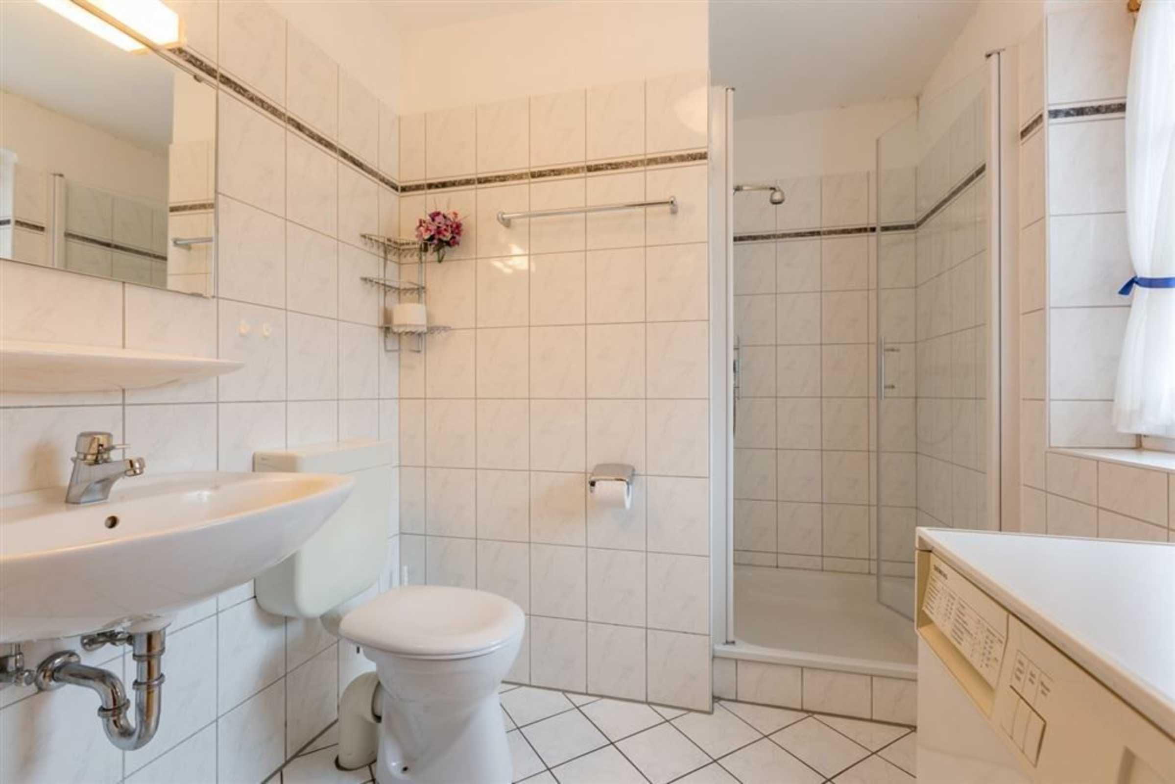 Badezimmer (Duschbad) mit Dusche, WC, Waschmaschine und Tageslicht. Fußbodenheizung für besondere Behaglichkeit.