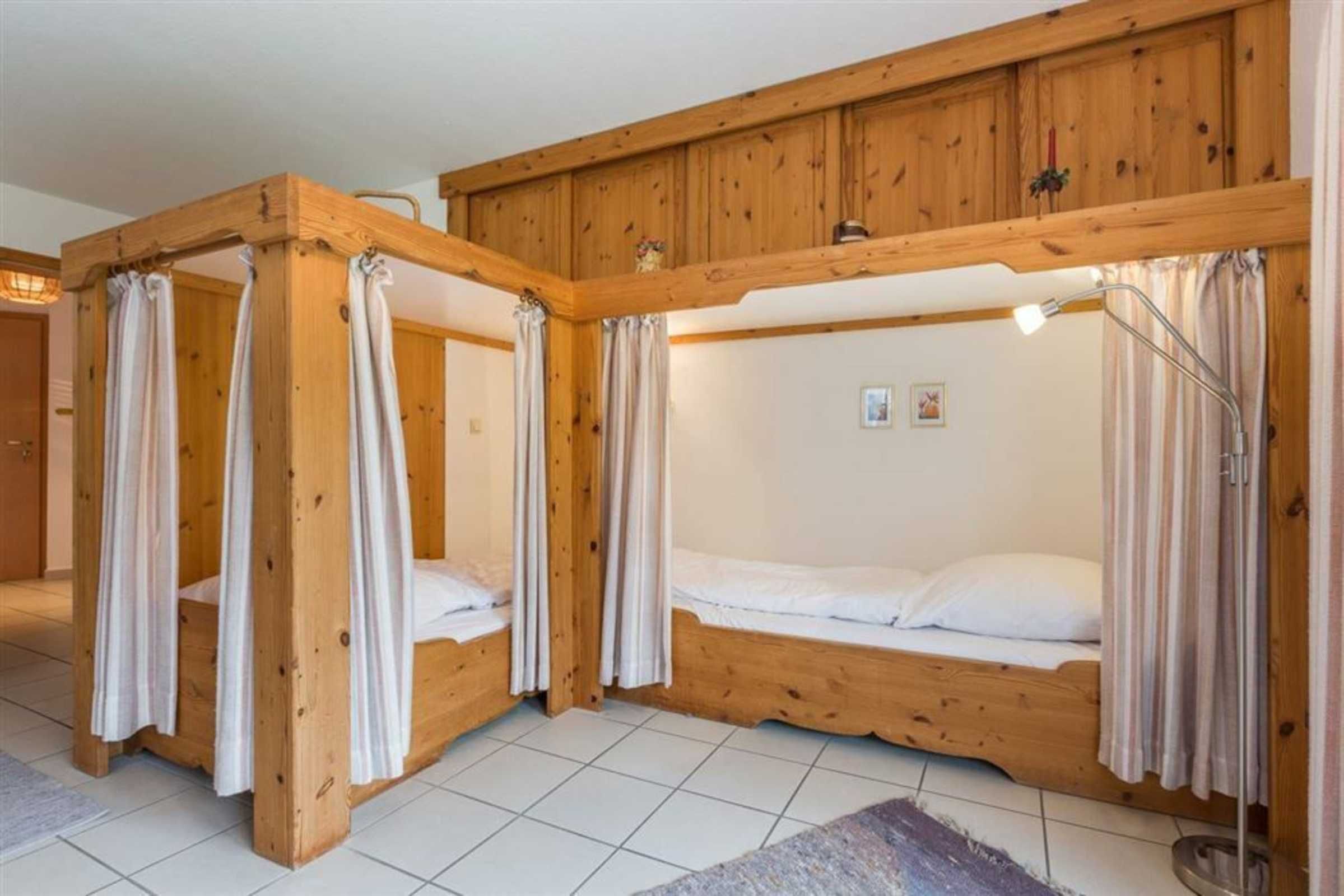 Schlafzimmer mit 2 Etagen-Einzelbetten (je 90x200cm) und Einbauschrank.