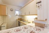 Separate Küche mit Backofen, Geschirrspüler, Kühlschrank mit Gefrierfach und praktischer Durchreiche zum Wohnzimmer.