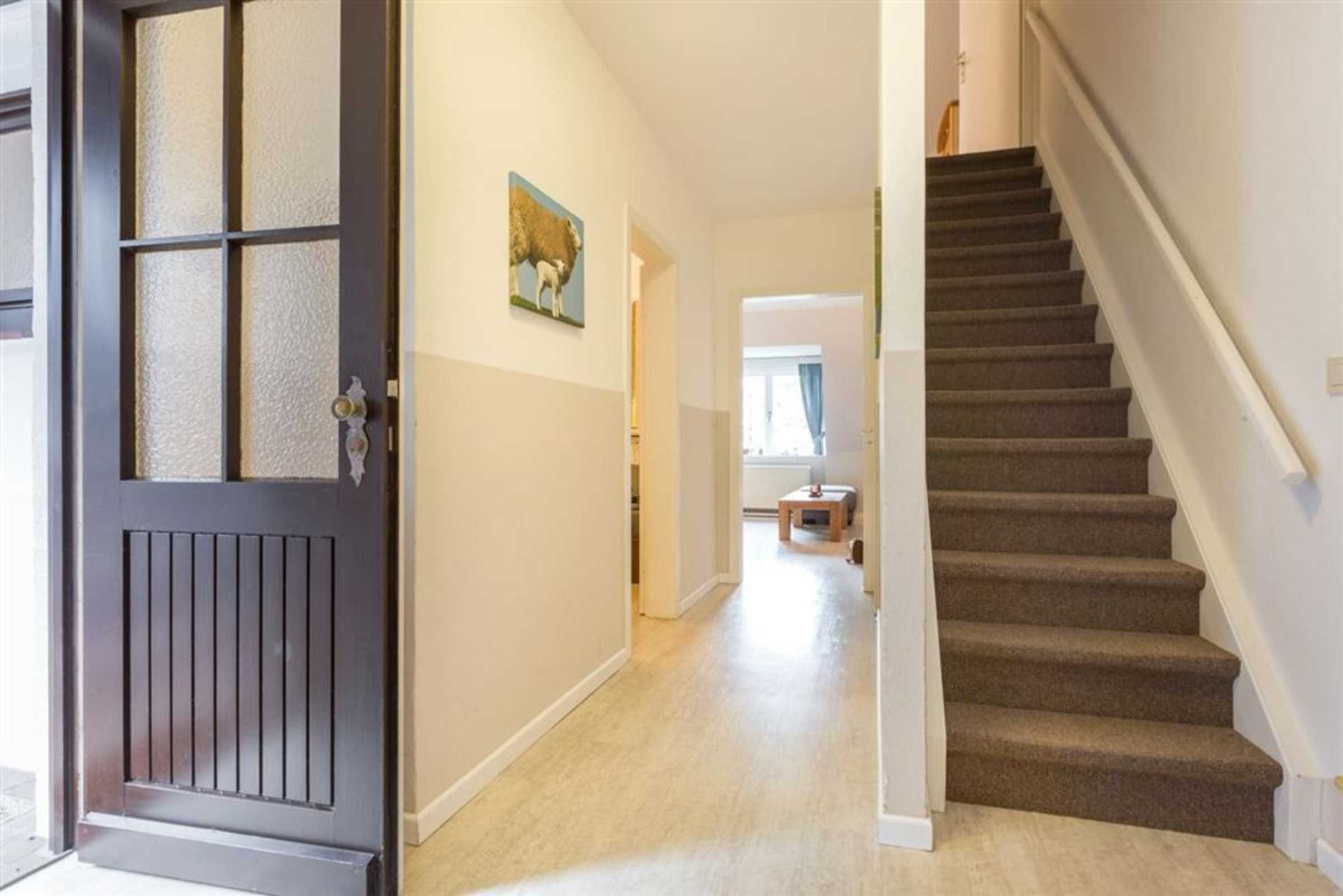 Flur mit Spiegel, Garderobe und Schuhablage im Eingangsbereich. Abstellraum mit Staubsauger, Gartenmöbeln und kostenlosem Kinderreisebett.