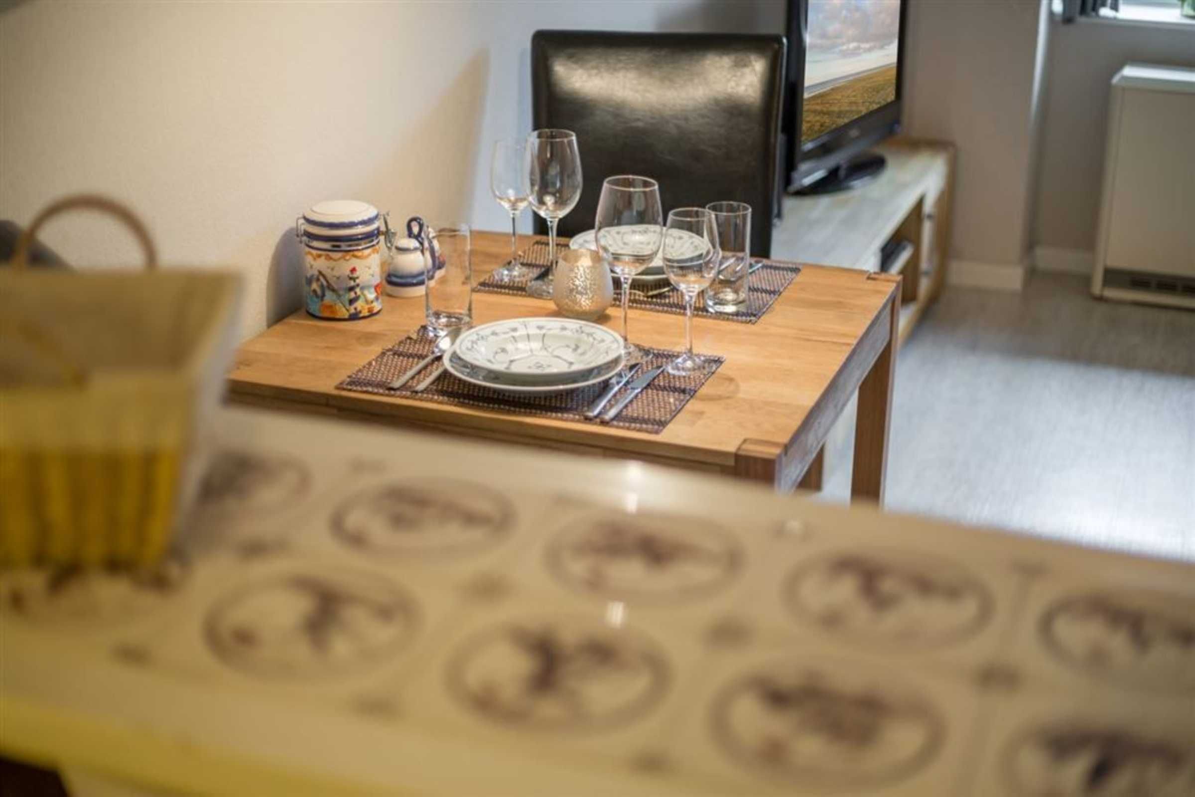 Wohnzimmer mit Sofa (2 Personen), Esstisch mit 2 Stühlen, TV (Sat), DVD-Player und Stereo-Anlage.