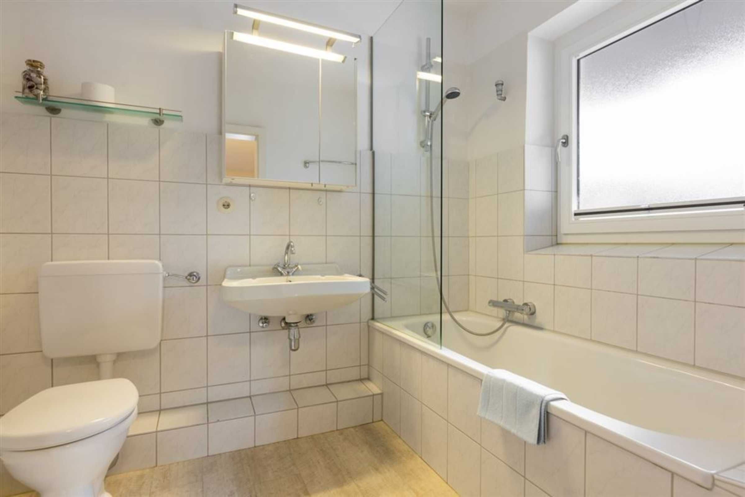 Badezimmer (Wannenbad) mit Badewanne mit Dusch-Handstück, WC, Tageslicht und Föhn.