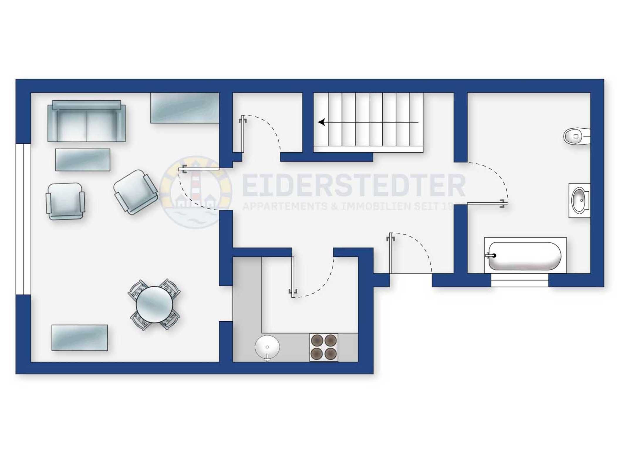 Liebevoll eingerichtete 2-Zimmer-Ferienwohnung Nordseetraum 1 unter Reet im Haus Hallig Oland mit ca. 50 qm auf 2 Ebenen (OG, DG) für bis 2 Personen und evtl. ein kleines Kind. In ruhiger Lage im Ortsteil Dorf in St. Peter-Ording. Die Wohnung ist exzellent ausgestattet und läßt zu keiner Jahreszeit Wünsche offen. Im Sommer können Sie das wunderschöne eingewachsene, ruhige Gartengrundstück zur Erholung nutzen. In diesem schönen Domizil lässt sich herrlich Urlaub machen und Erholung finden. Auch im Winter bietet das Reetdach des Hauses Hallig Oland eine gemütliche Behaglichkeit.