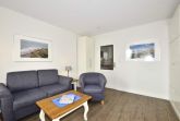 Das Wohn-/Schlafzimmer mit modernem Designerboden in Holzoptik hat ein Doppelschrankbett, eine gemütliche Sitzgarnitur (Zweisitzer und einen Sessel), einem Essplatz am Fenster, digitales Kabel-Flachbild-TV, Radio/CD.