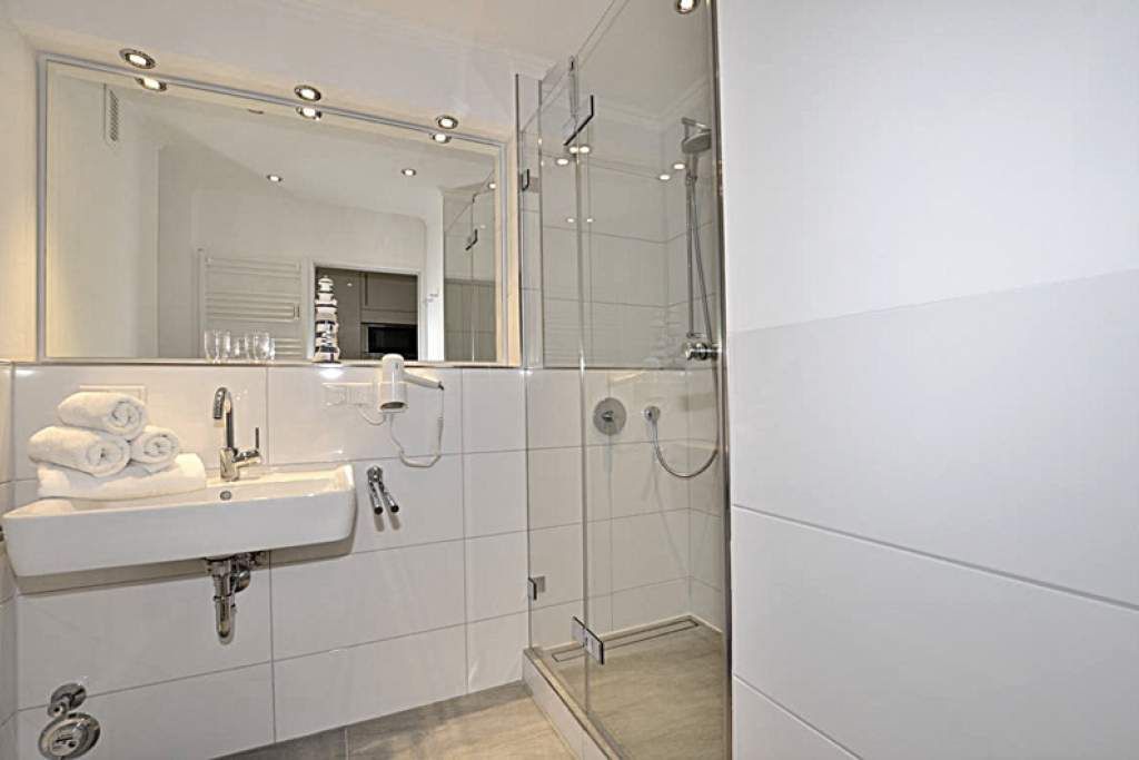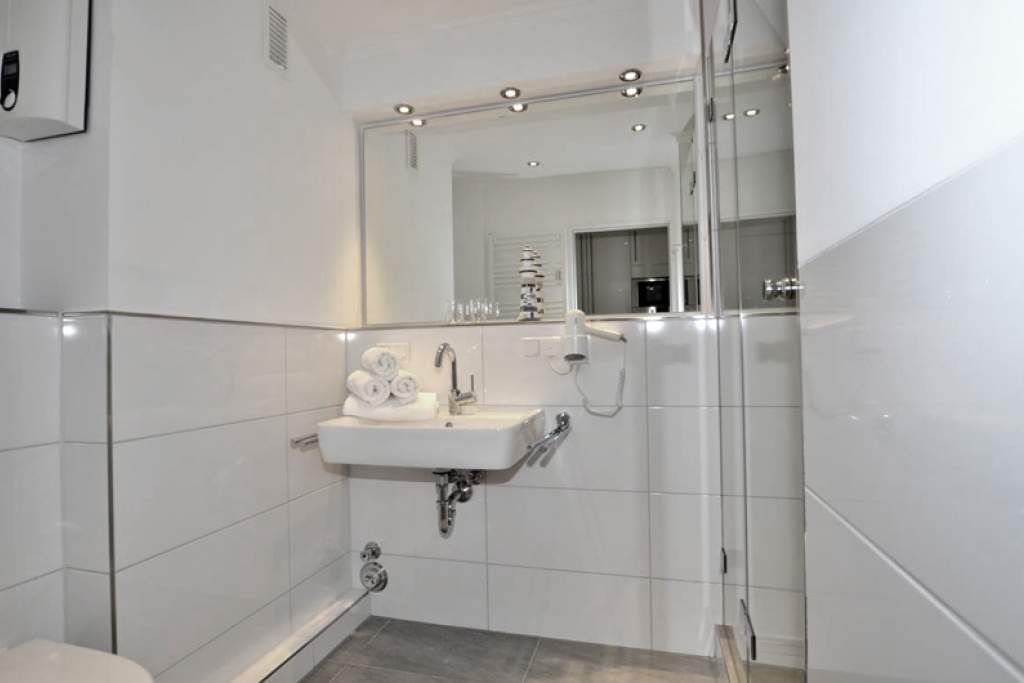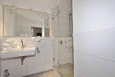 Das neue moderne Duschbad/WC hat einen Waschtisch und einen Fön.