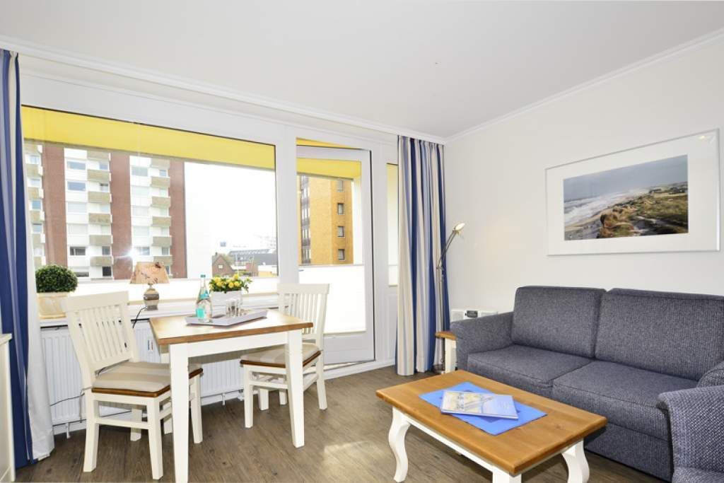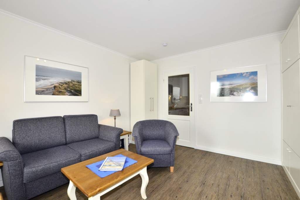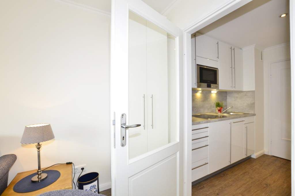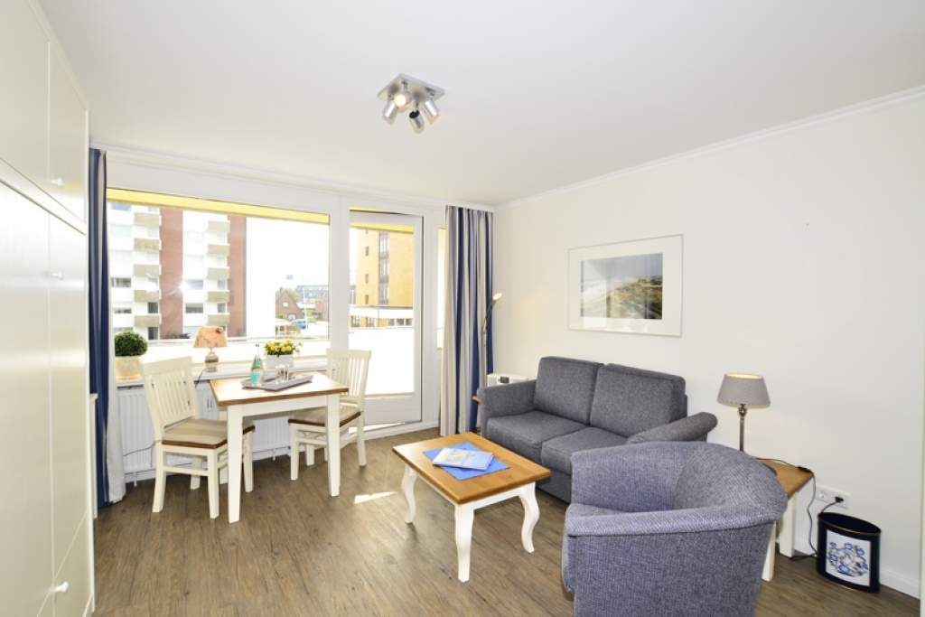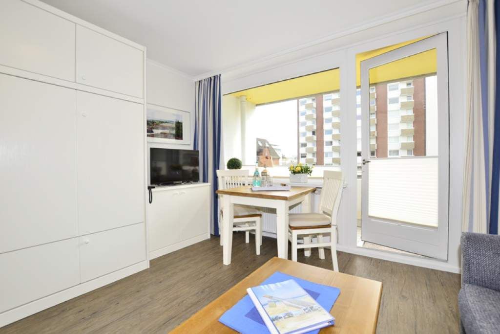 Gemütliche 1-Zimmer-Nichtraucher-Ferienwohnung (ca. 28 qm) in der 1. Etage zur Landseite mit Ostloggia (Morgensonne, mit Balkonmöbeln und Auflagen) für max. 2 Personen.