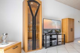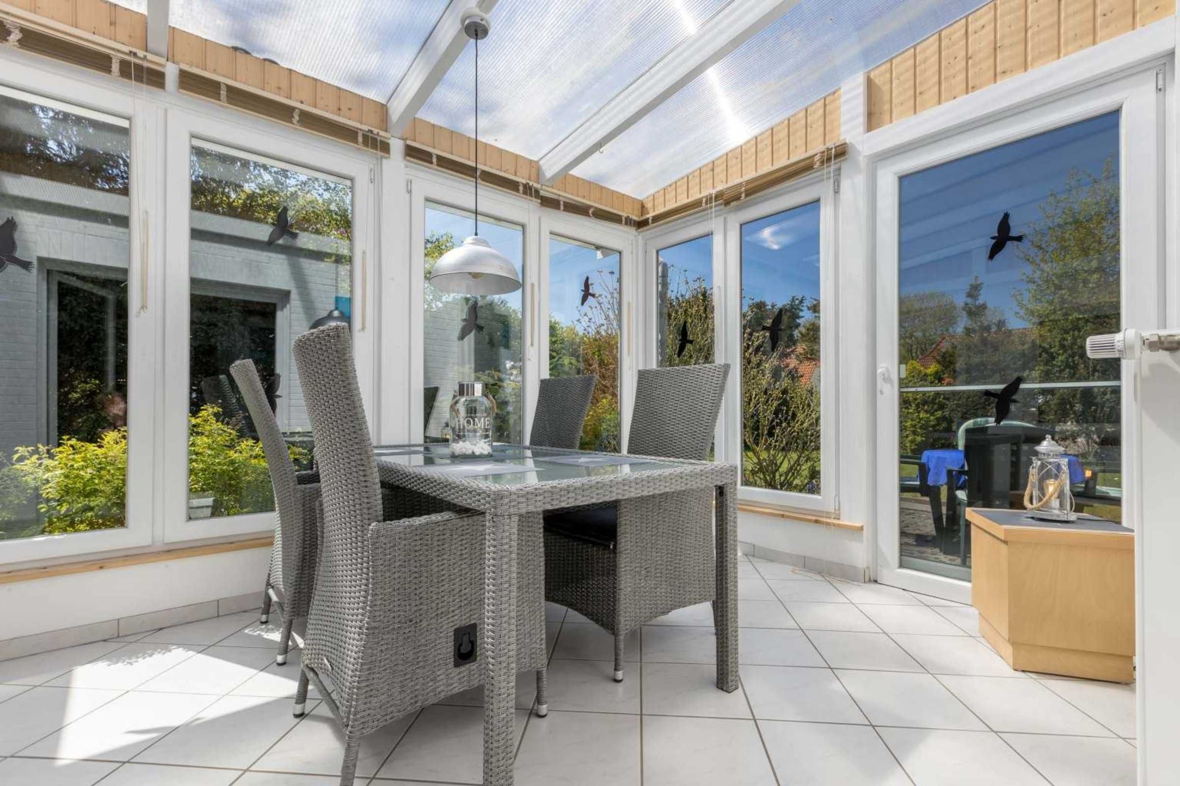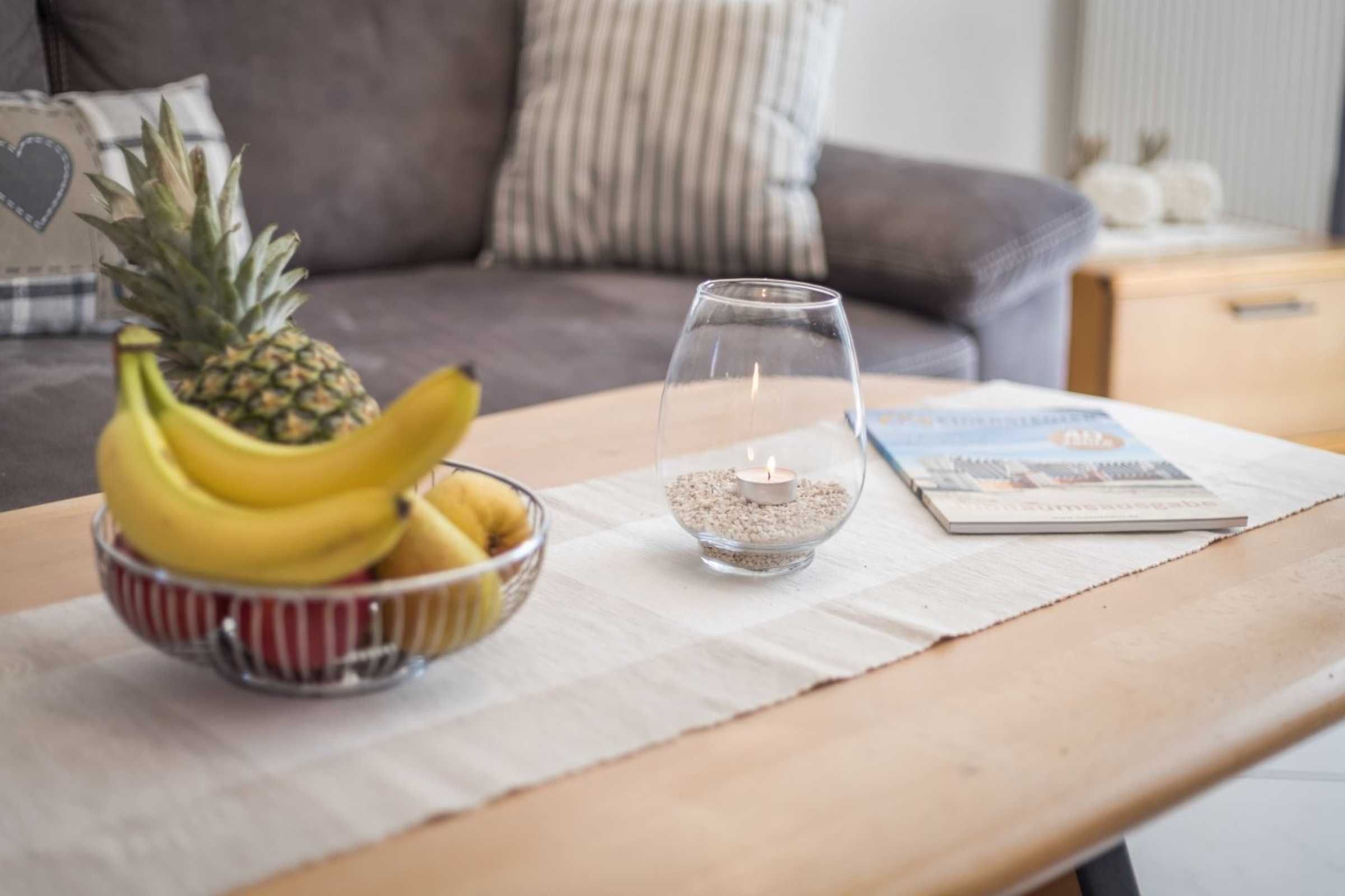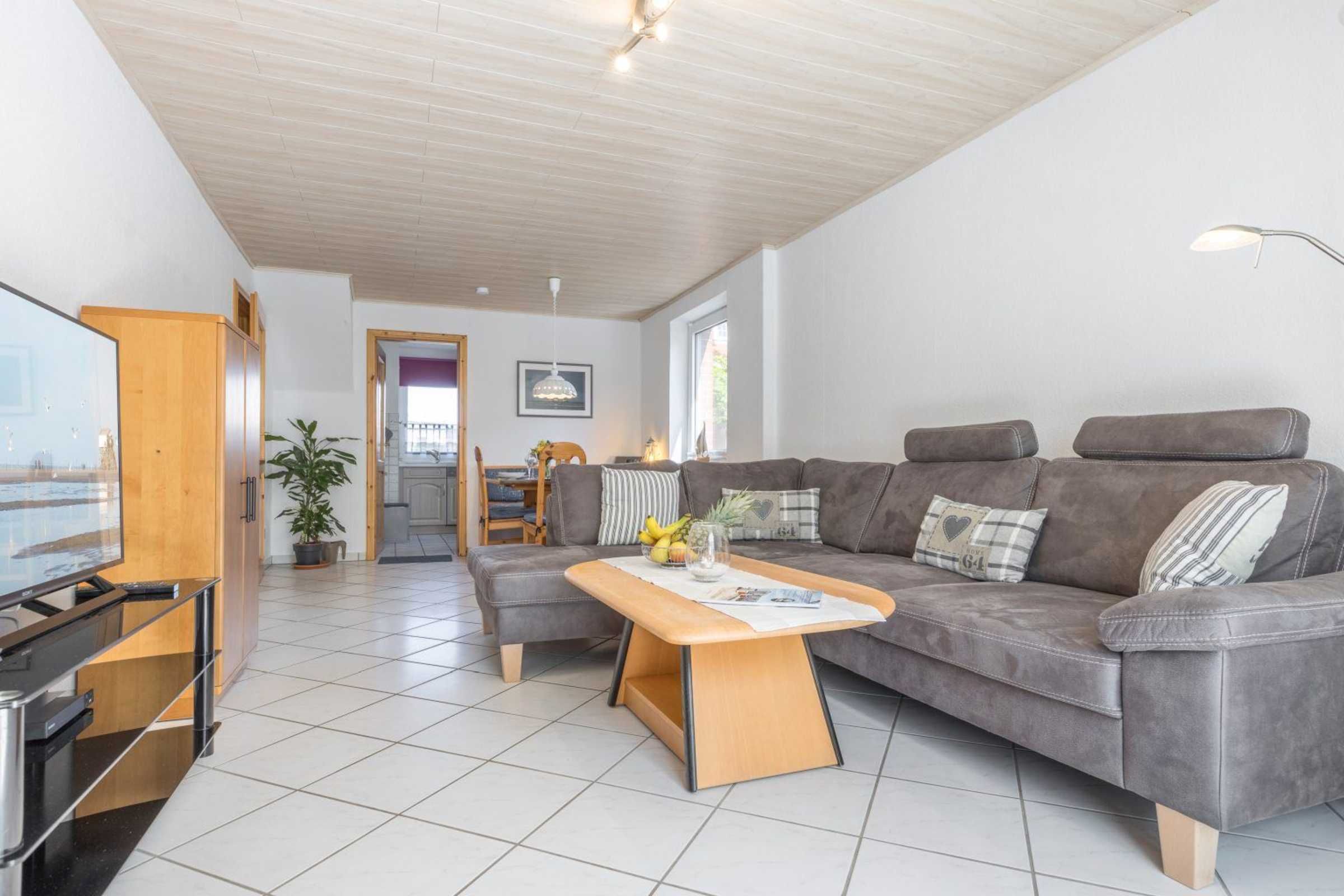 Wohnzimmer mit großem Ecksofa, großem SMART-TV (Sat), BluRay-Player, DAB Radio und Esstisch mit uriger Eckbank (3-4 Personen) und 2 Stühlen. Der schöne, helle Wintergarten nach Süden mit Tisch und 4 Stühlen sowie die überdachte Gartenterrasse mit Strandkorb bieten den perfekten Rahmen für kulinarische Genüsse und gesellige Momente in Ihrem Nordseeurlaub.
