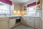 Separate Küche mit Backofen, Mikrowelle, Geschirrspüler, Kühlschrank, Gefrierschrank und großer Arbeitsfläche.