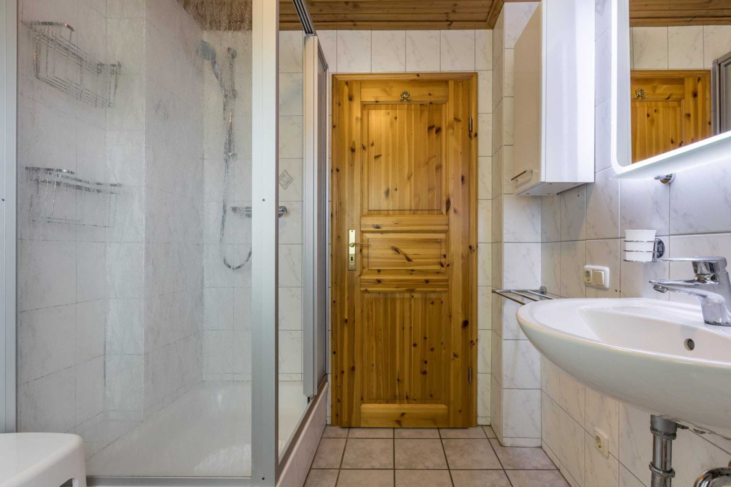 Badezimmer (Duschbad) mit Dusche, WC, Heizkörper, Föhn und Tageslicht.