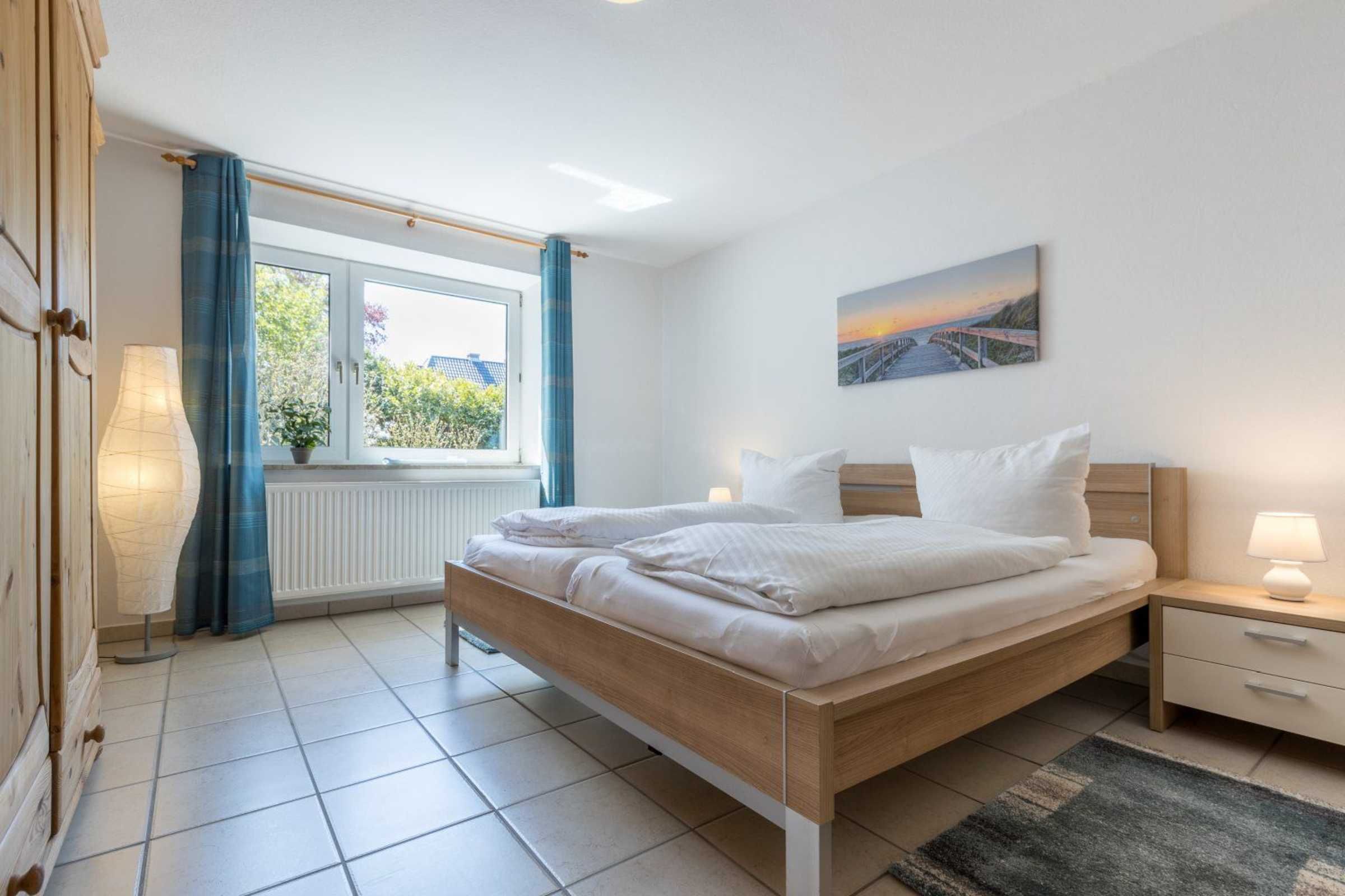 Schlafzimmer mit Doppelbett (2x 90x200cm), TV (Sat), großem Kleiderschrank, Kommode, 2 Stühlen und Blick in den Garten nach Süden.
