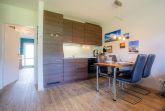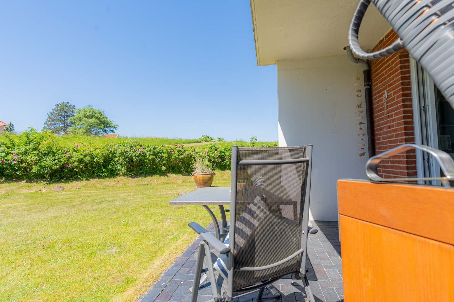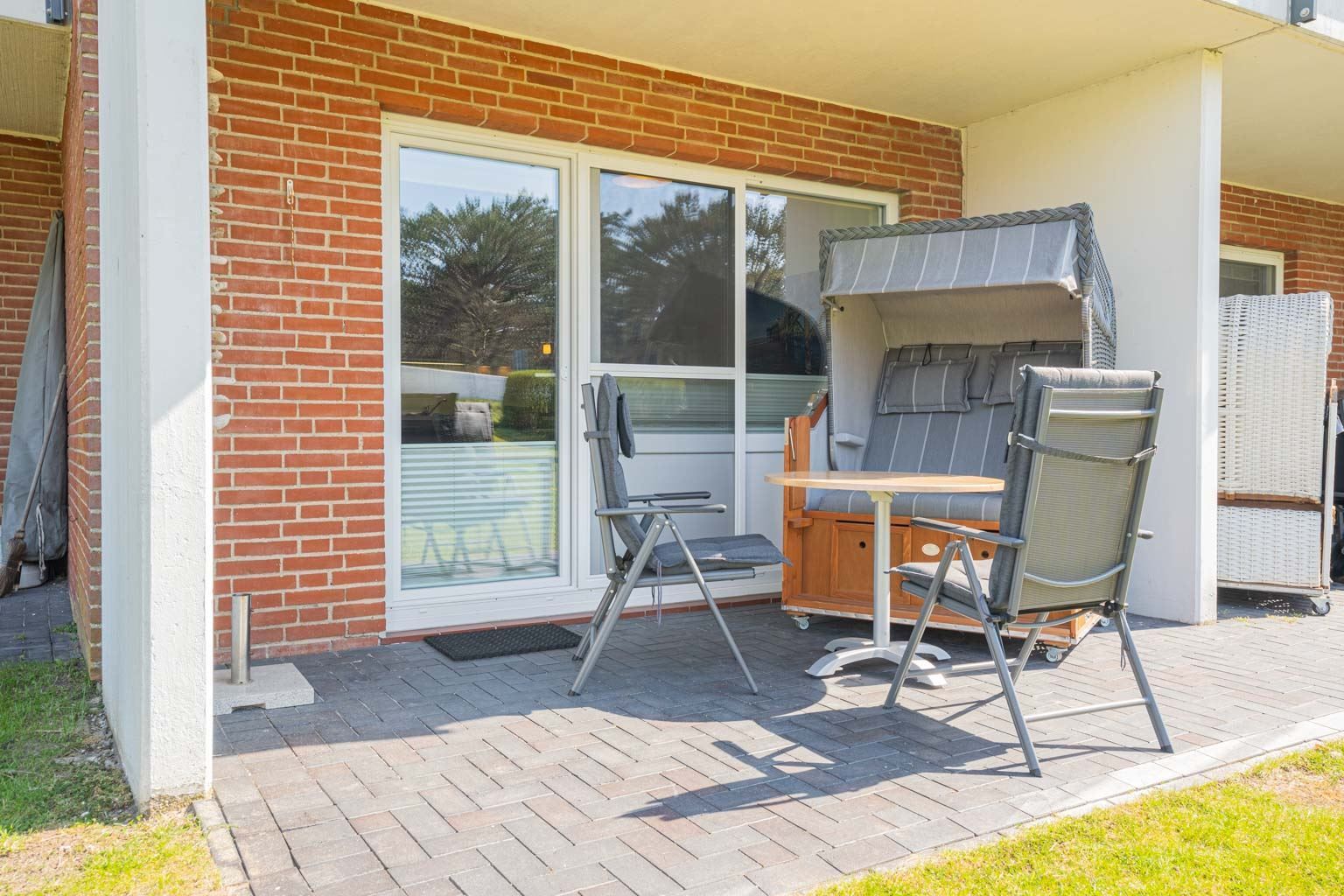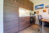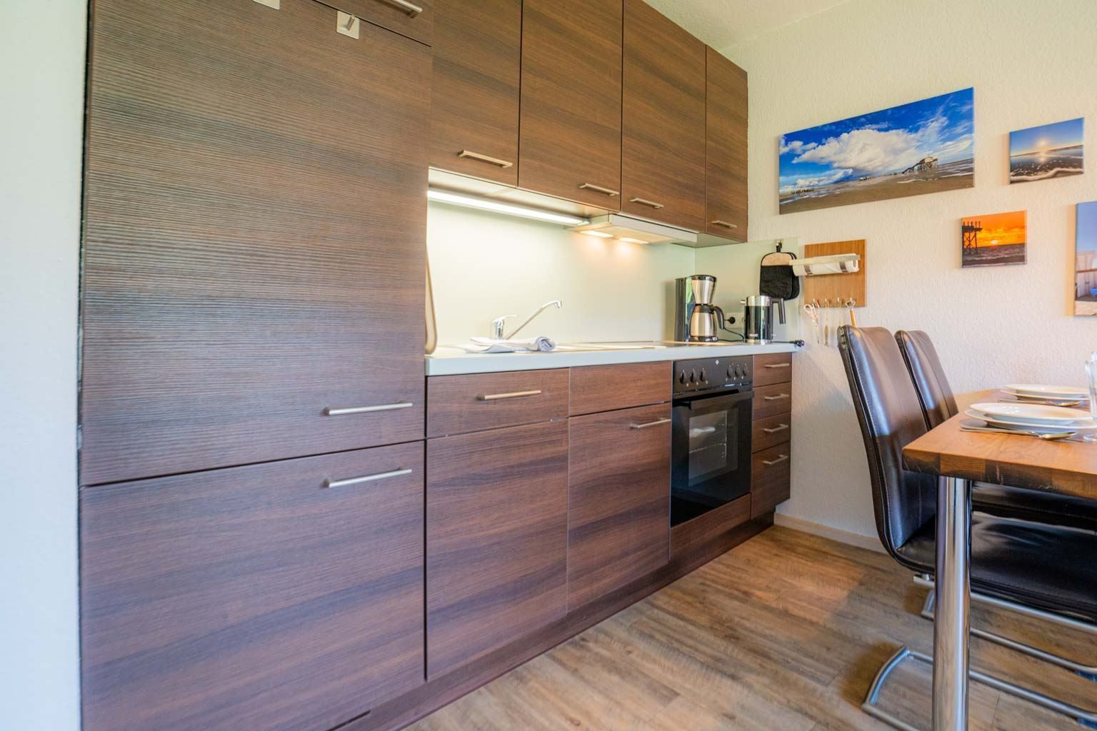Freundlich eingerichtetes Wohnzimmer mit ausklappbarem Schrank-Bett (160x190cm), Sofa (3er), 1 Sessel mit Hocker, TV (Sat), Radio und Esstisch mit 4 Stühlen. Direkter Zugang zur möblierten Garten-Terrasse nach Südwesten mit Strandkorb. Moderne offene Küche mit Backofen, Kühlschrank mit Gefrierfach und Geschirrspüler.