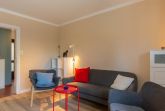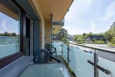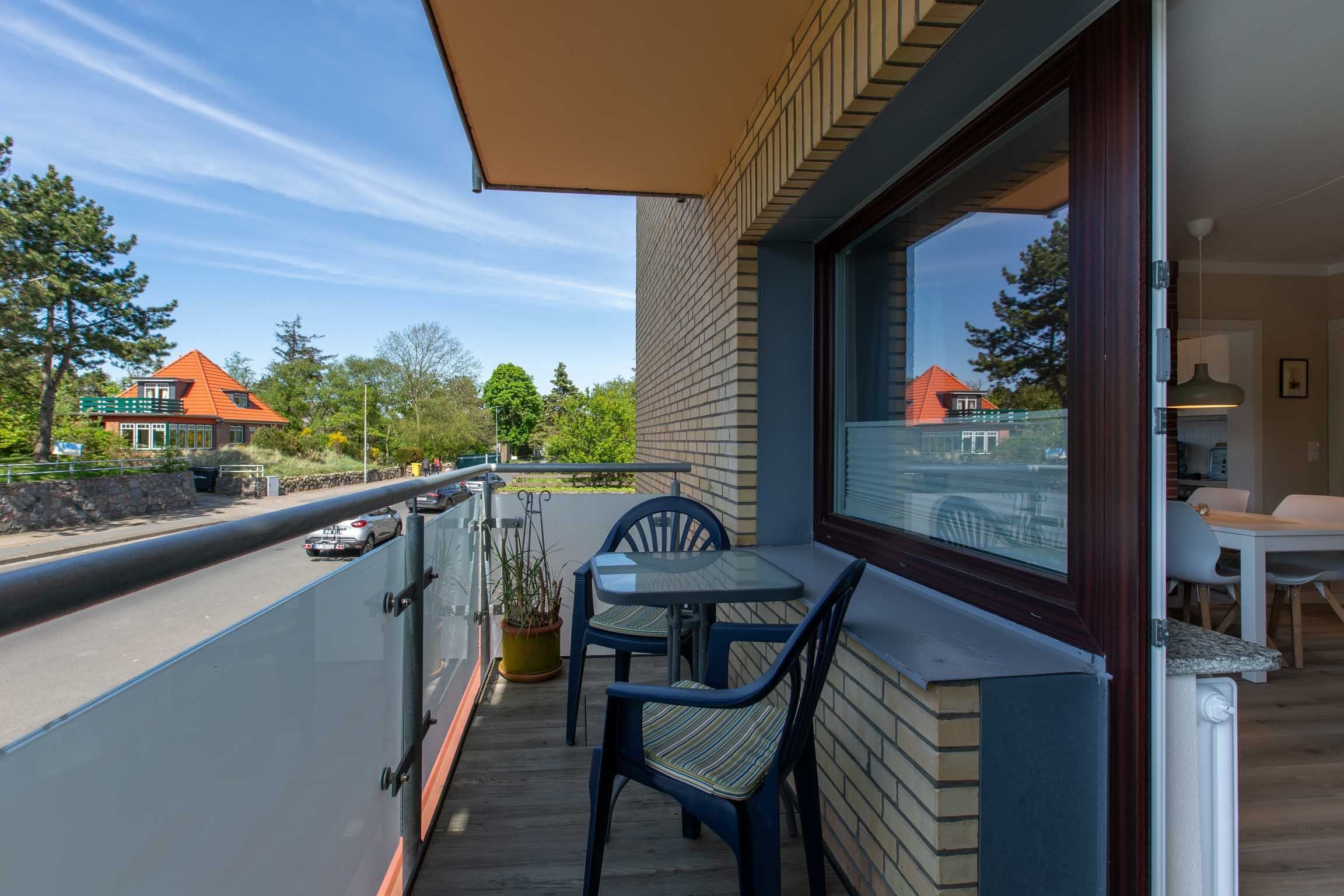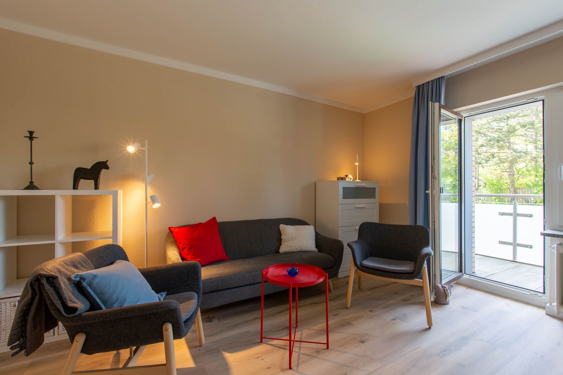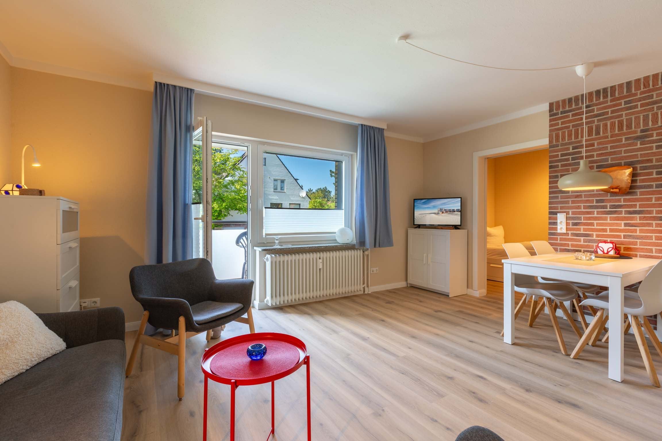Wohnzimmer mit Sofa, zwei Sesseln, TV (Sat) und Esstisch mit vier Stühlen. Direkter Zugang zum möblierten Balkon nach Westen.