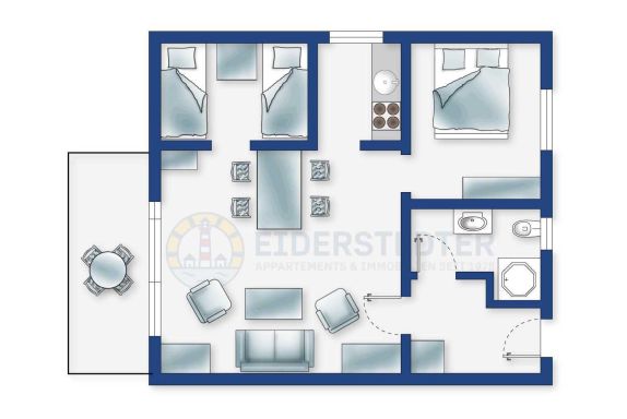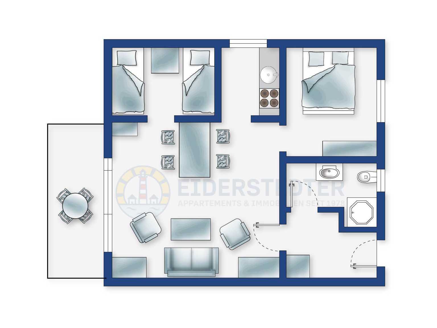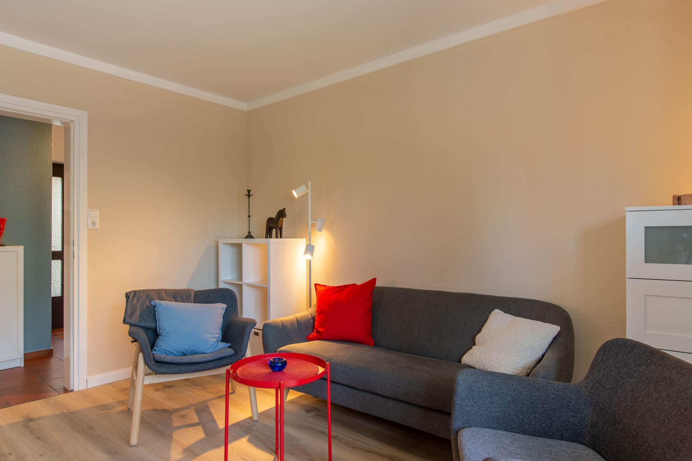 Gemütliche 2 1/2-Zimmer-Ferienwohnung Seestern im Haus Colonia mit ca. 48 m² auf 1 Ebene (EG bzw. Hochparterre) für bis zu 4 Personen (Wohlfühlbelegung: max. 3 Erwachsene). Zentrumsnahe Lage im Ortsteil Bad in St. Peter-Ording. Direkt am Kurwald, mit Bushaltestelle in der Nähe (kostenloses City Shuttle mit Gästekarte).