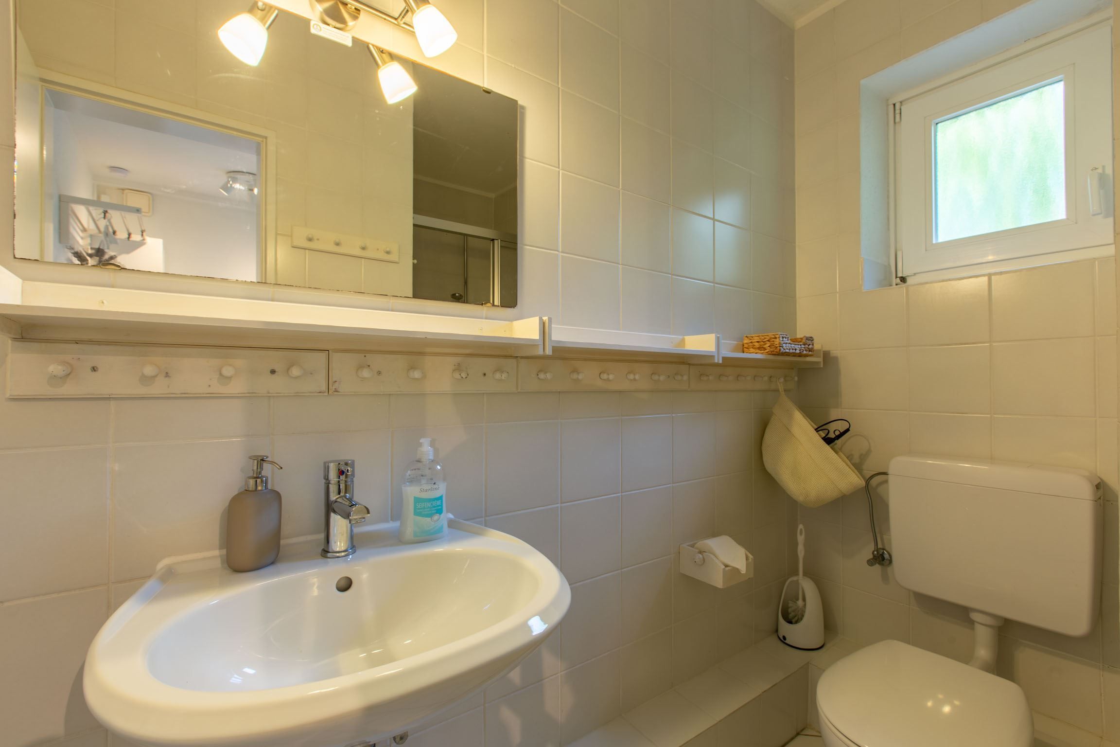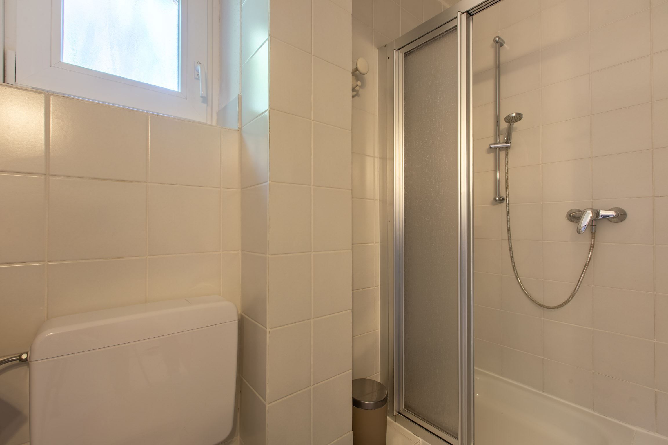 Badezimmer (Duschbad) mit Dusche, WC, Tageslicht und Föhn.