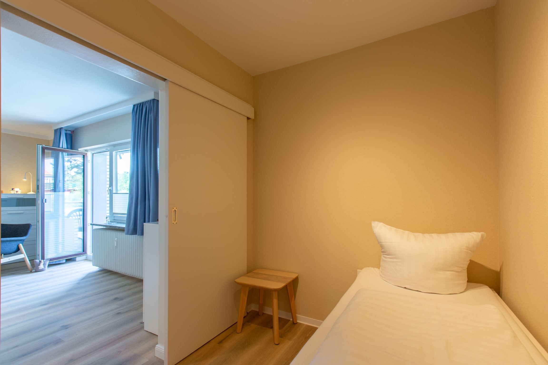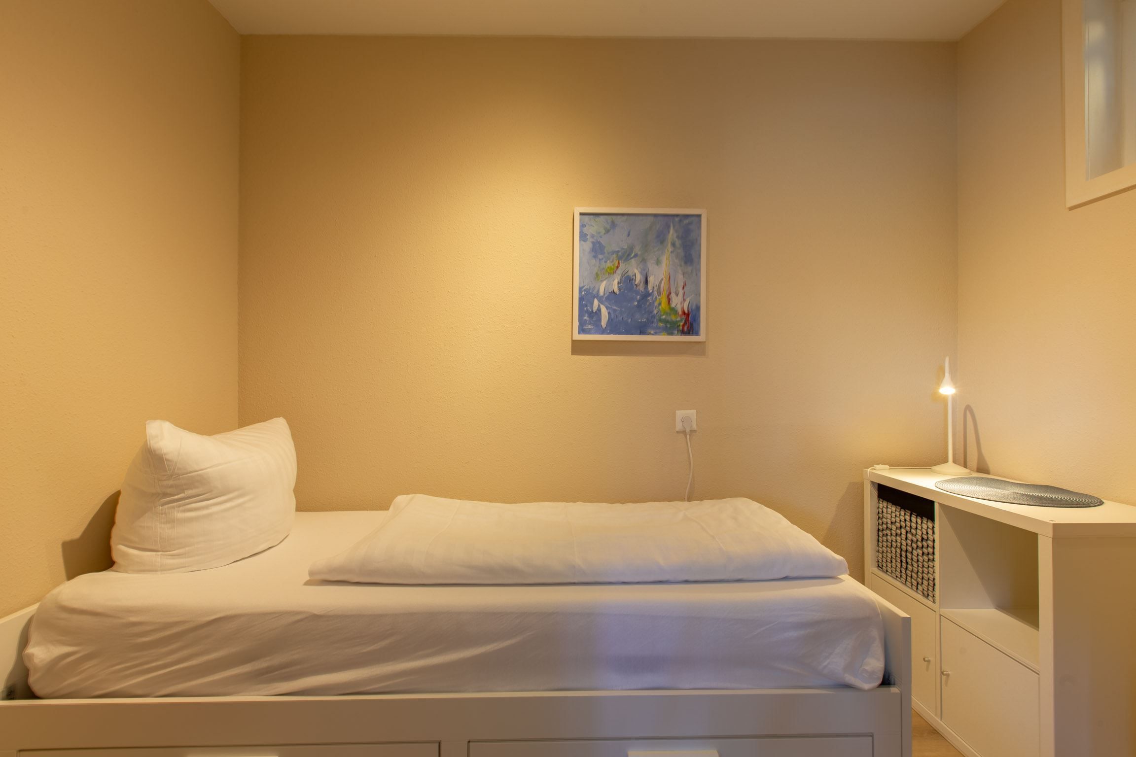 2. Schlafzimmer mit Einzelbett (80x200cm), das zum Doppelbett ausziehbar ist (2x 80x200cm), und Kommode.