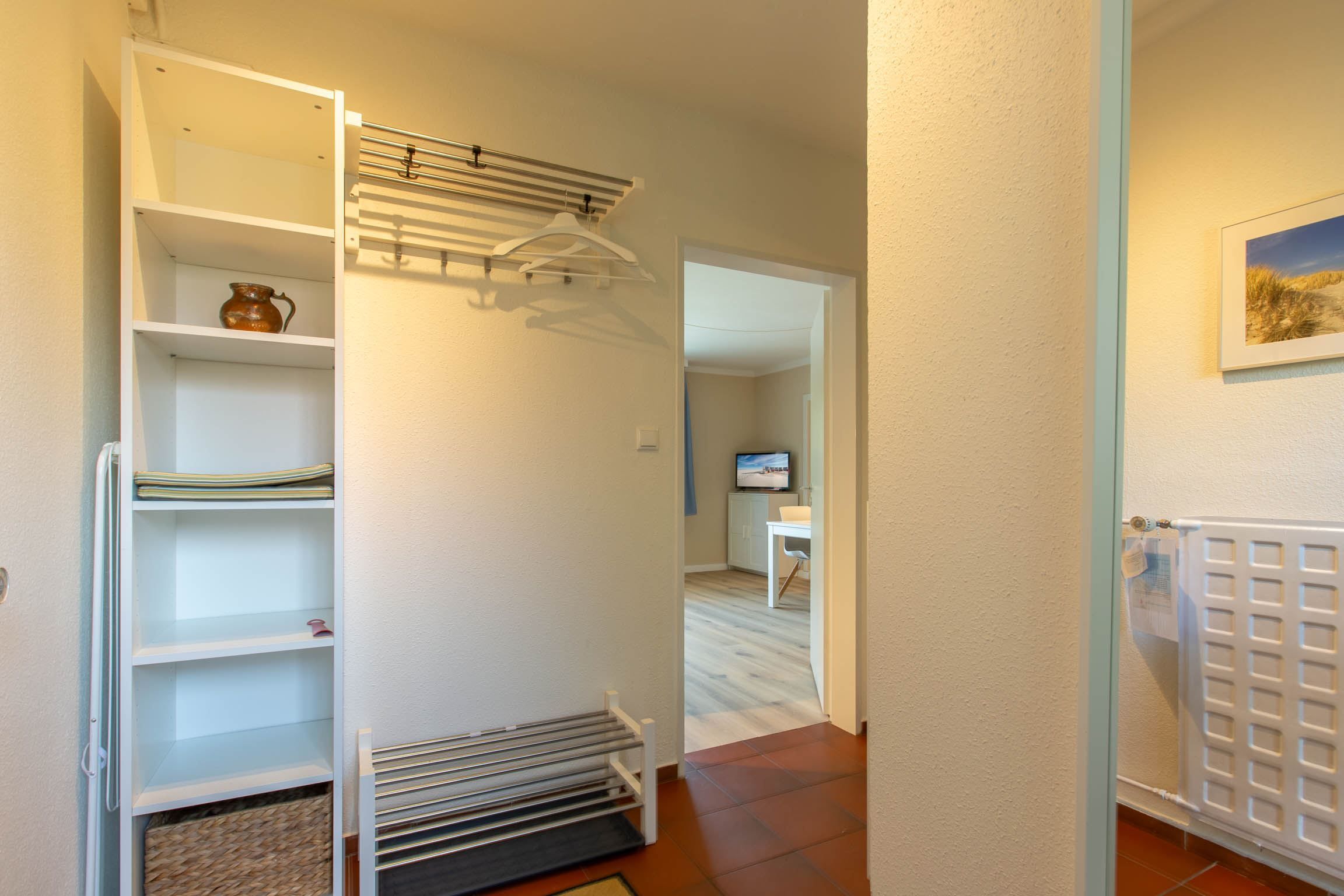 Flur mit Garderobe, Schuhablage und Haushaltskommode mit Staubsauger im Eingangsbereich. Die Wohnung verfügt über einen separaten Eingang, vor dem sich auch eine kleine Terrasse befindet.