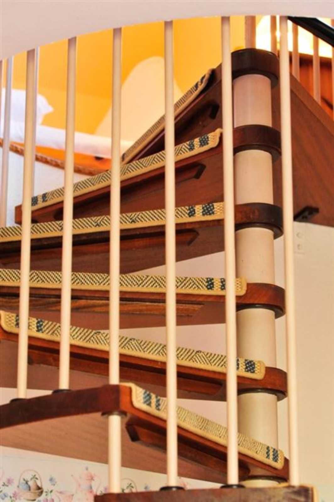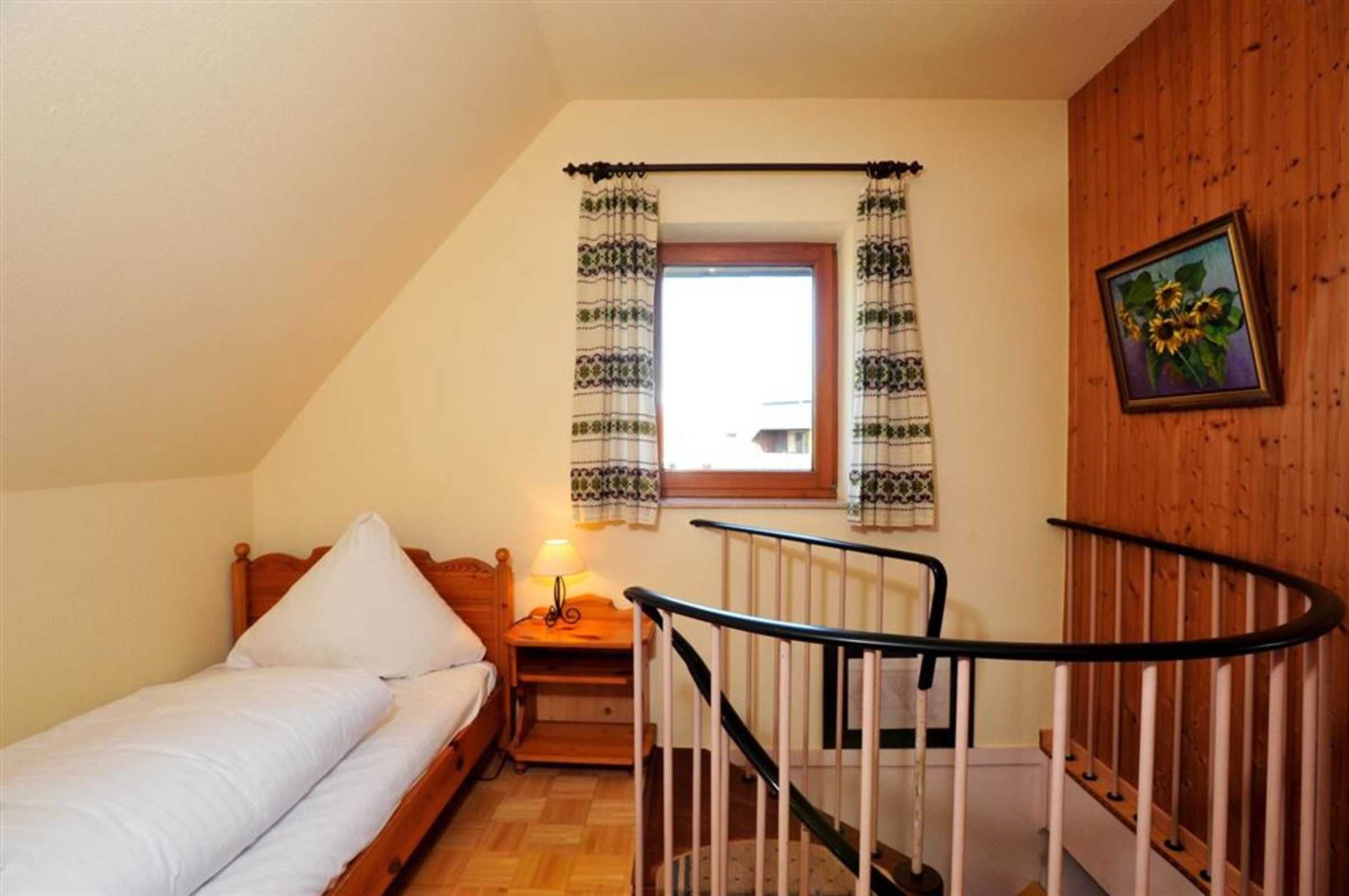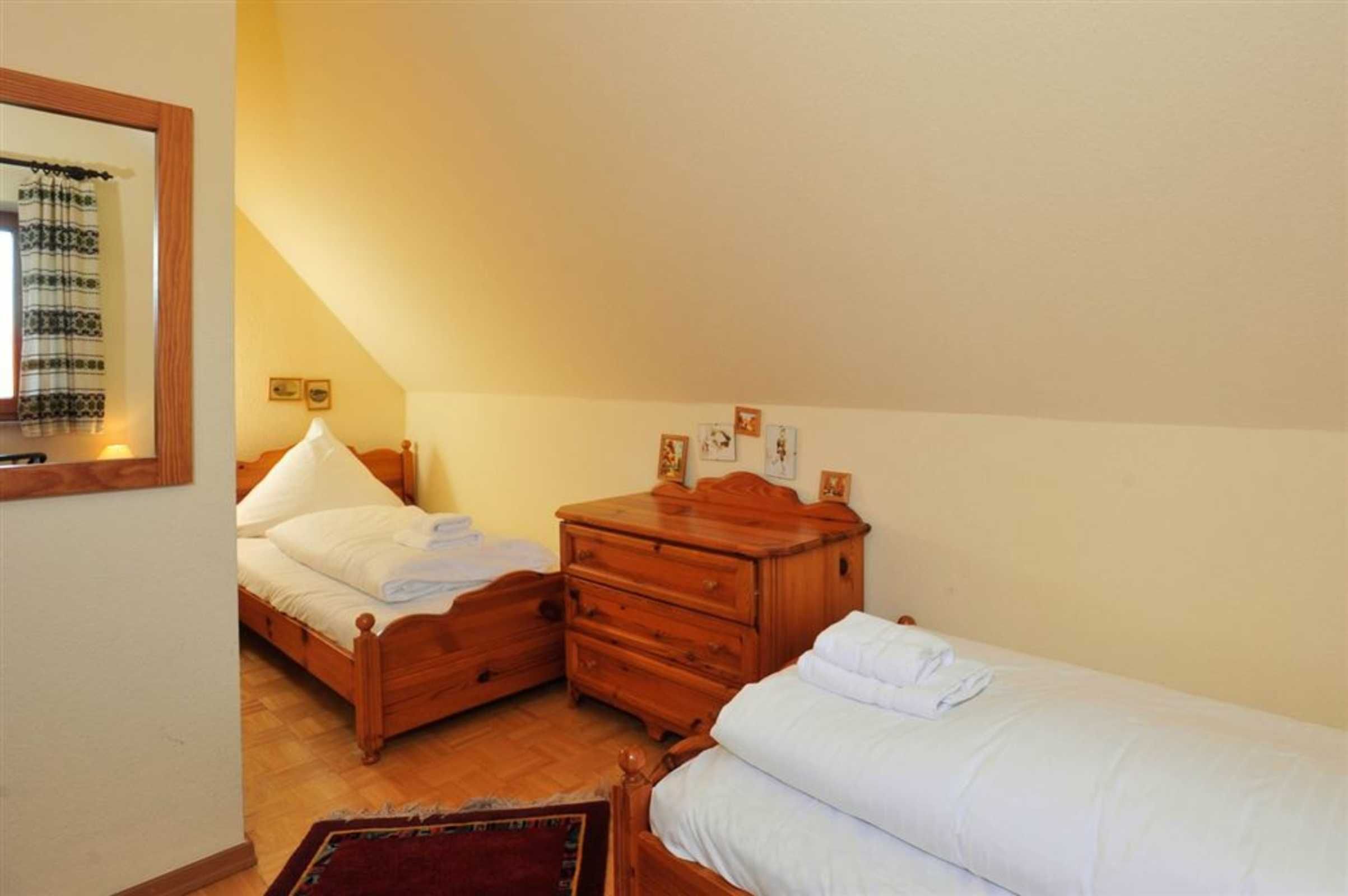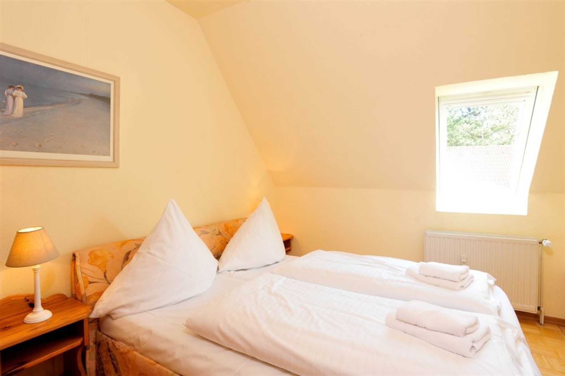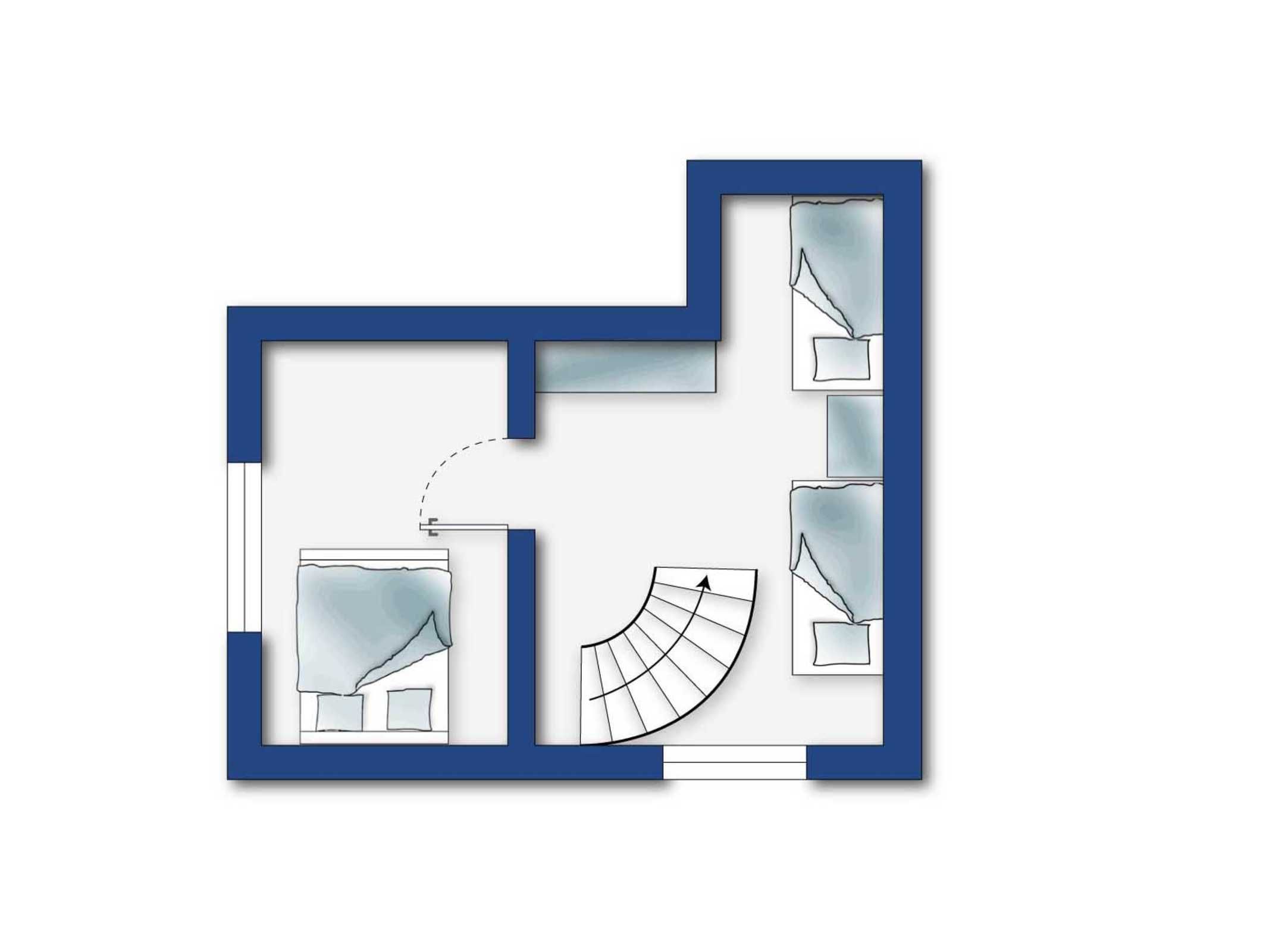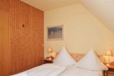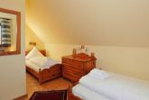 Halboffenes 1. Schlafzimmer mit 2 Einzelbetten (je 100x200cm), Kleiderschrank und Kommode. Zugang über Wendeltreppe aus dem Wohnzimmer. Durchgangszimmer zum anderen Schlafzimmer.