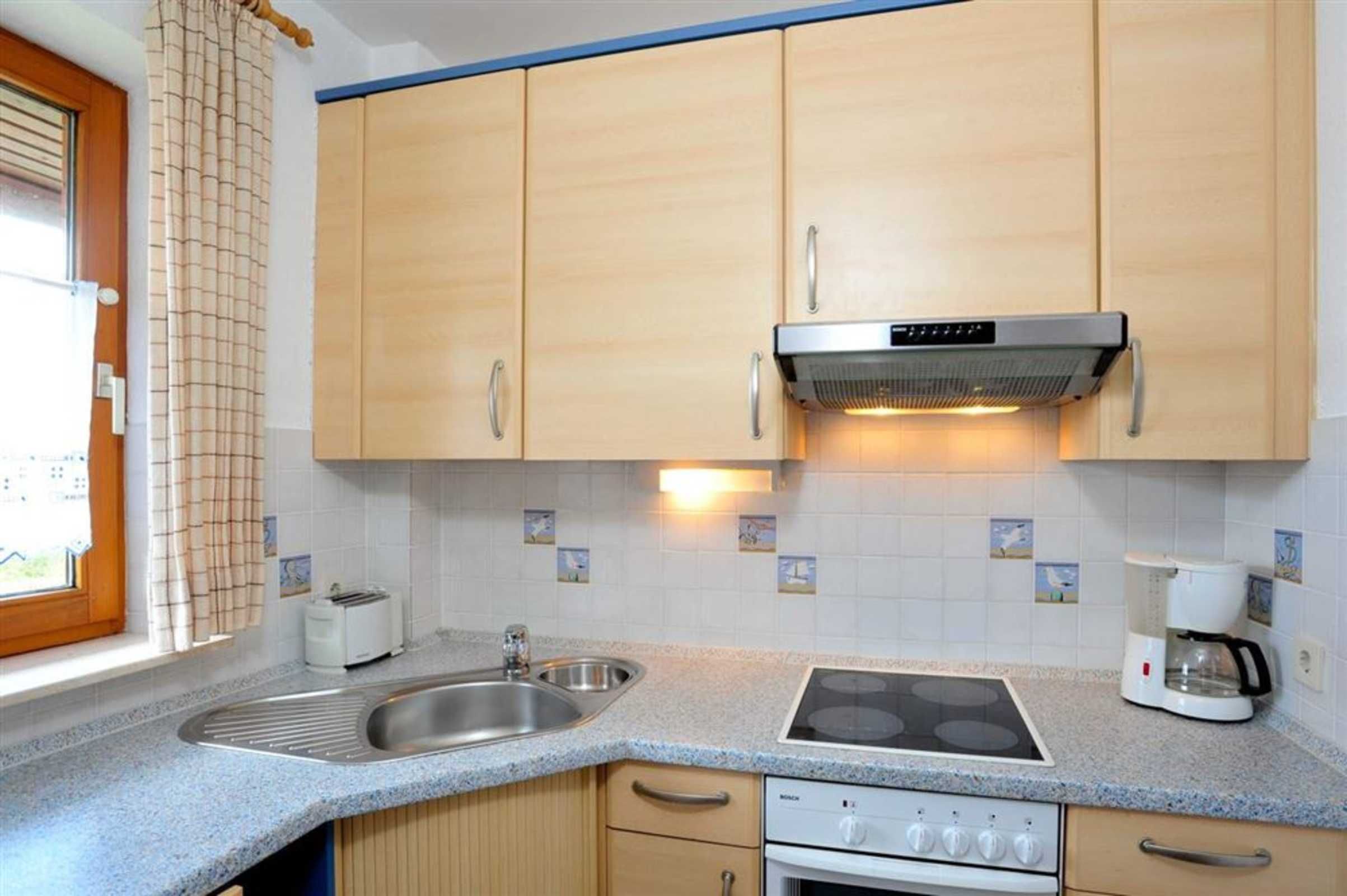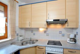 Kleine separate Küche mit Backofen, Kühlschrank mit Gefrierfach und Philips Senseo Kapsel-Kaffeemaschine. Durchgang zwischen Flur und Wohnzimmer.
