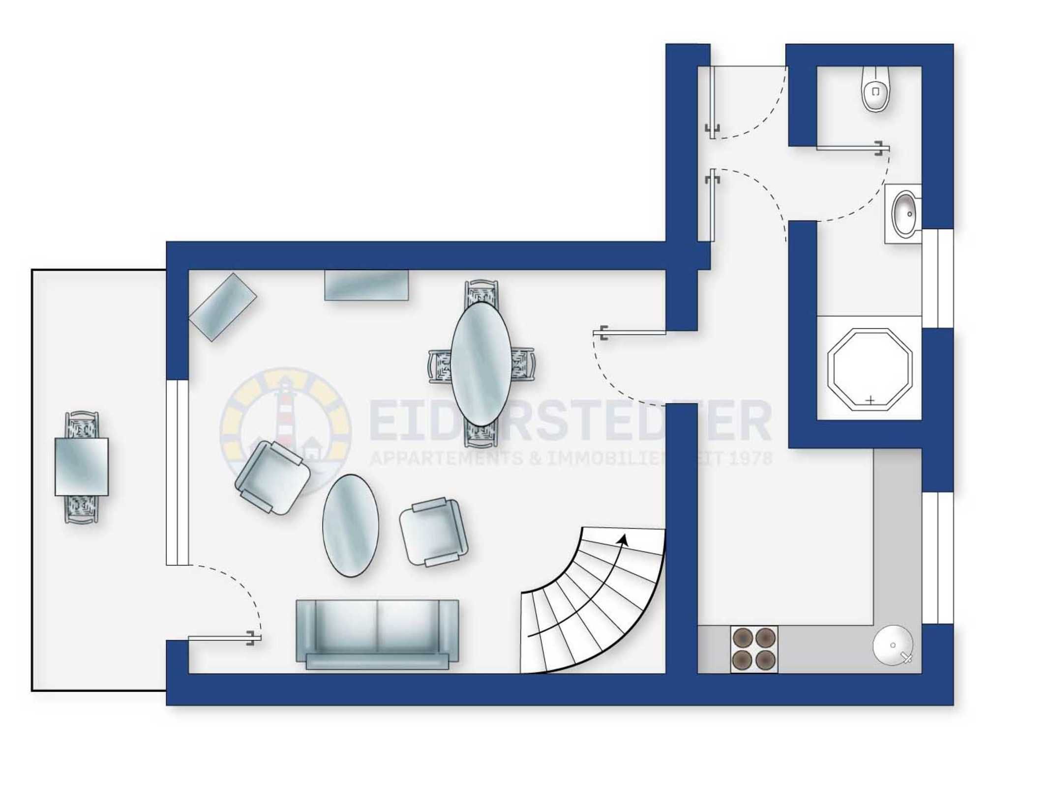 Gemütliche 3-Zimmer-Ferienwohnung Brigitte mit ca. 48qm auf 2 Ebenen (OG, DG) für bis zu 4 Personen. In strandnaher Lage im Ortsteil Bad in St. Peter-Ording.