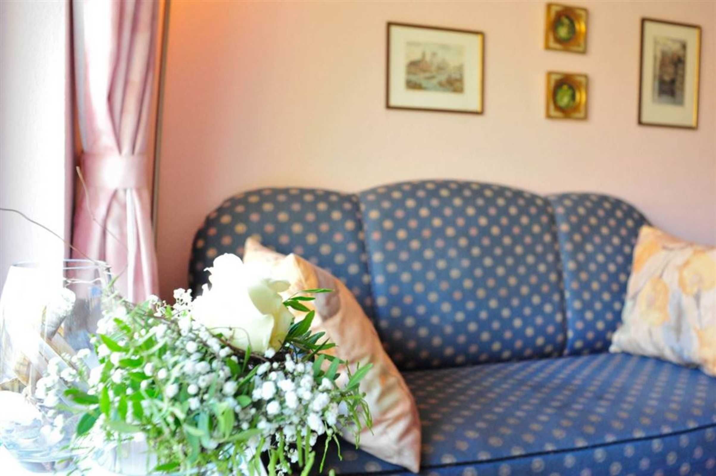 Wohnzimmer mit Sofa für 2 Personen, Fernsehsessel, TV (Kabel), Radio und Esstisch mit 4 Stühlen. Direkter Zugang zum möblierten Balkon nach Osten.