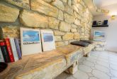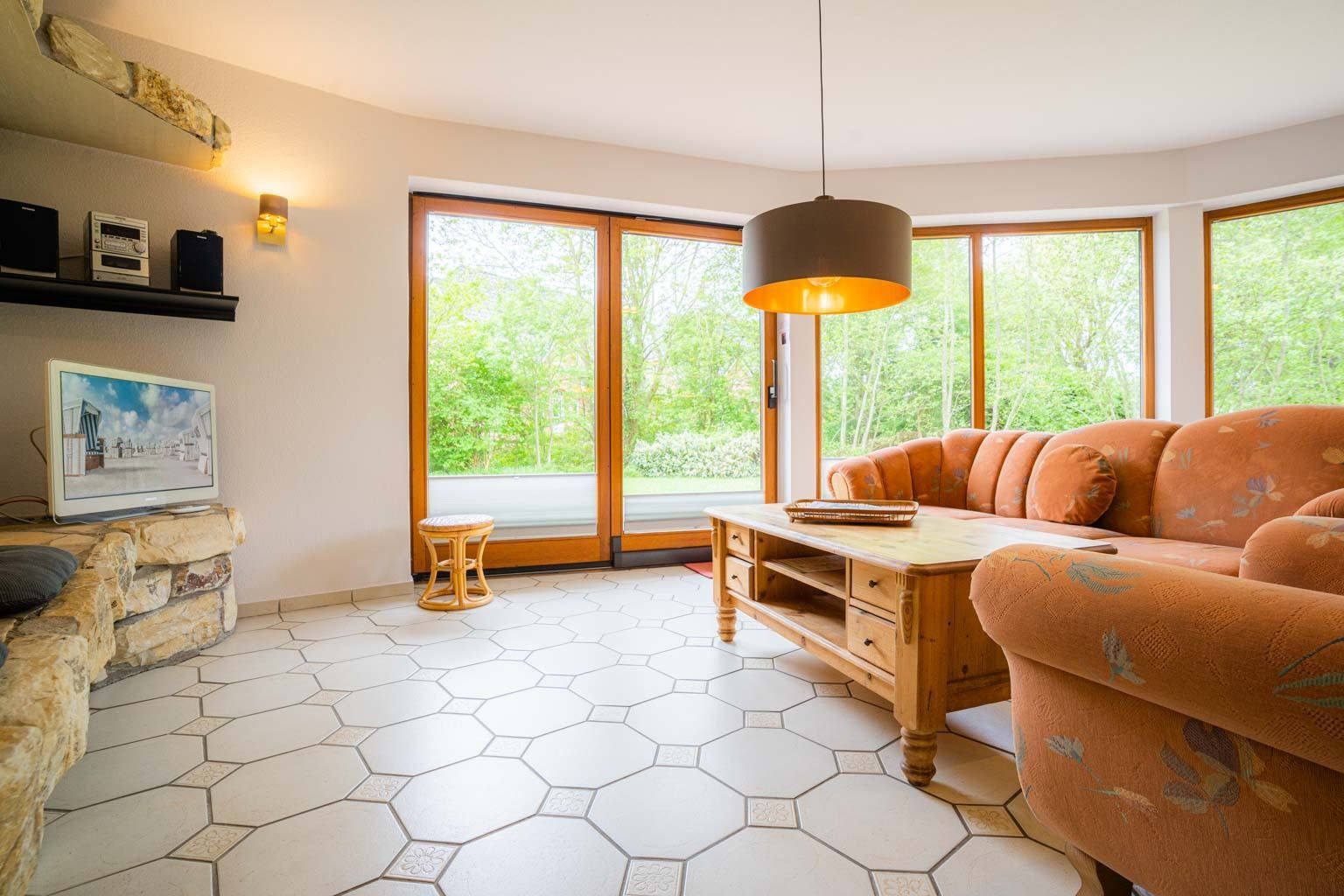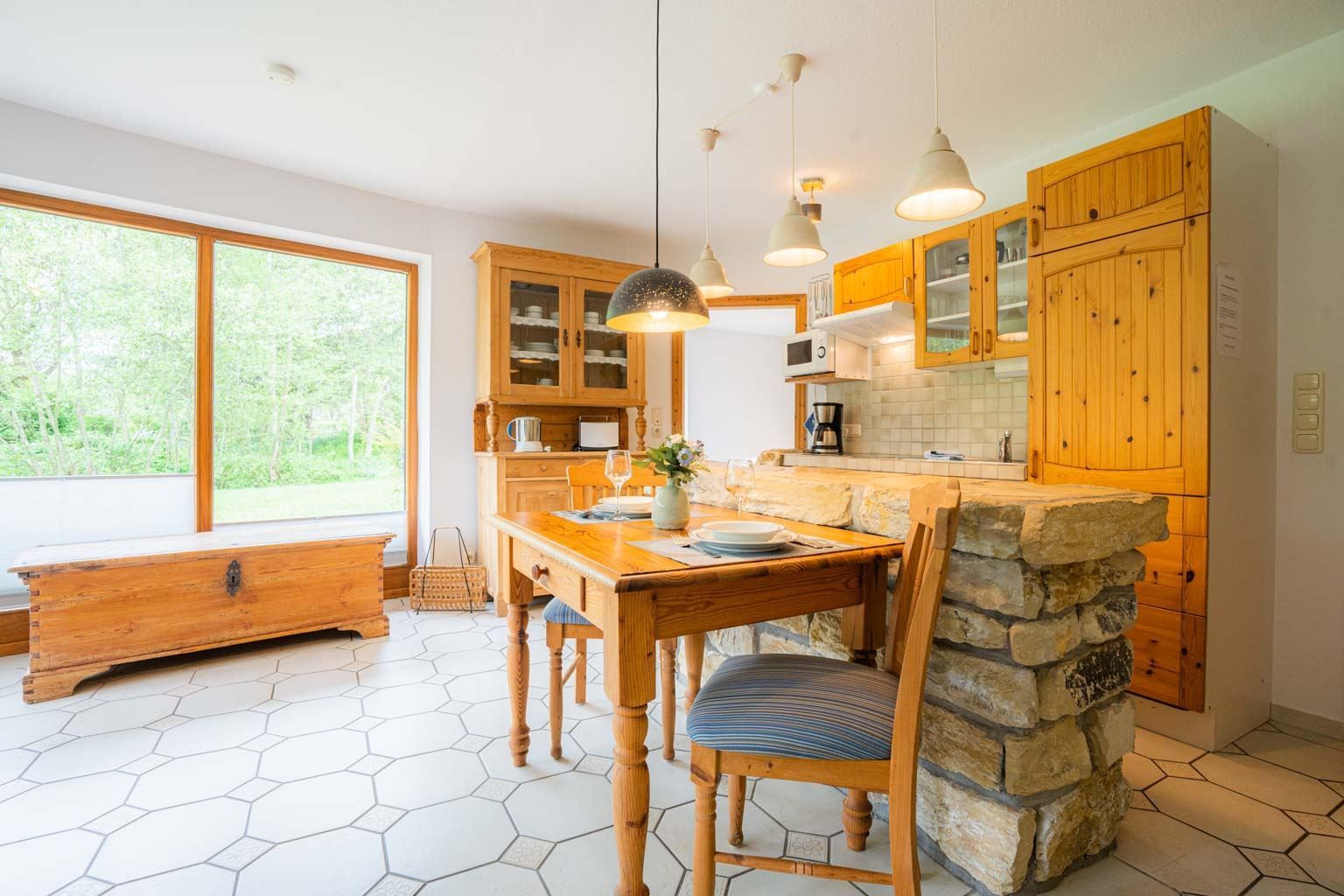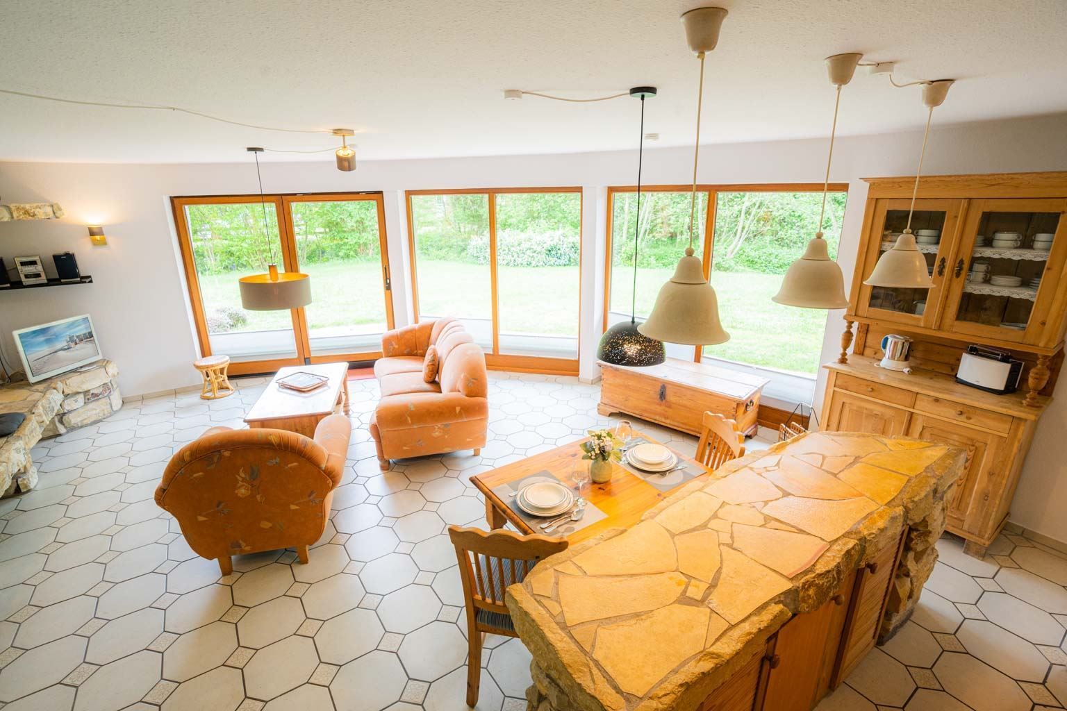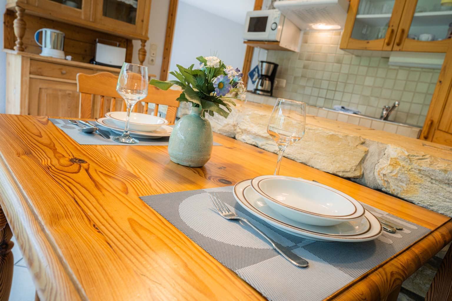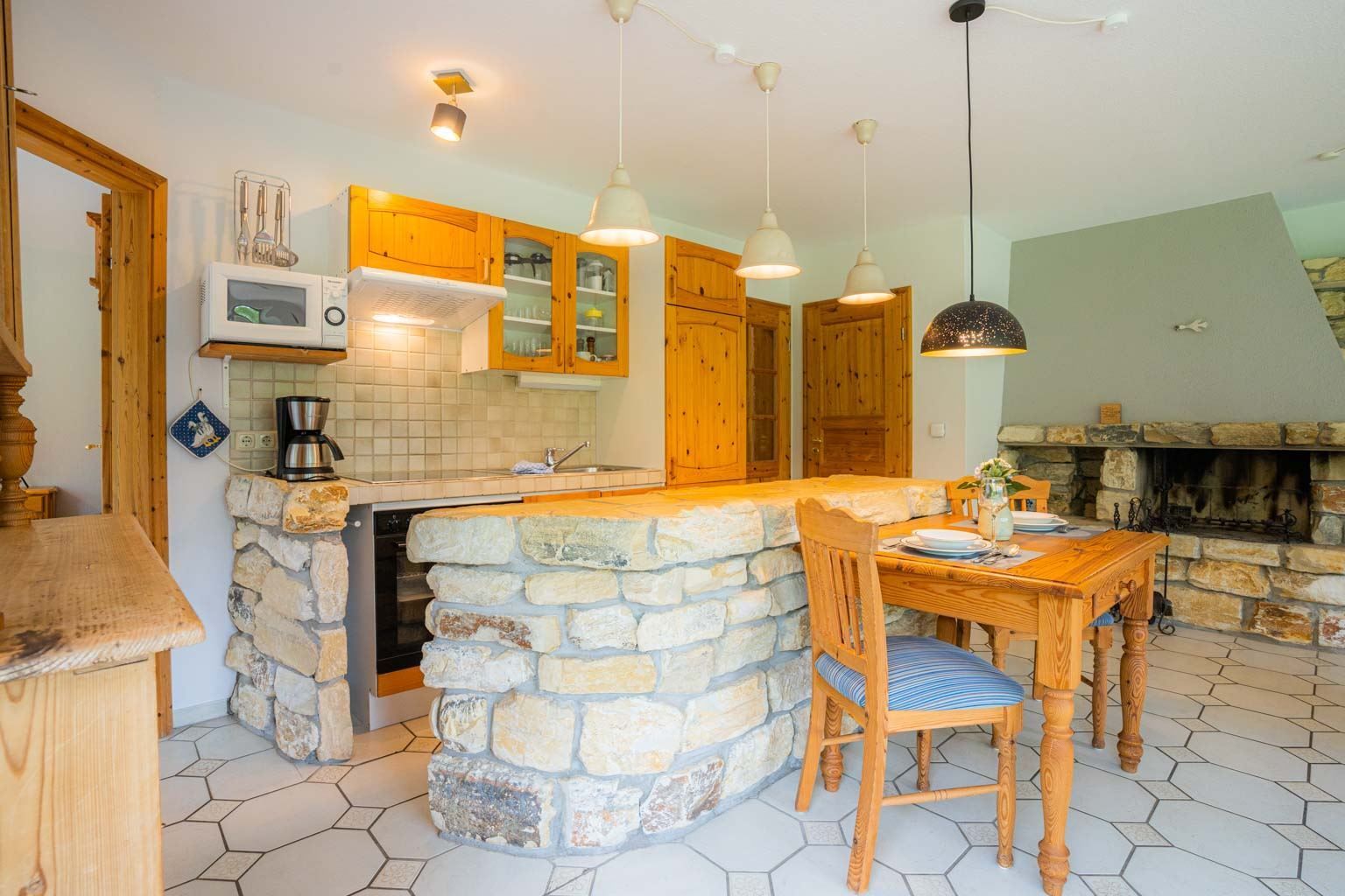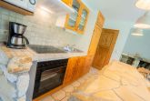 Wohnzimmer mit Sofa (3er), Sessel, gemütlichem Naturstein-Kamin, TV (Kabel), Stereo-Kompaktanlage und Esstisch mit 3 Stühlen. Offene Küche mit Backofen, Mikrowelle und Kühlschrank mit Gefrierfach. Abstellraum mit Staubsauger. Direkter Zugang zur möblierten Gartenterrasse nach Süden.