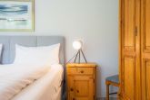 Schlafzimmer mit Doppelbett (180x200cm, Boxspring), Kleiderschrank und Stuhl.
