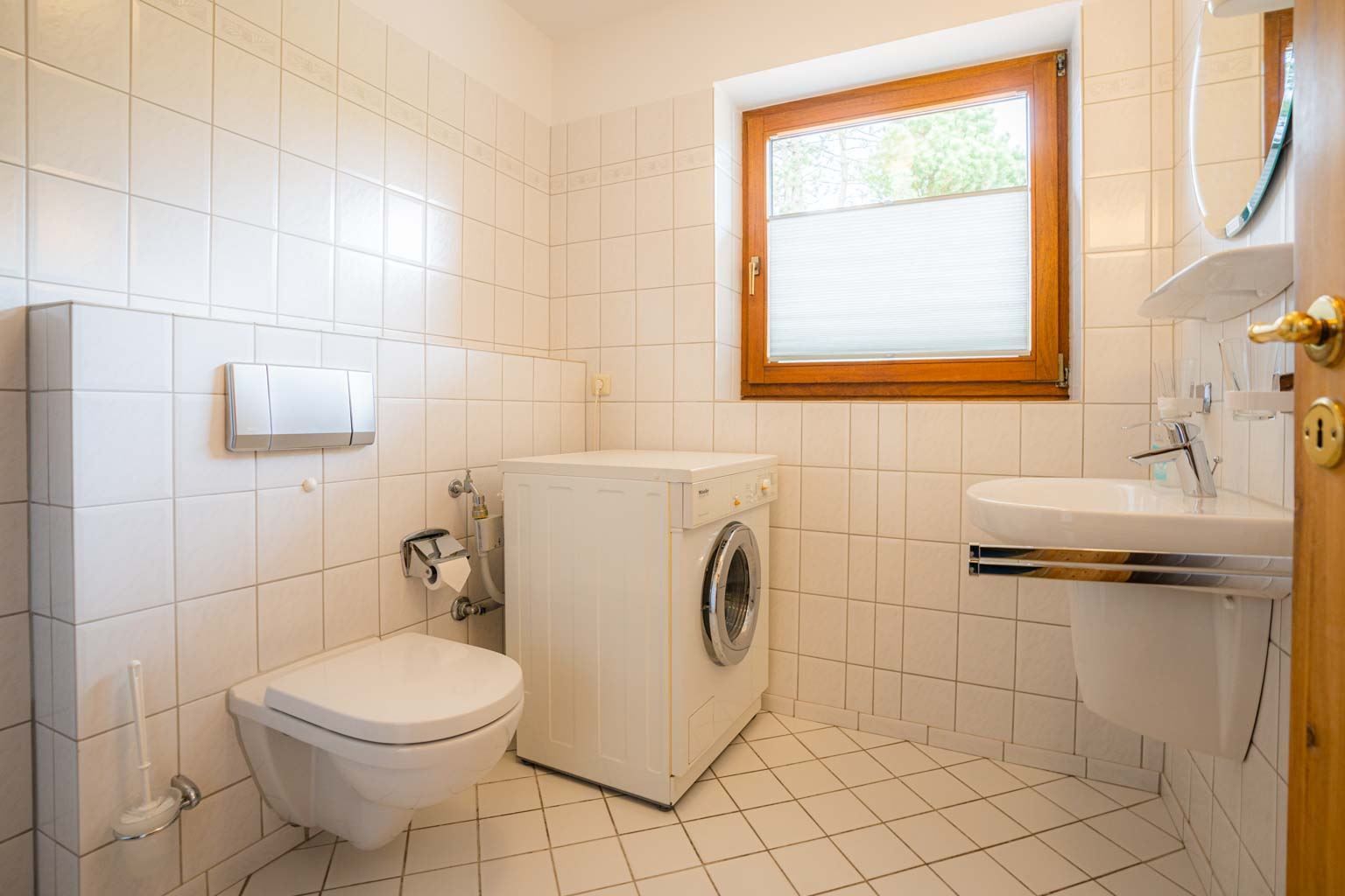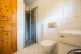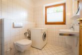 Badezimmer (Duschbad) mit bodengleicher Dusche, WC, Tageslicht und Waschmaschine.