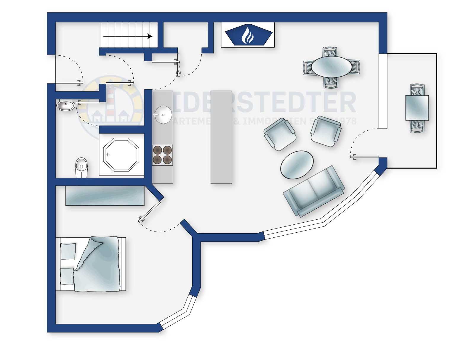 Komfortable 2-Zimmer-Ferienwohnungunter Reet im Haus Jan Mayen mit ca. 63 m² auf 1 Ebene (EG) für bis zu 2 Personen. In ruhiger Lage im Ortsteil Böhl in St. Peter-Ording. Hochwertig eingerichtetes Domizil mit behaglichem Kamin. Hunde sind herzlich willkommen.