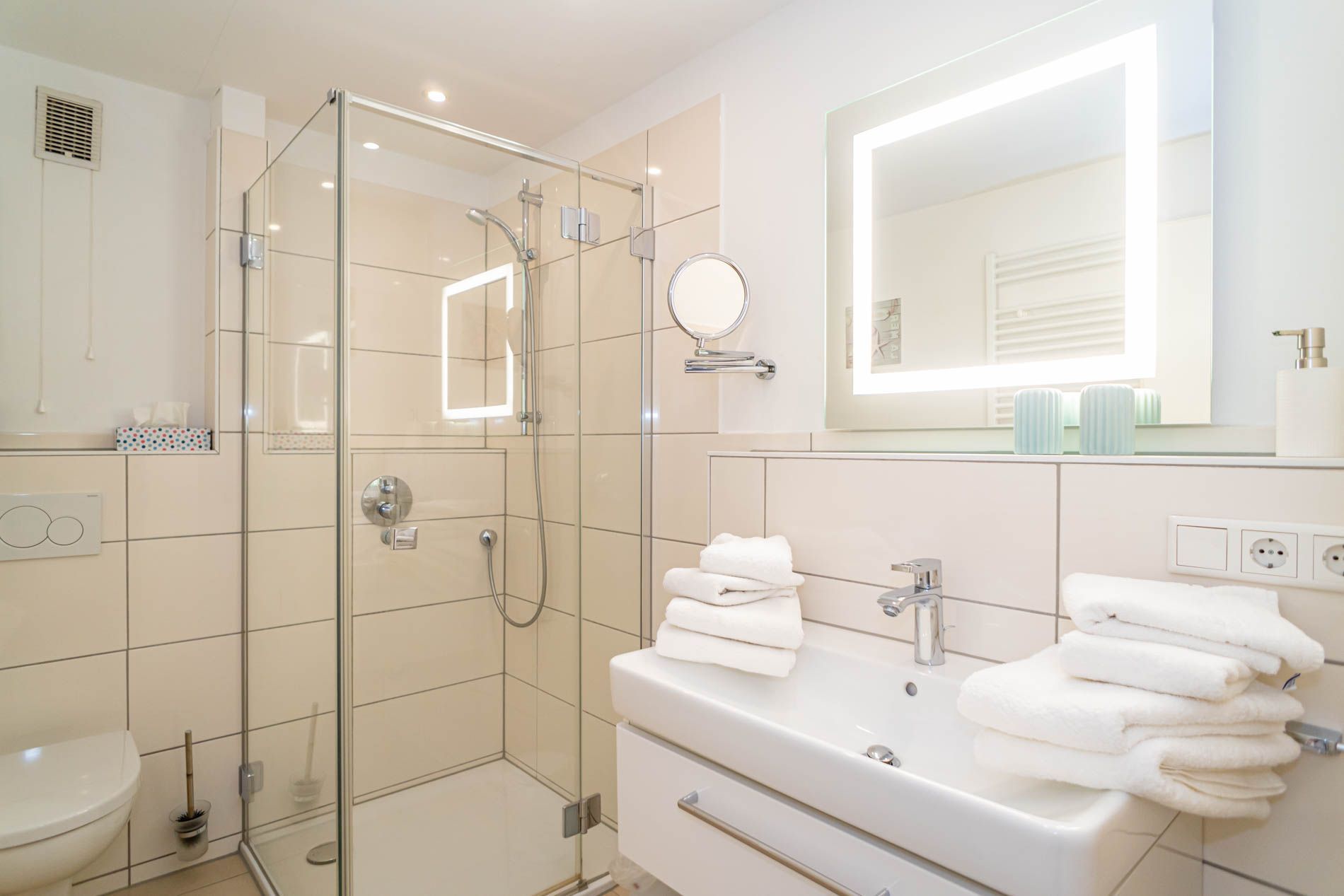 Im modernen Bad befinden sich eine Dusche mit niedrigem Einstieg, ein WC, ein Waschtisch, ein Handtuchtrockner und ein Kosmetikspiegel.