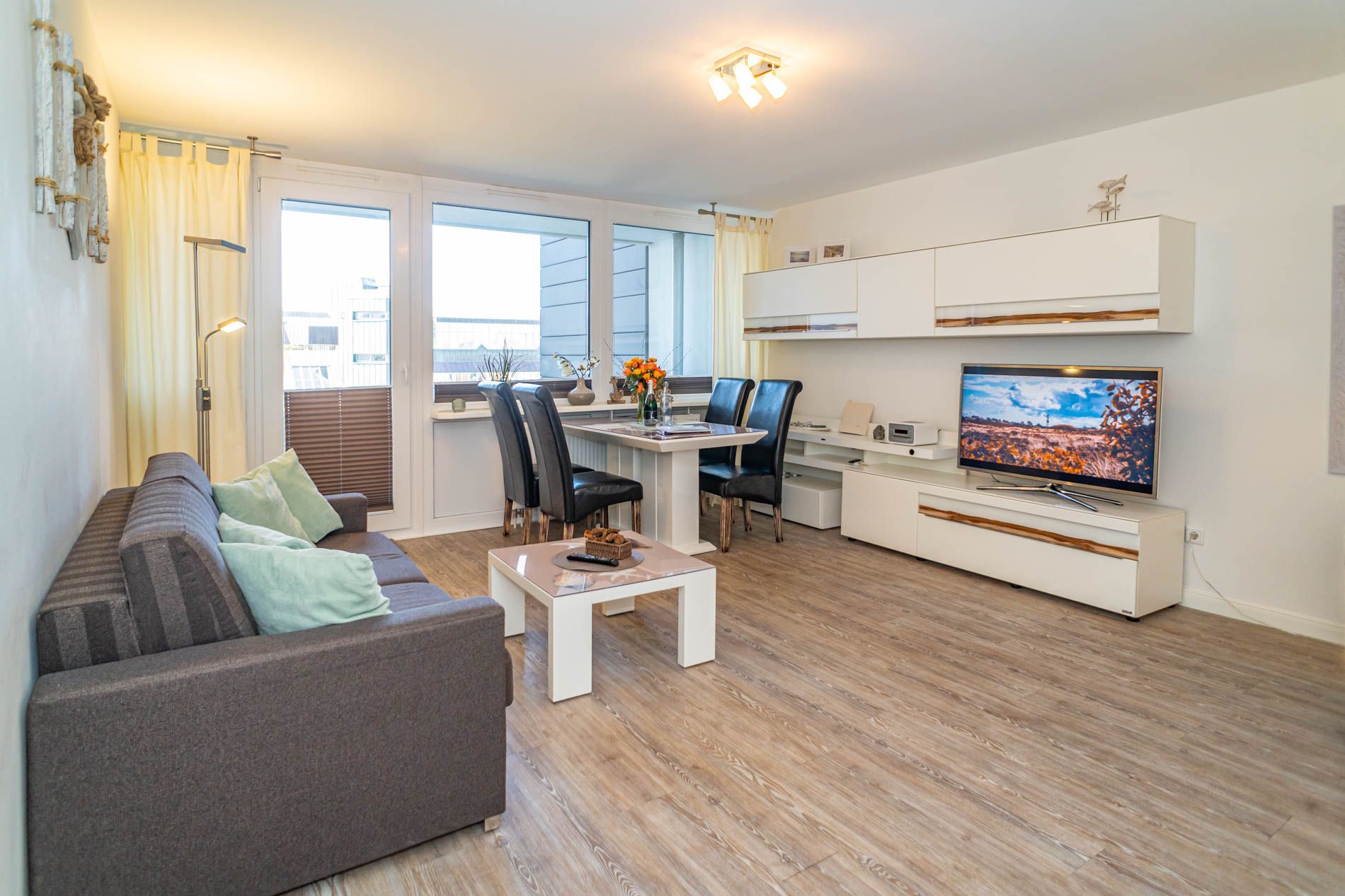 Hochwertig und modern eingerichtete 2-Zimmer-Nichtraucher-Ferienwohnung (ca. 59 qm) in der 2. Etage zur Seeseite mit Westloggia (Nachmittagssonne, mit Balkonmöbeln und Auflagen) für max. 4 Personen.