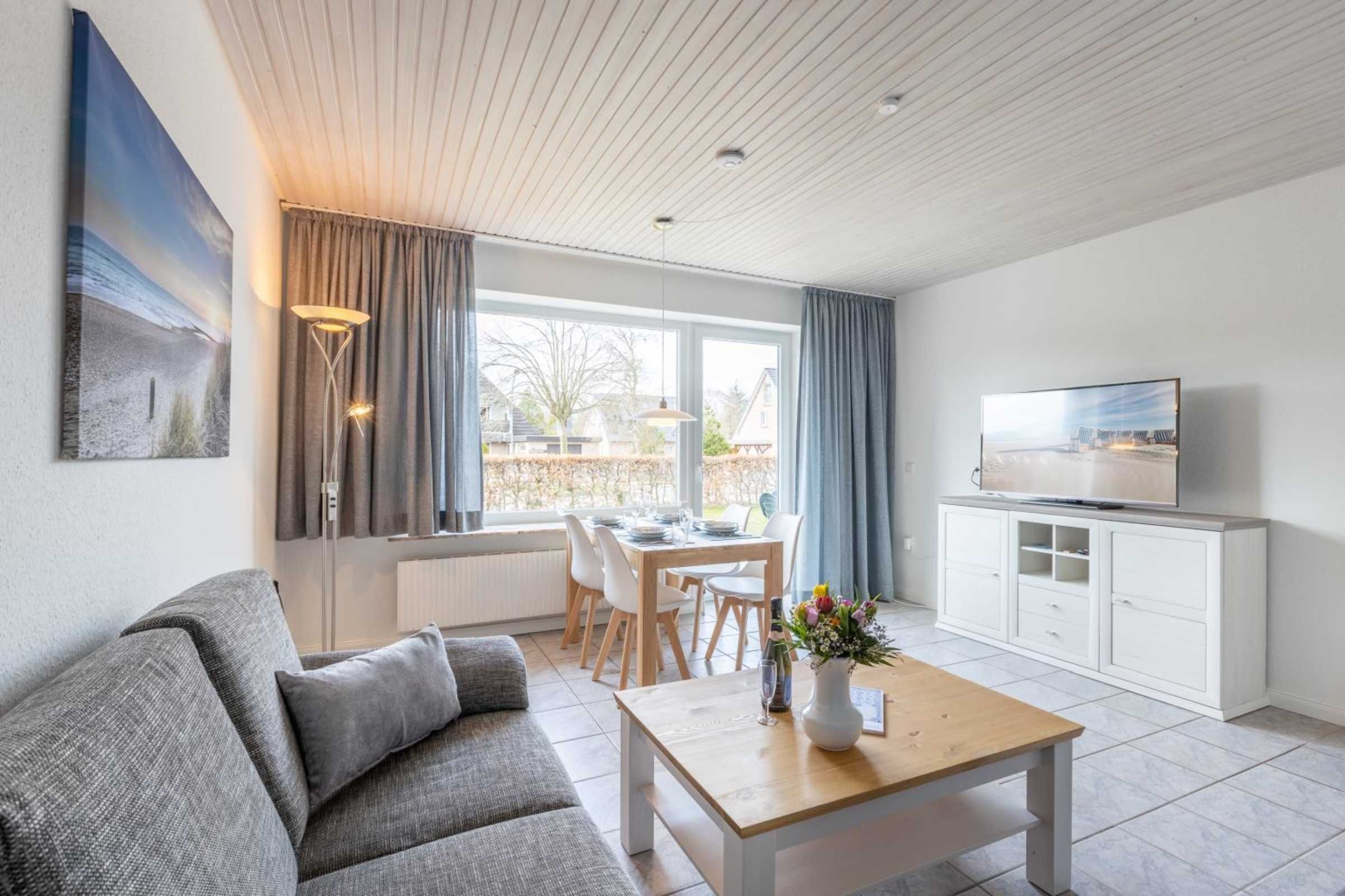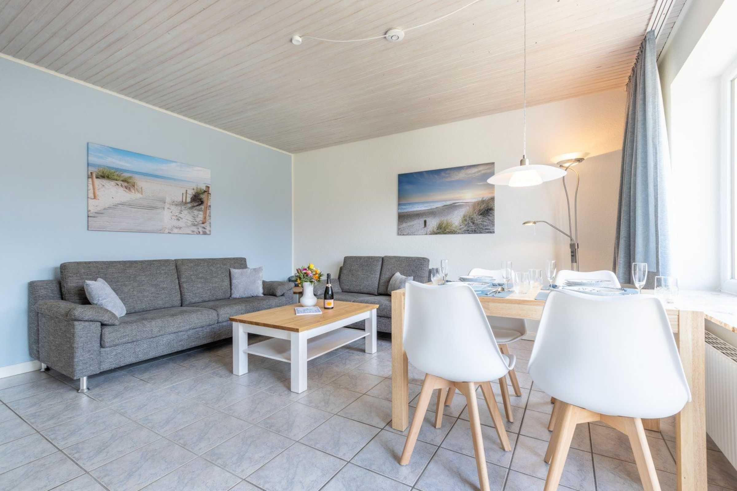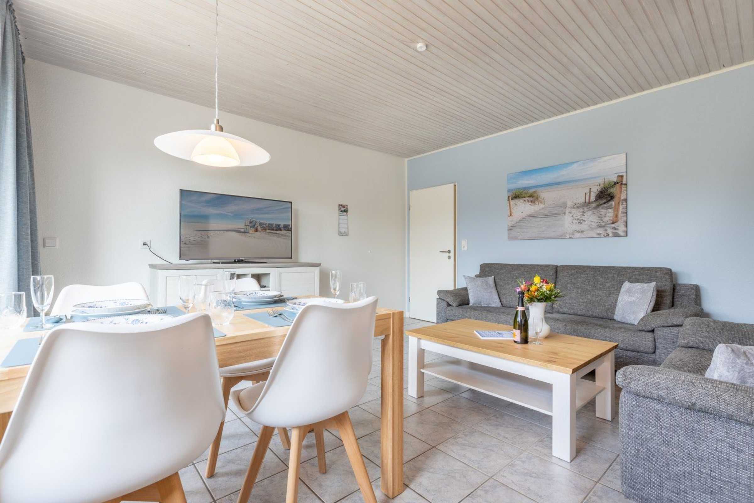 Wohnzimmer mit 2 Sofas (3er und 2er), großem SMART-TV (Sat), Radio, Esstisch für 4 Personen und direktem Zugang zur Südterrasse.