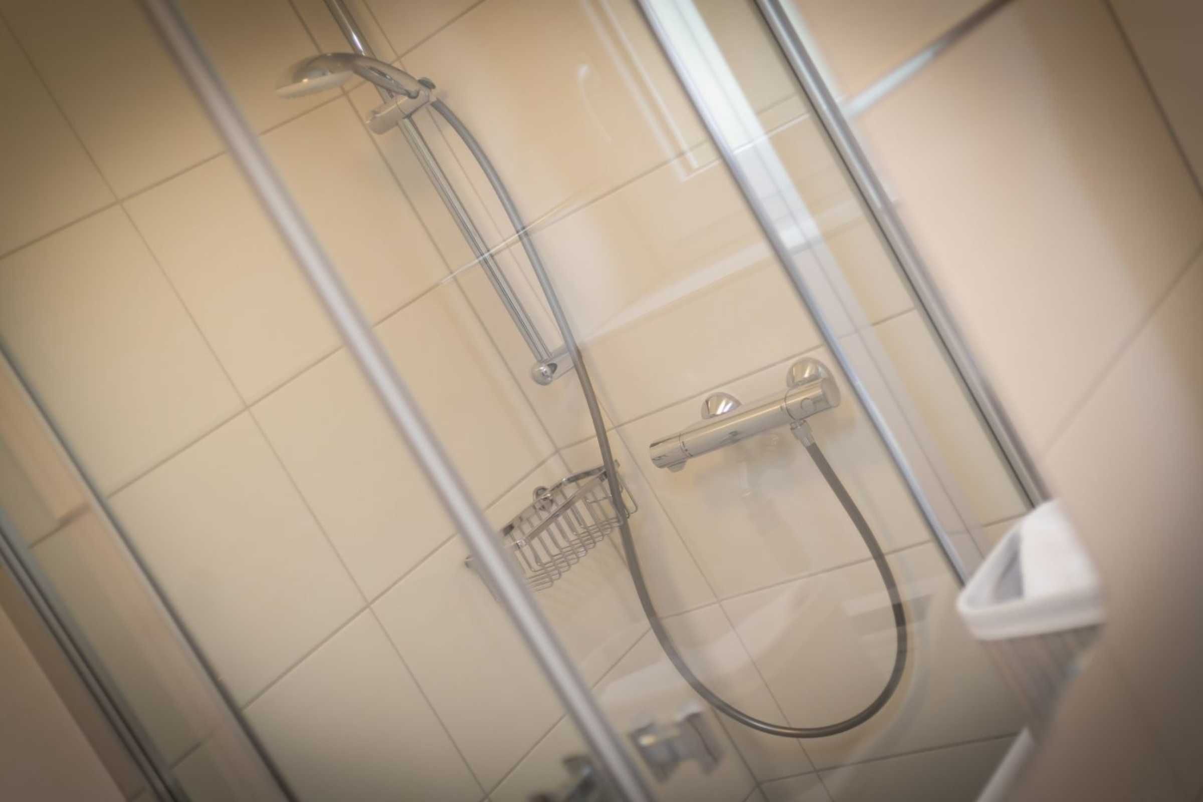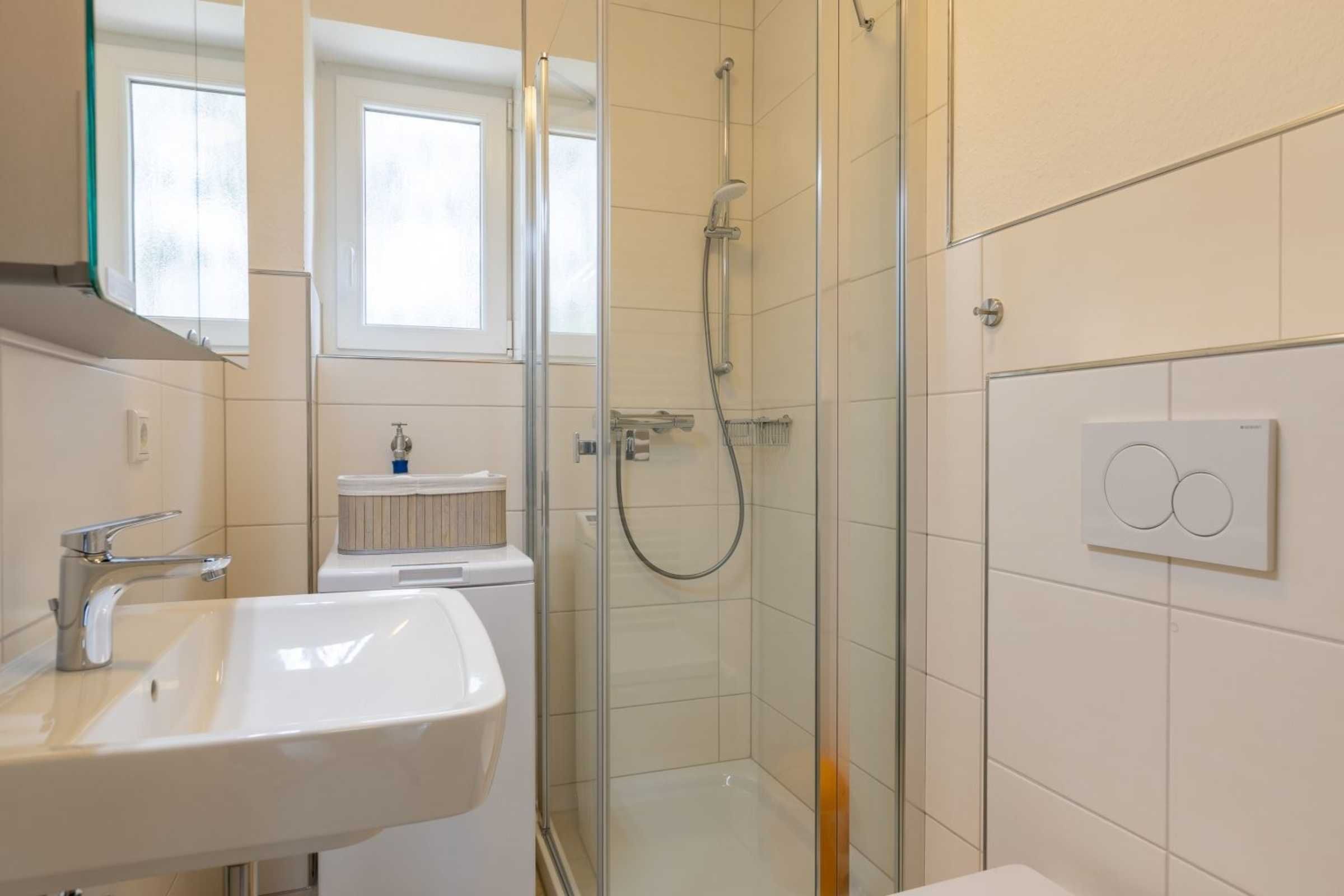 Badezimmer (Duschbad) mit Dusche, WC, Waschmaschine, Handtuchwärmer und Tageslicht.