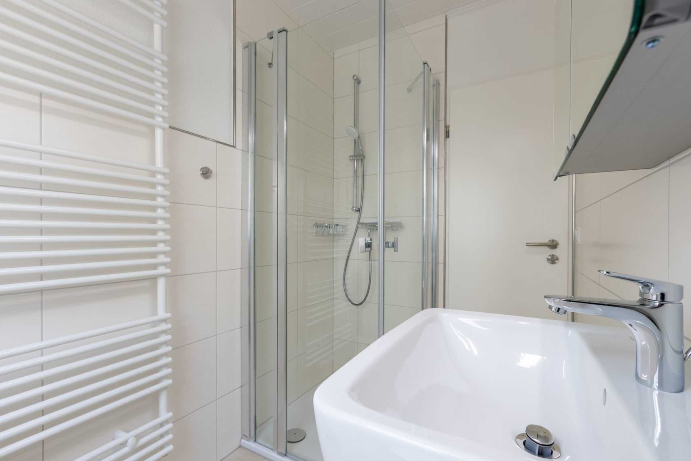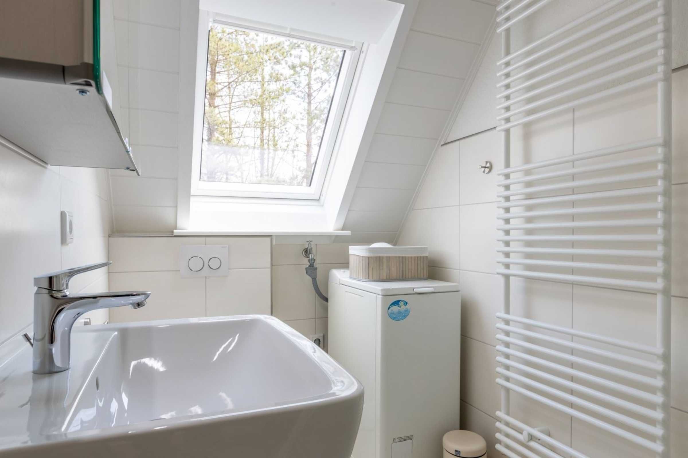 Badezimmer (Duschbad) mit Dusche, WC, Waschmaschine, Handtuchwärmer und Tageslicht.