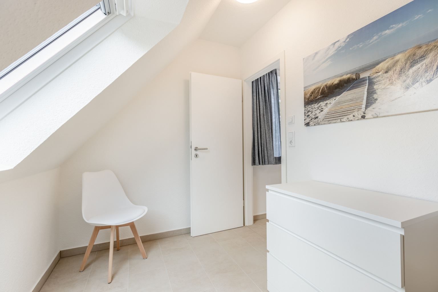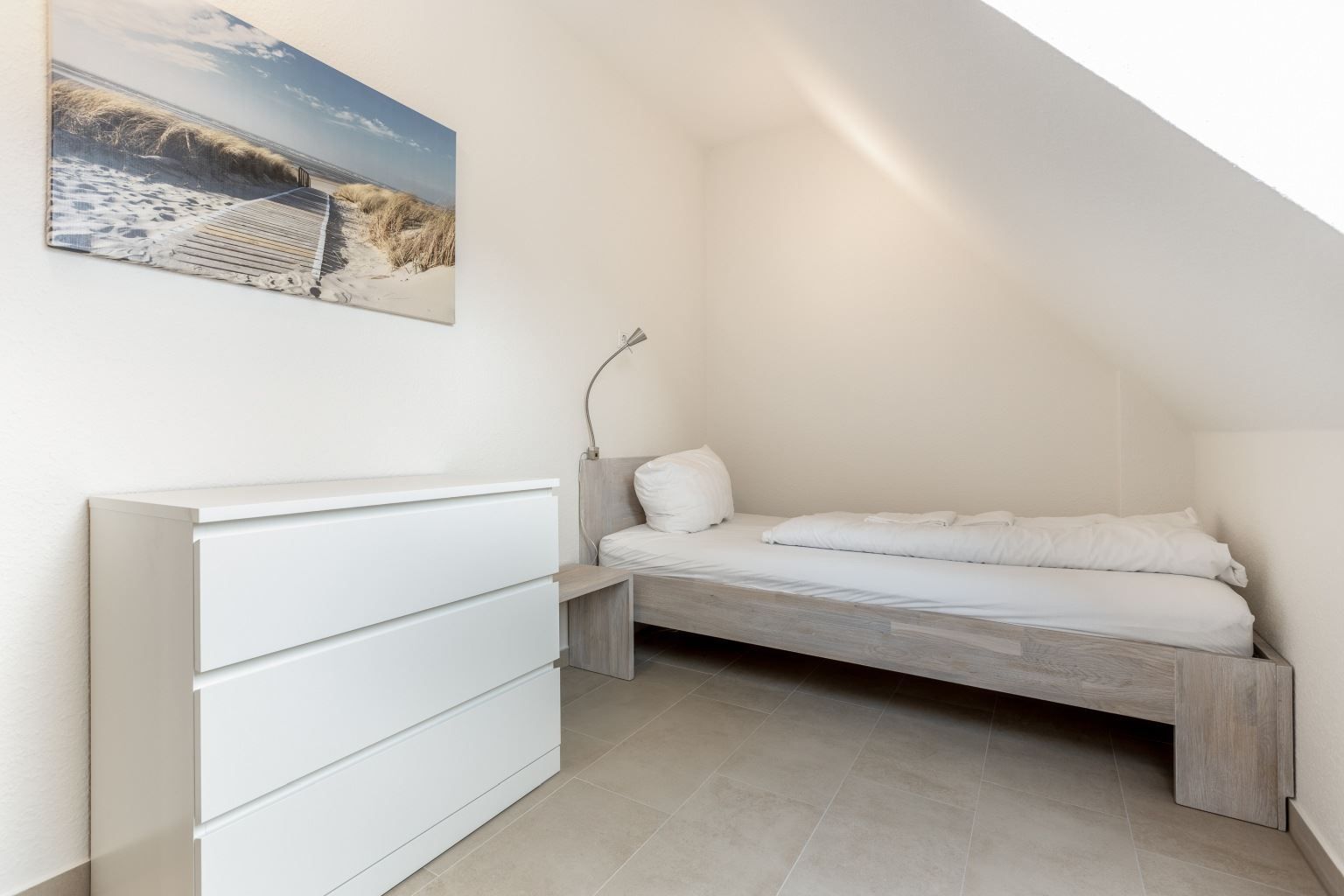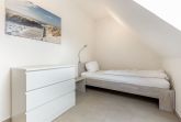 2. Schlafzimmer mit Einzelbett (90x200cm), einem Stuhl und einer Kommode. Zugang durch das 1. Schlafzimmer (befangen).