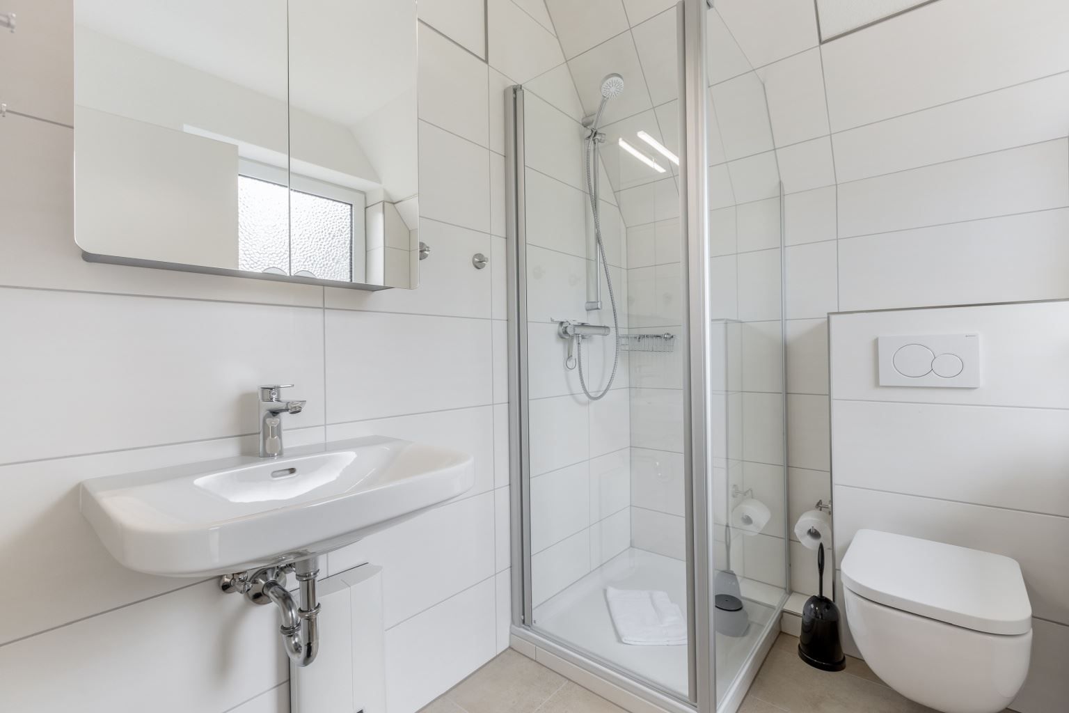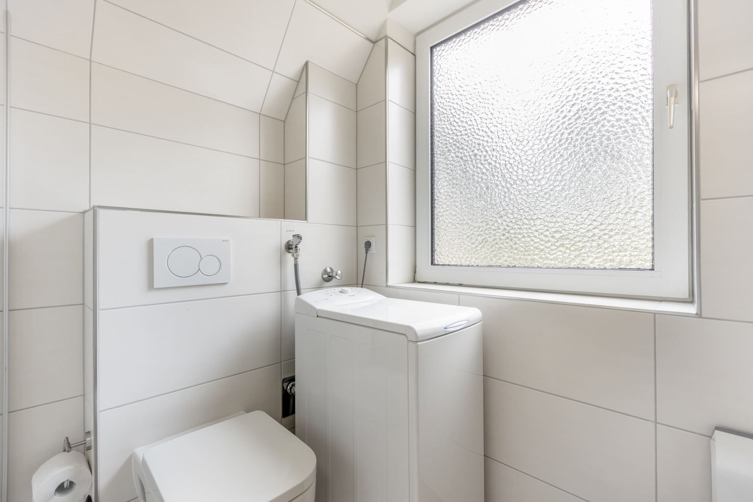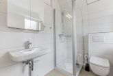Badezimmer (Duschbad) mit Dusche (ca. 70x85cm), WC, Waschmaschine (Toploader), Heizlüfter, Föhn und Tageslicht.
